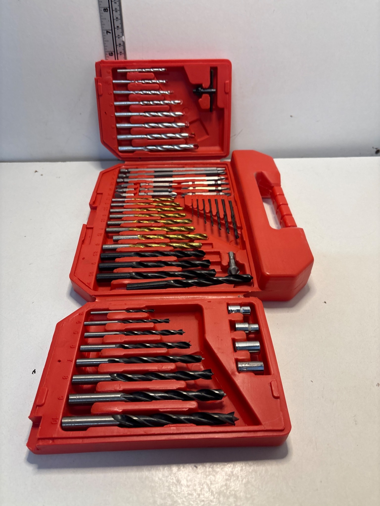 Drill bit set with multiple sizes in a red plastic case.