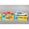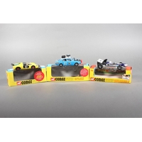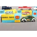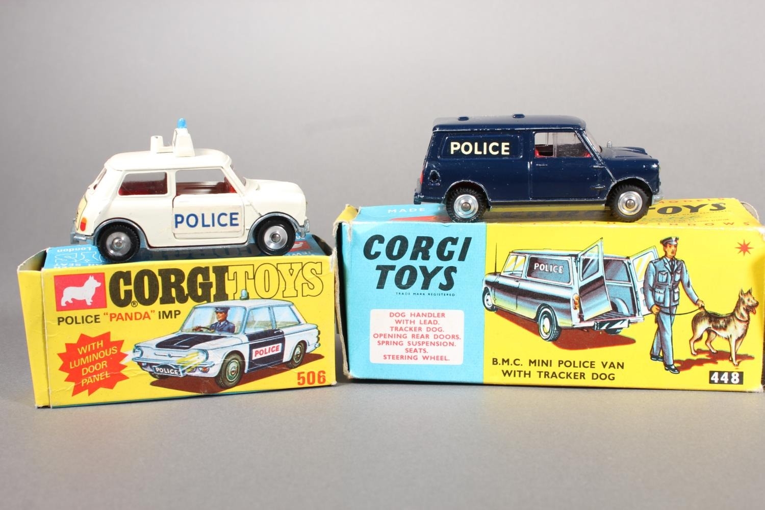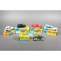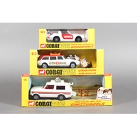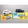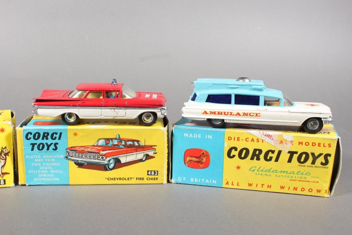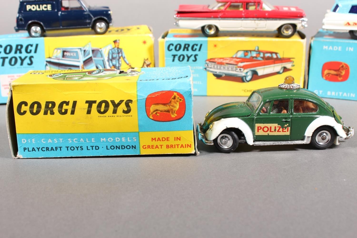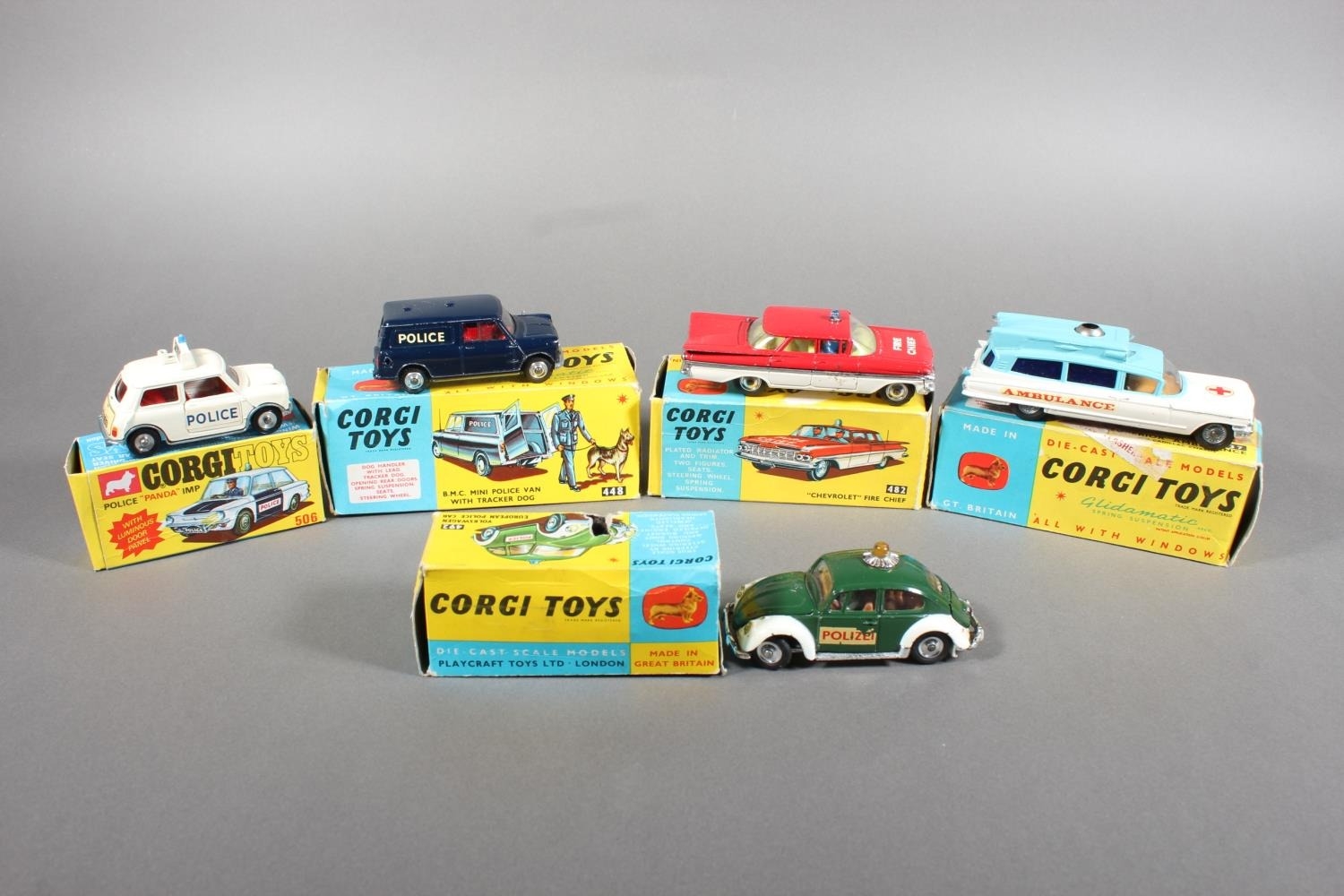 Corgi Toys diecast model vehicles to include 437 Superior Ambulance on Cadillac Chassis, 448 BMC Mini Police Van, 492 Volkswagen European Police Car, 506 Police Panda Imp and 482 Chevrolet Fire Chief, each boxed. (5)