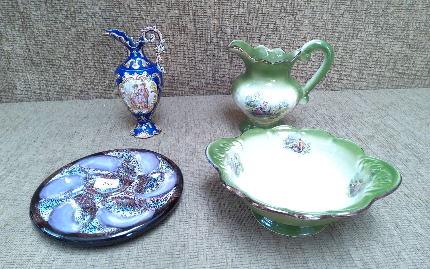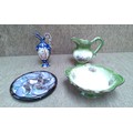 Ceramic Staffordshire jug and bowl set hand painted, majolica Jug, and ceramic oyster dish.