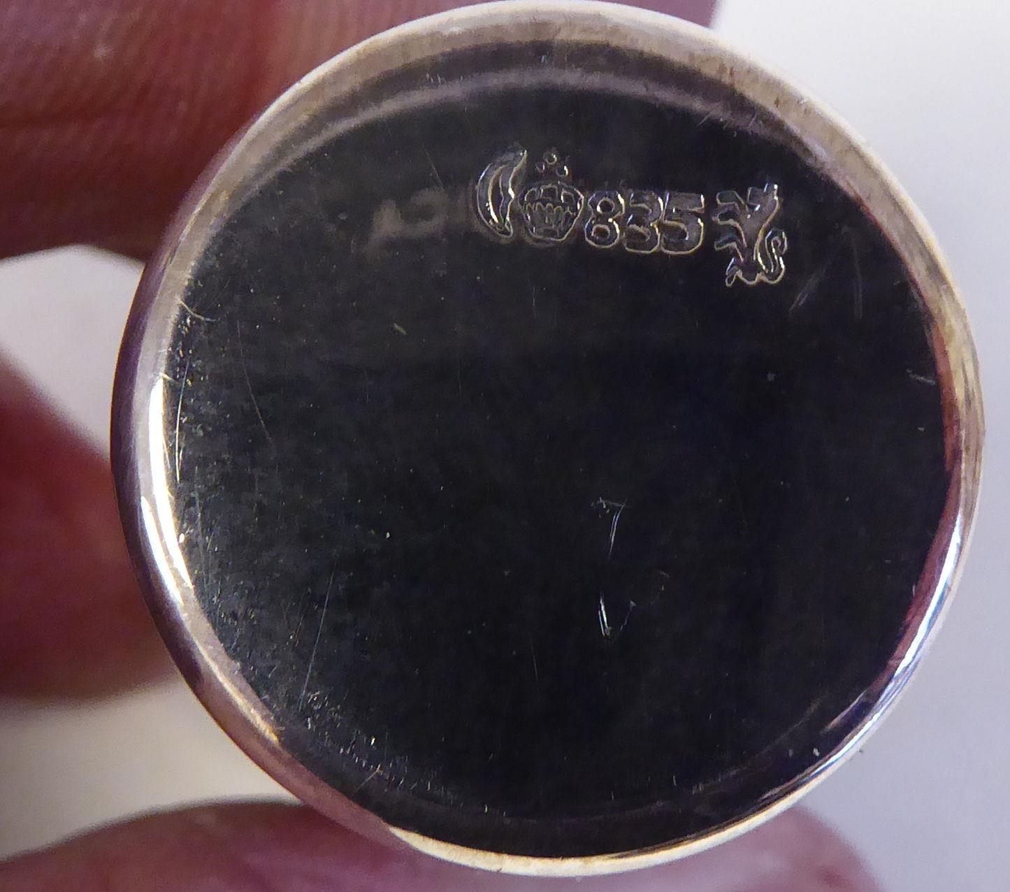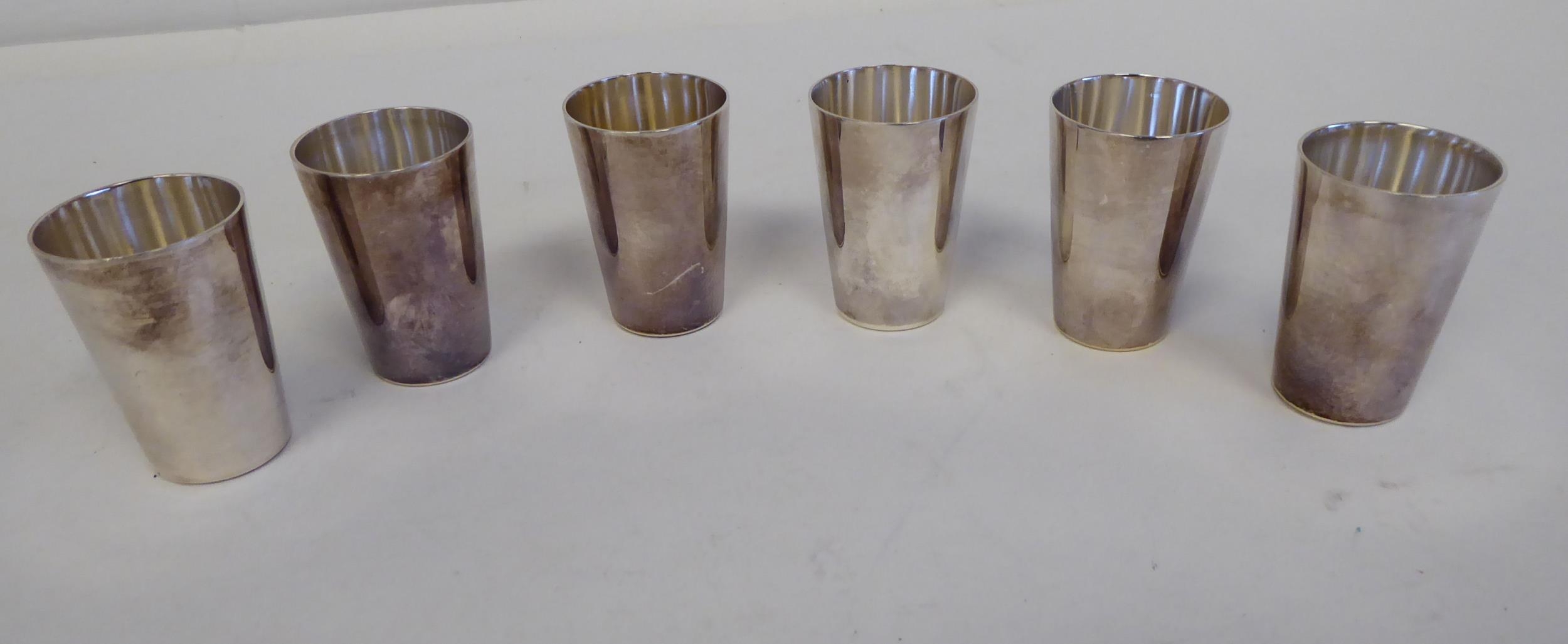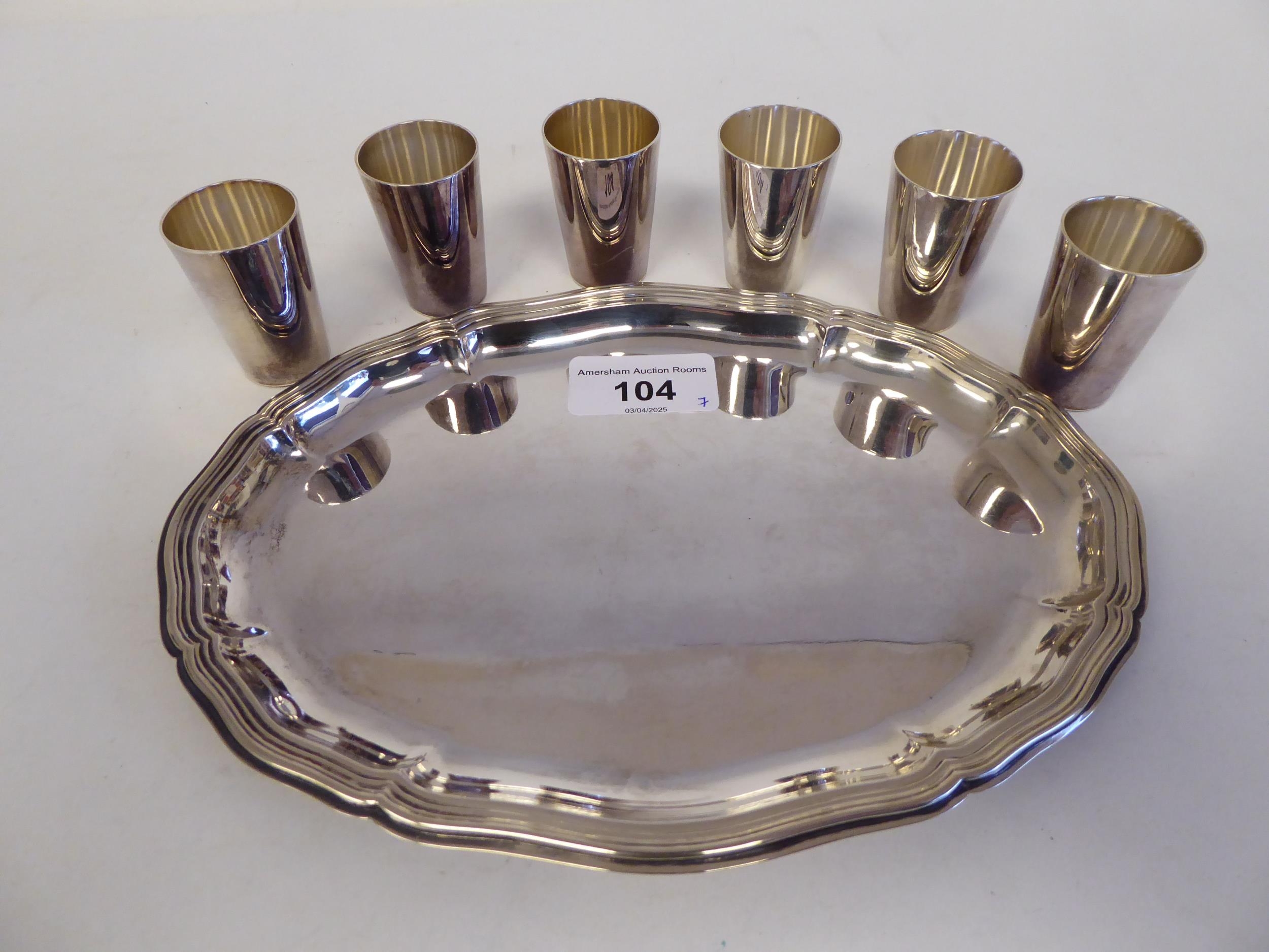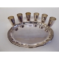 A silver coloured metal liqueur set, comprising six tumbler cups, on an oval, wavy edged tray stamped 835 8.5"w