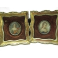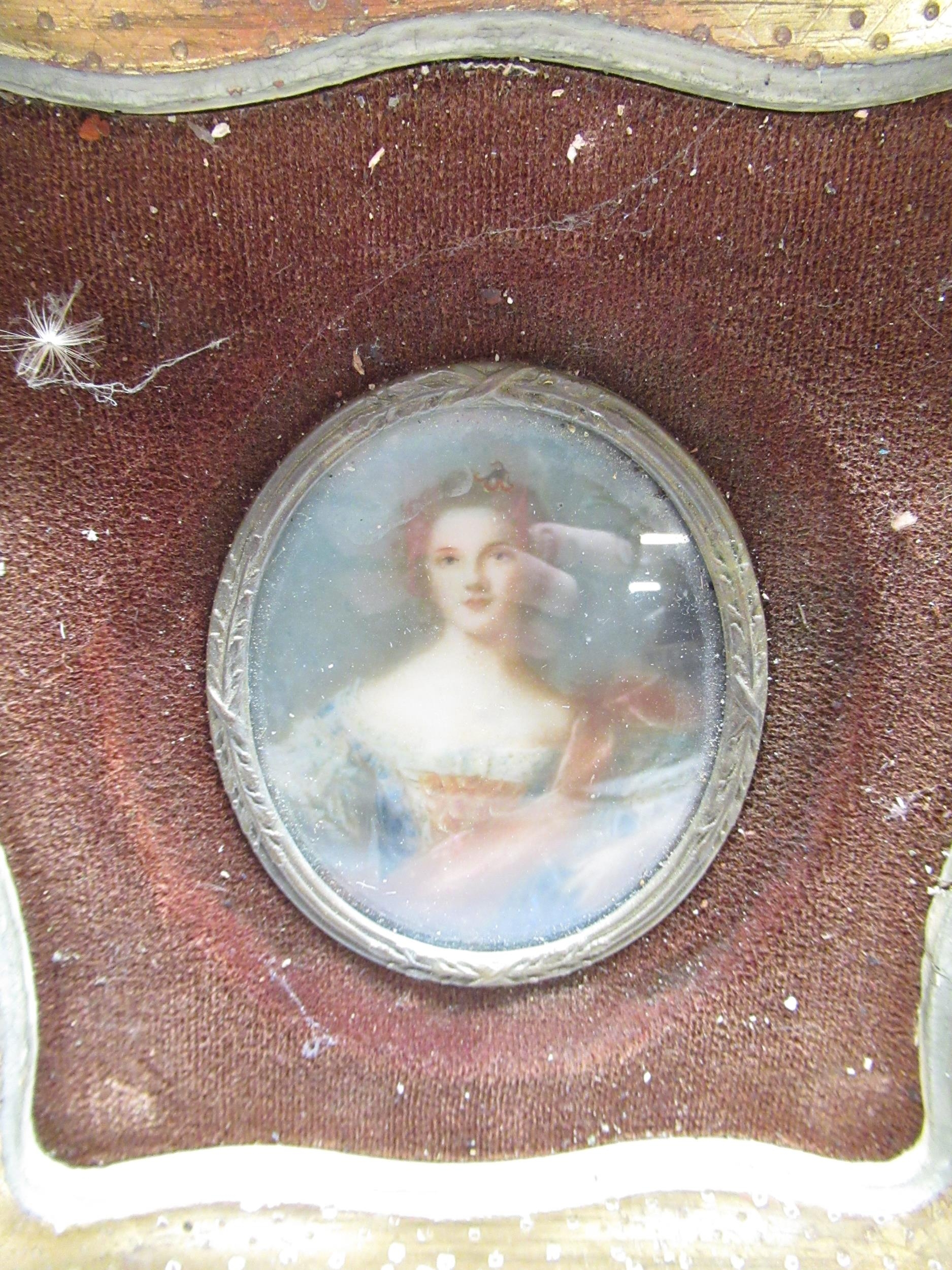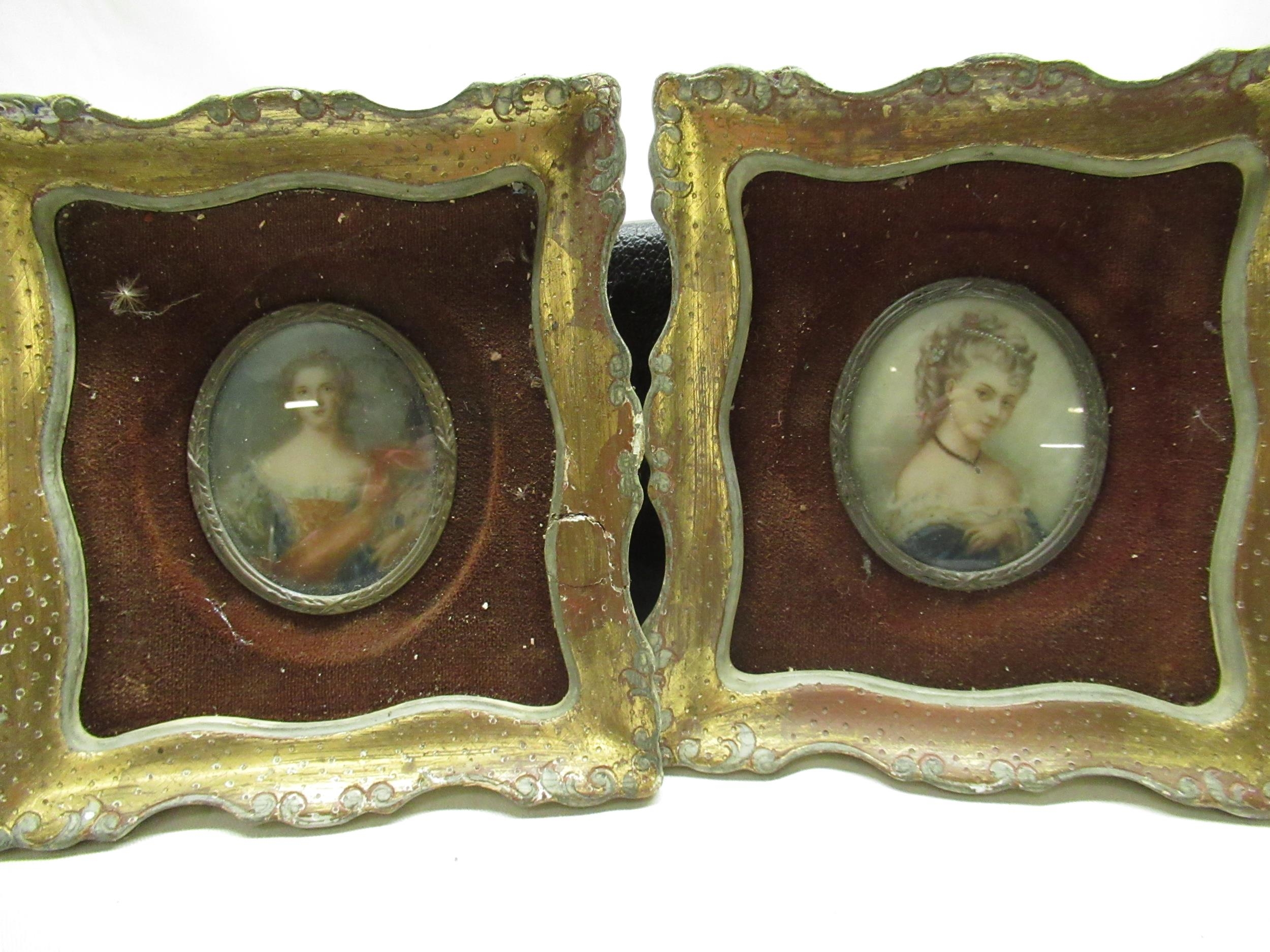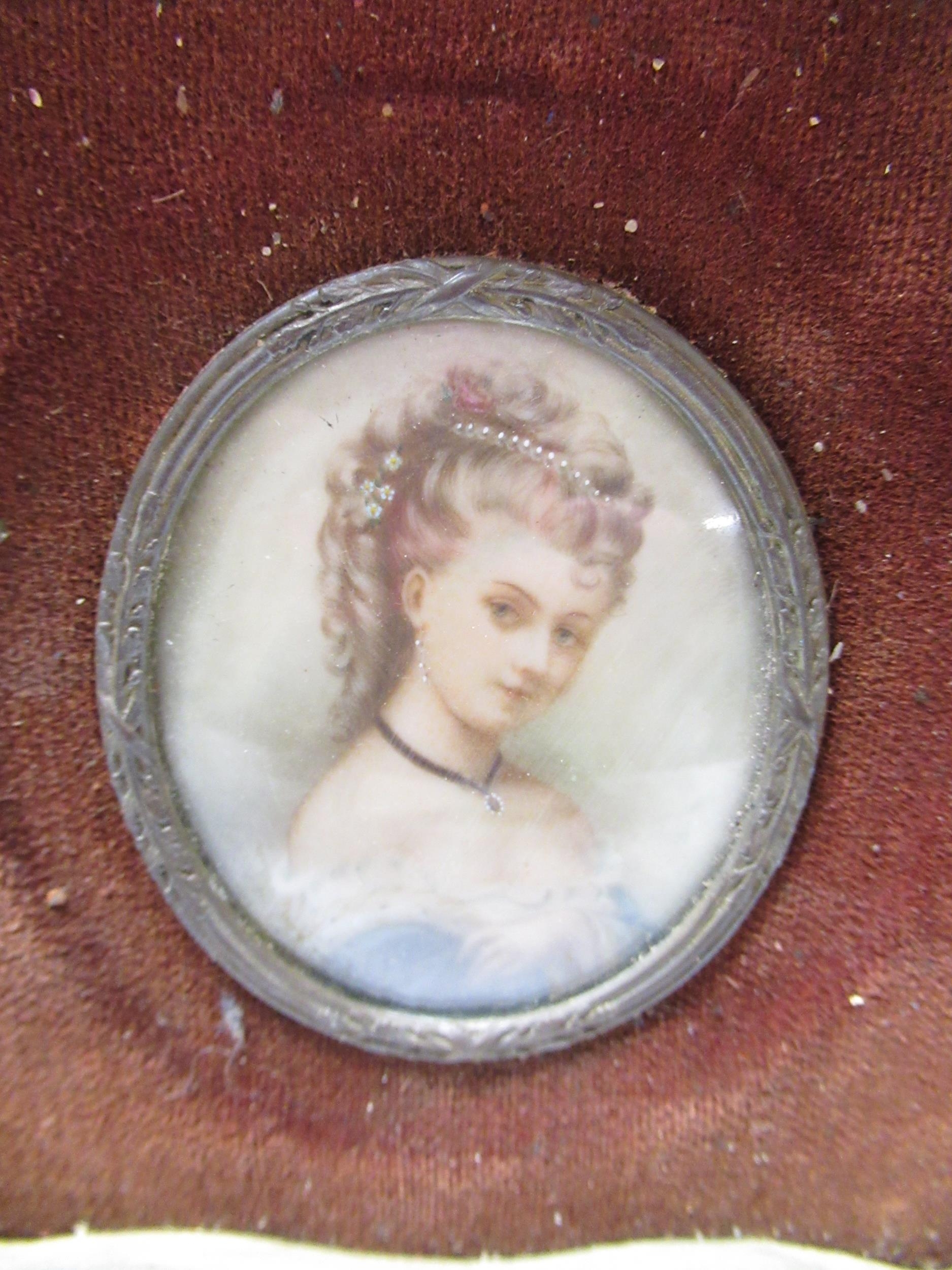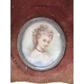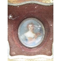 Pair of late C19th hand painted oval portraits in velvet and gilt frames, H5.5cm W7cm