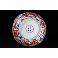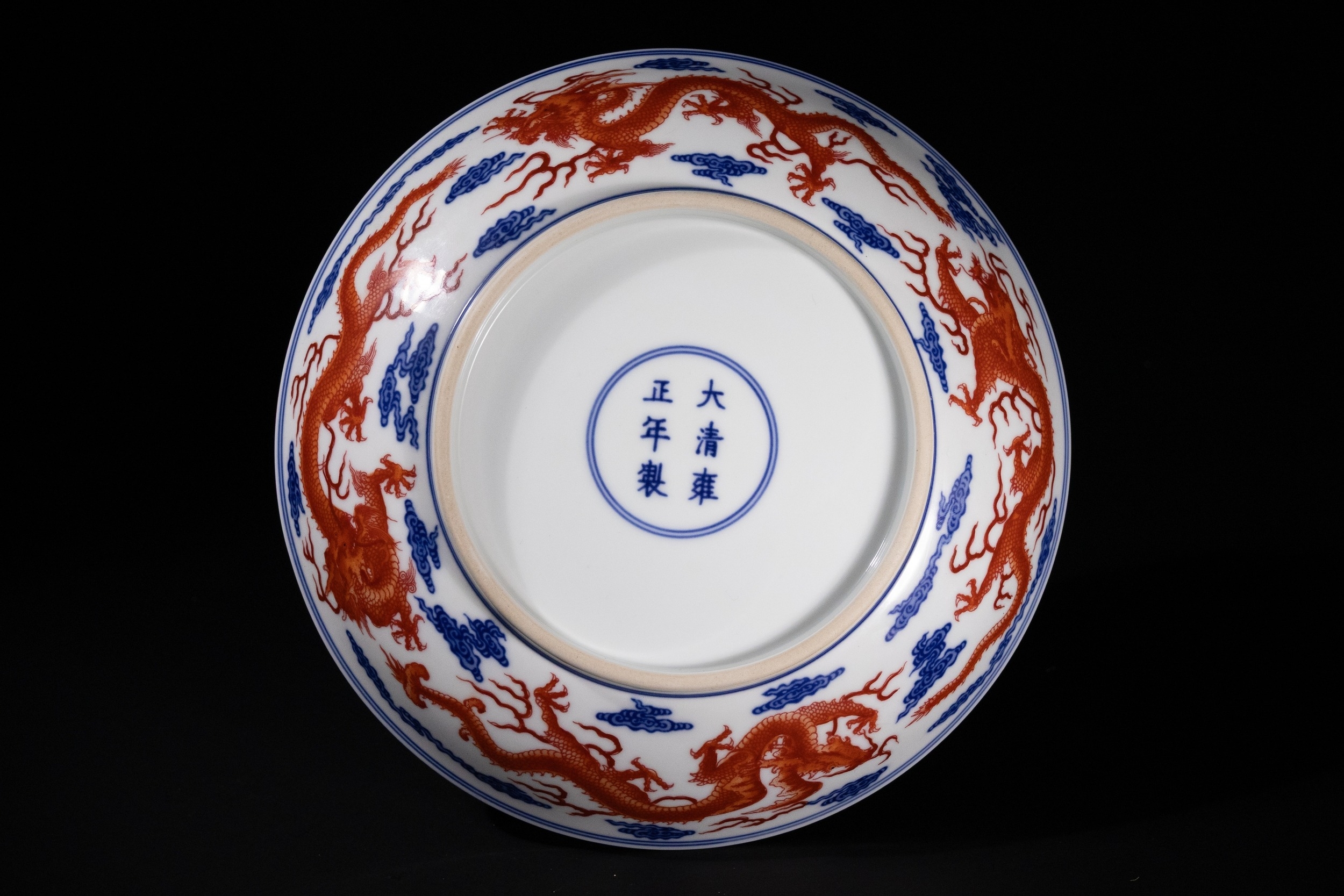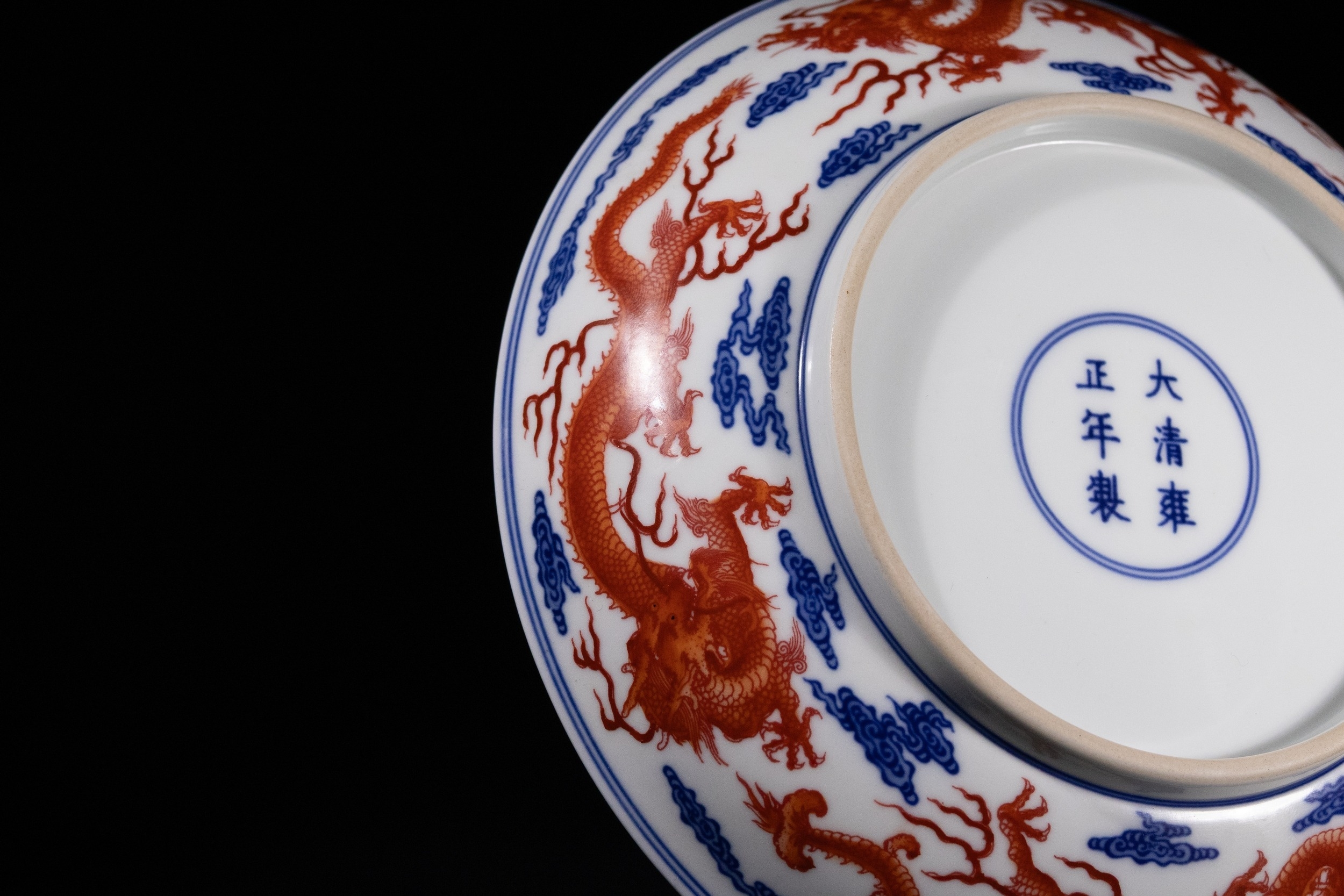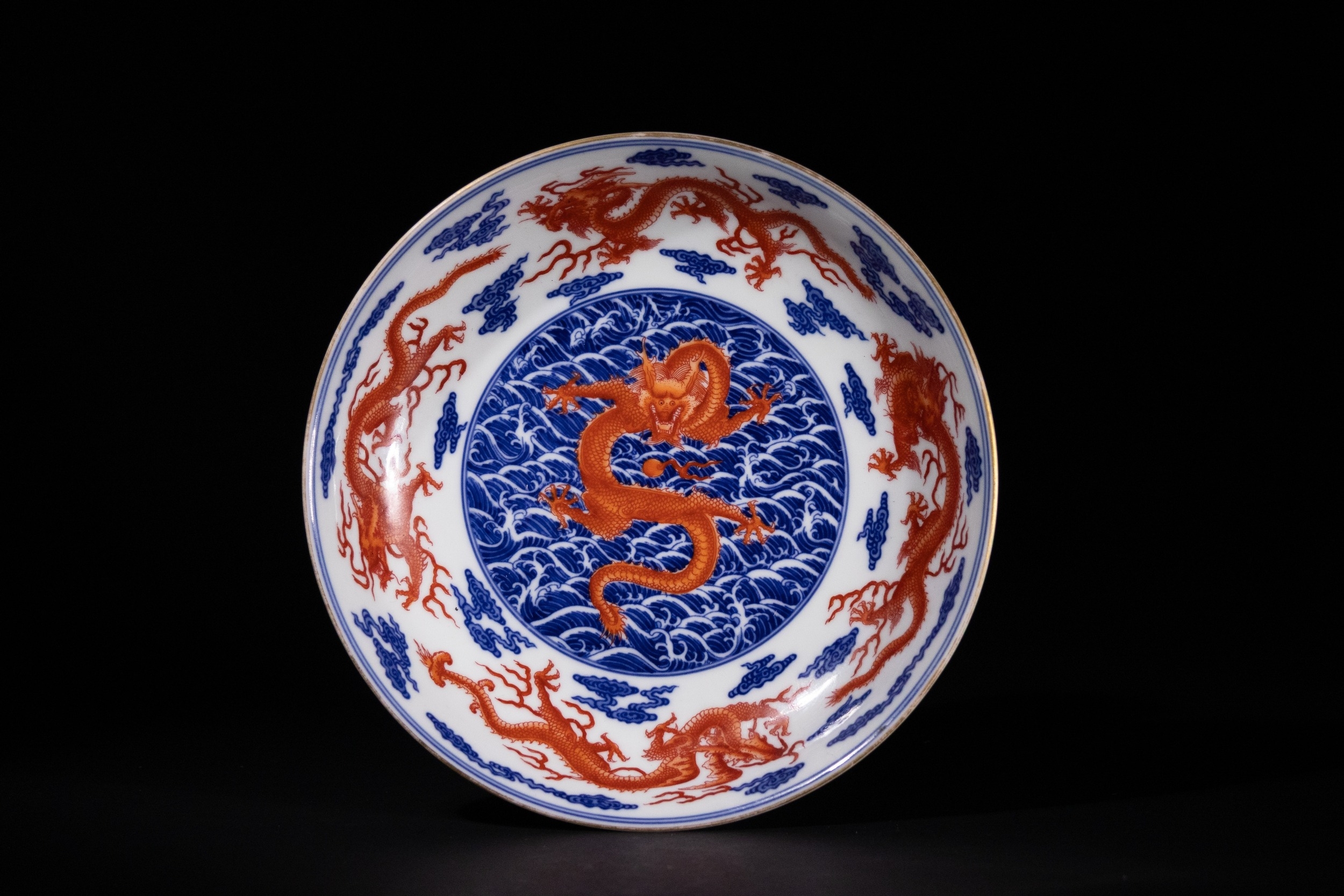 The dish is painted in rich underglaze cobalt blue and overglaze iron-red, featuring a central dragon in pursuit of a flaming pearl, set against a dense wave ground. The cavetto is encircled with five further iron-red dragons amidst swirling blue clouds, the energetic composition continuing onto the exterior. The base bears a six-character Da Qing Zhengde nian zhi (Great Qing Zhengde period make) mark enclosed within double circles, The base bears a six-character Kangxi mark enclosed within double circles, possibly indicating the period or origin of the piece.