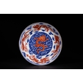 A Chinese Blue and White Porcelain Dish with Iron-Red Dragons, Qing Dynasty Mark.
