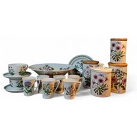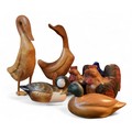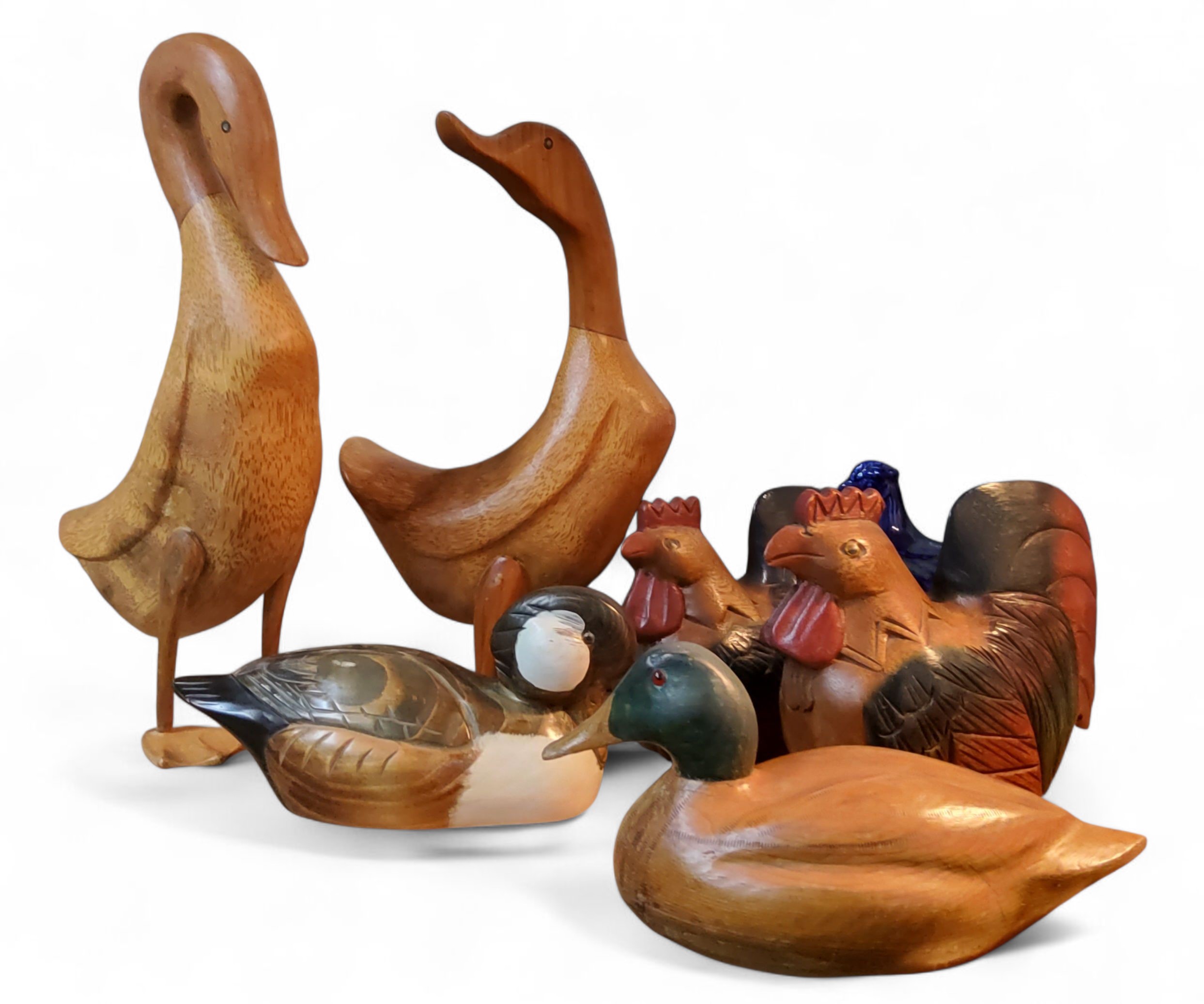 Two Doule wooden geese, 42cm high; wooden ducks; two chickens (6)