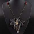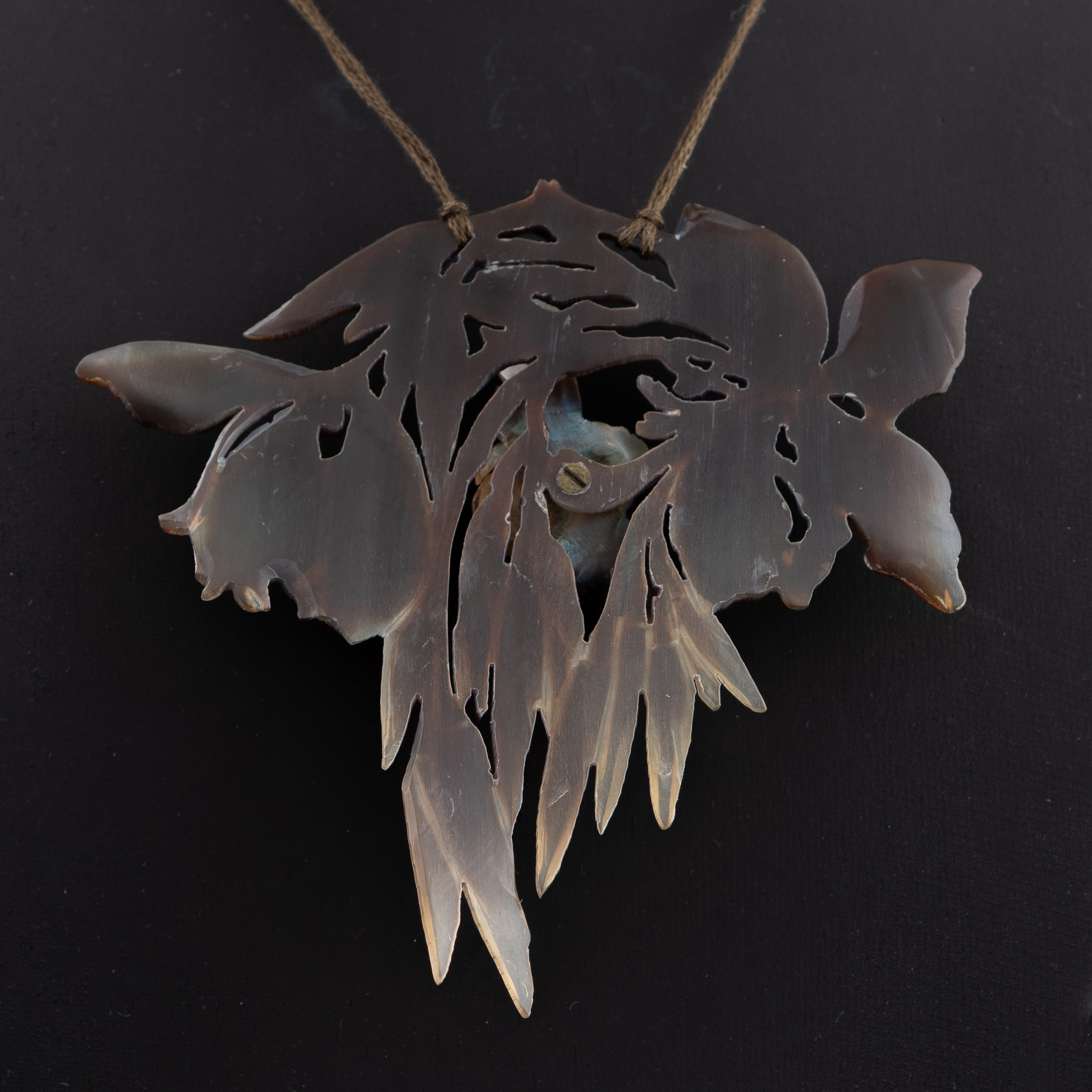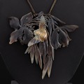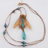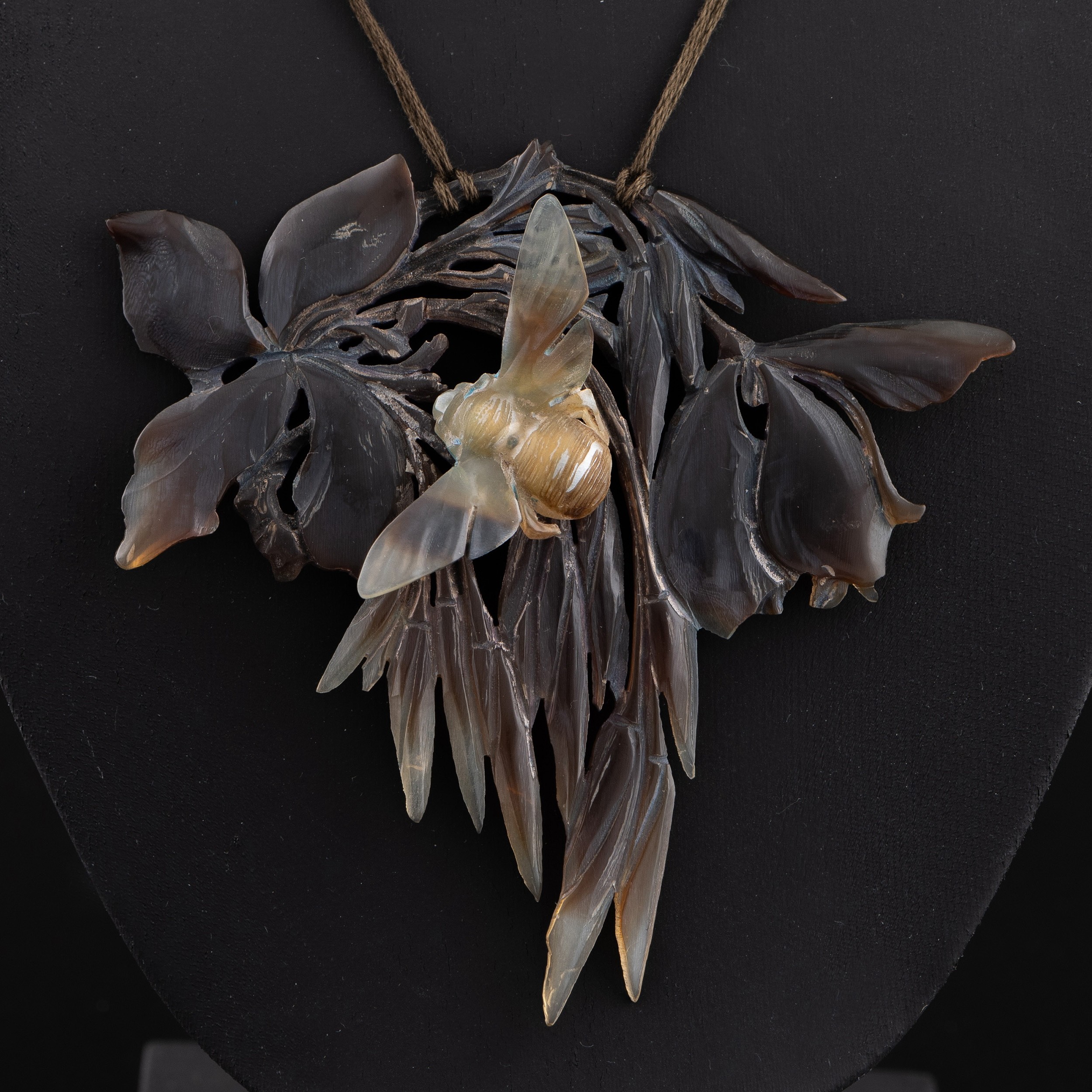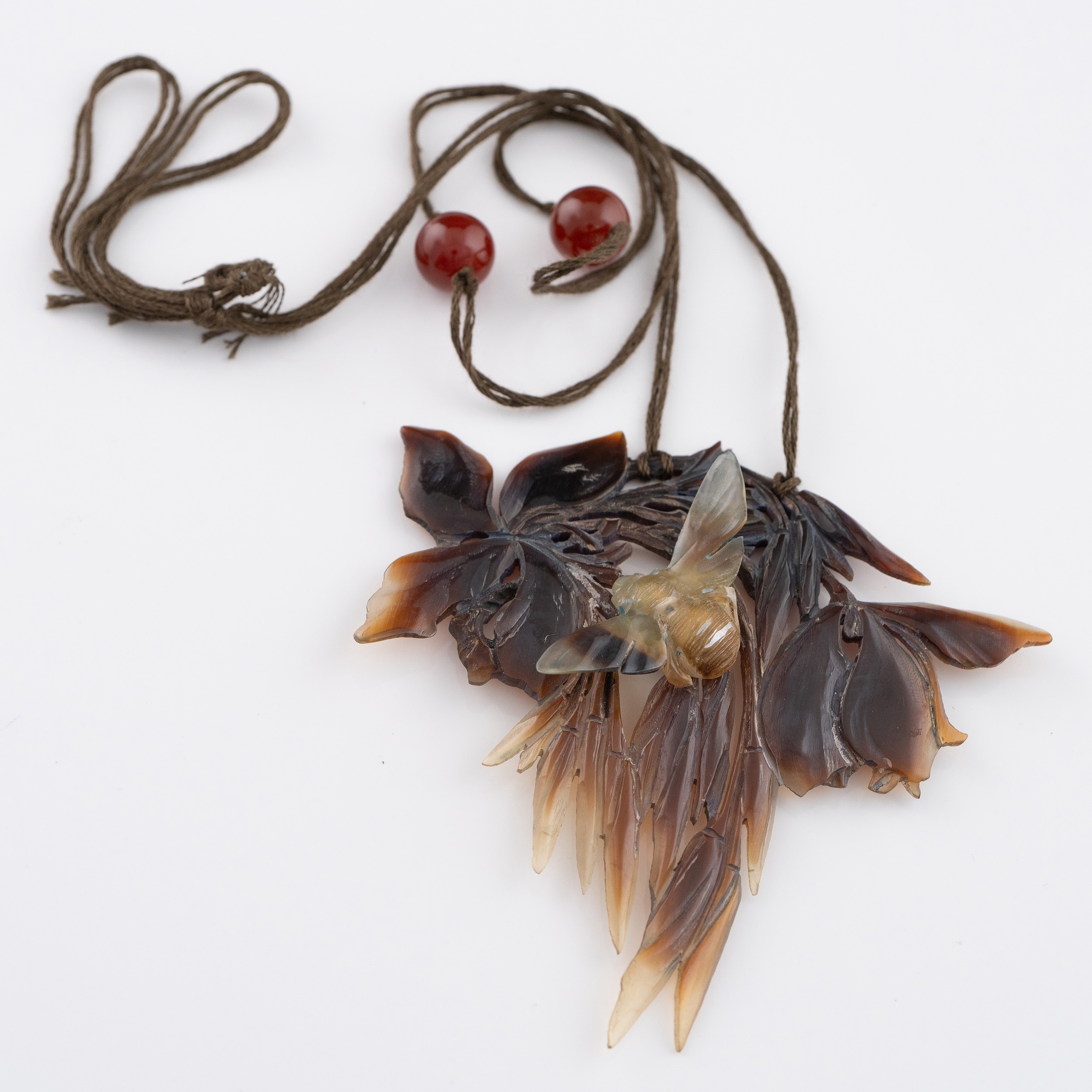 An early 20thC French Art Nouveau carved horn pendant, probably by Elizabeth Bonté, modelled as a winged insect (bee?) with flowers, suspended on a silk cord with two amber glass beads, 10cm width, 9cm height(LDC14834)