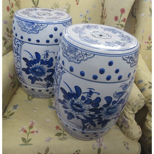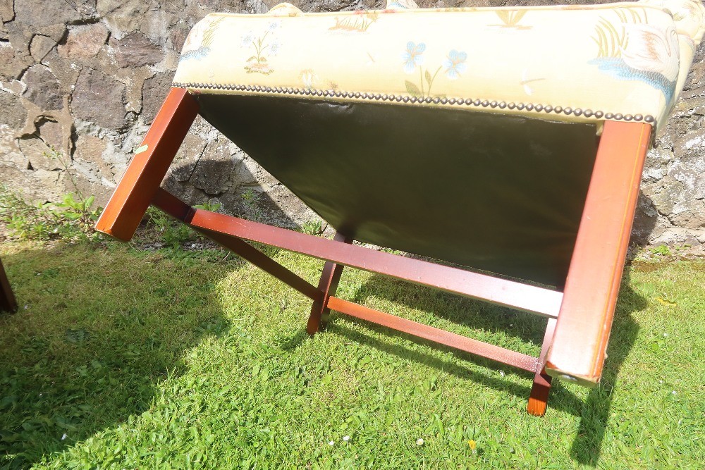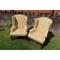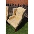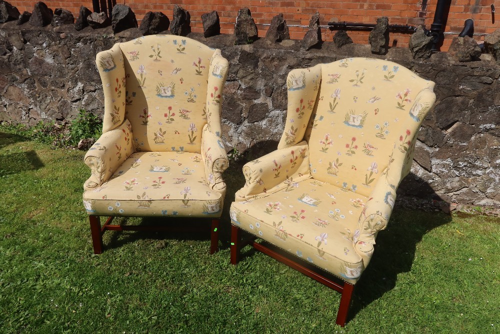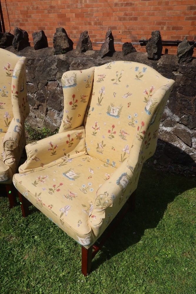 A pair of wing back arm chairs with upholstered decoration with birds TRADE ONLY