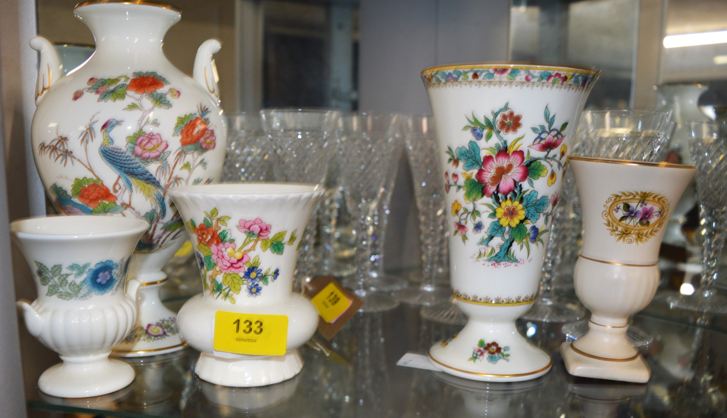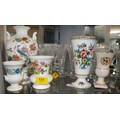 Assortment of Bone China-Ware: Coalport Vases x 2 (Ming Rose 7" H, and Flower of Tibet), Wedgwood (Kutani Crane 9" High), Flora Keramic Gouda Vase, etc