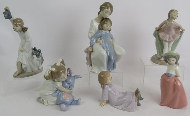 Six various Spanish porcelain NAO figurines of children in various poses. Tallest 23cm. (6).