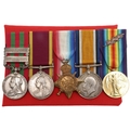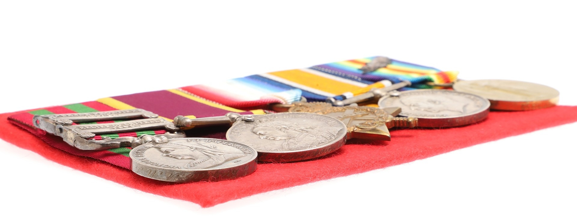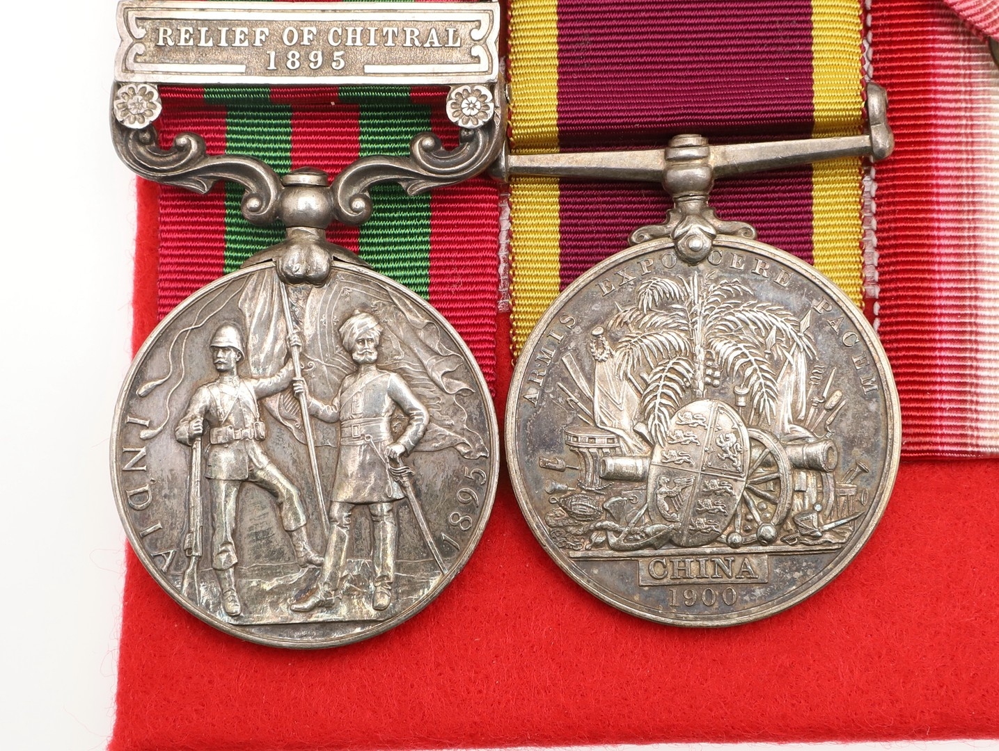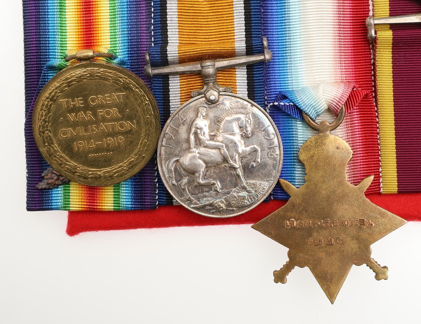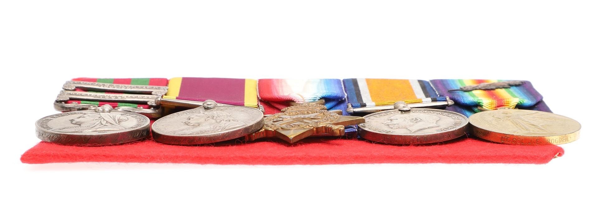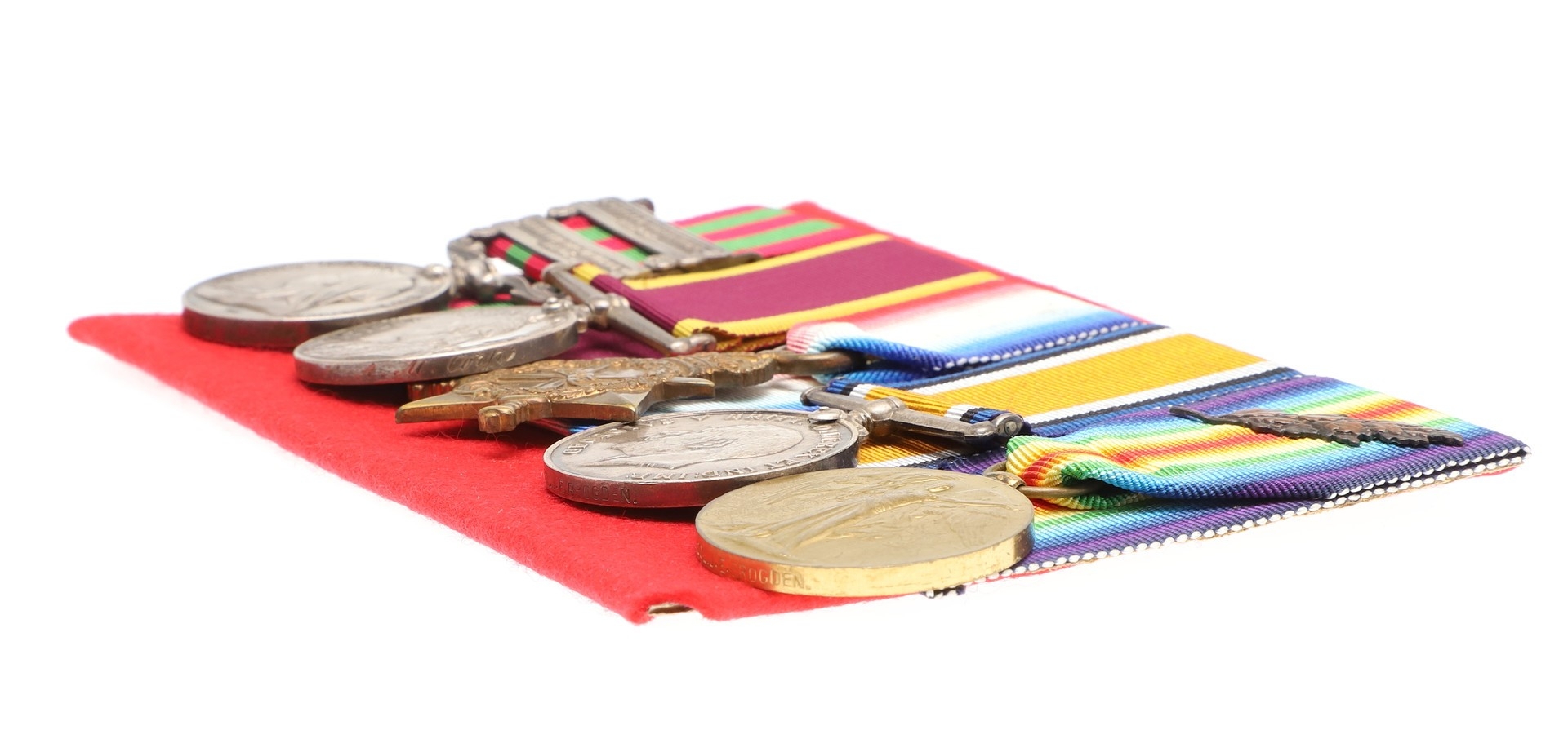 AN INDIA, CHINA AND FIRST WORLD WAR GROUP OF FIVE TO THE ROYAL ARMY MEDICAL CORPS. A group of five comprising India General Service Medal 1895-1902 with Relief of Chitral 1895 and Punjab Frontier 1897-98 clasps named to Surgn Capt J.E. Brogden A.M.S. China 1900 Medal to Captn J. E. Brogden R.A.M. Corps, 1915 Star to Lt. Col J.E. Brogden R.A.M.C., War medal and Victory medal with mentioned in despatches oak leaf to Lt. Col J.E. Brogden. James England Brogden was born in Portsmouth on the 28th August 1865, later living on the Isle of Wight. He was appointed Lieutenant Colonel on the 15th September 1913 and served in France from the 23rd July 1915. His Mention in Despatches was published in the Gazette on the 1st January 1916. Provenance: Noonans London, previously the collection of the late Roy Painter.