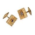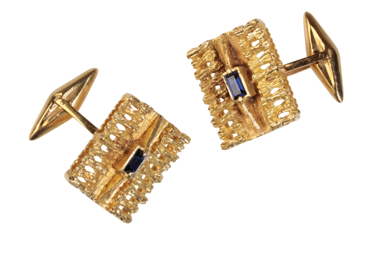 A PAIR OF GENTLEMAN'S YELLOW GOLD CUFFLINKS, each fancy openwork plaque, set to the centre with a single sapphire, the clip connections stamped "750", approx 12.2grams total weight including the sapphires