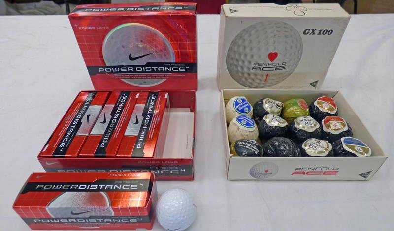 SET OF 12 NIKE POWER DISTANCE 4 GOLF BALLS IN BOX & A PENFOLD ACE GOLF BALL BOX WITH CONTENTS OF VARIOUS GOLF BALLS