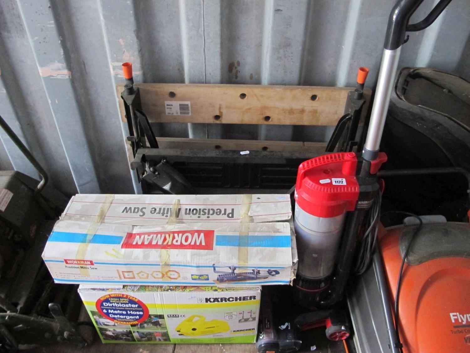 Black & Decker Workmate, Workman mitre saw (boxed), Vax Machair Hoover and a Karcher Dirt Blaster. (4)