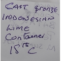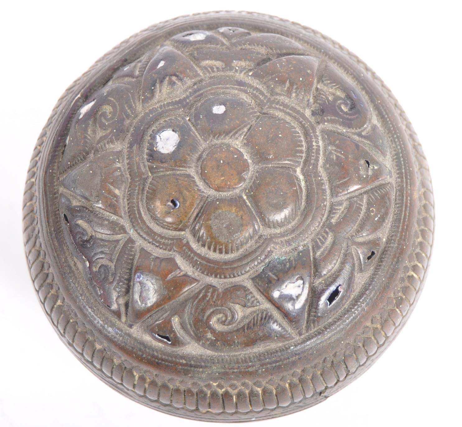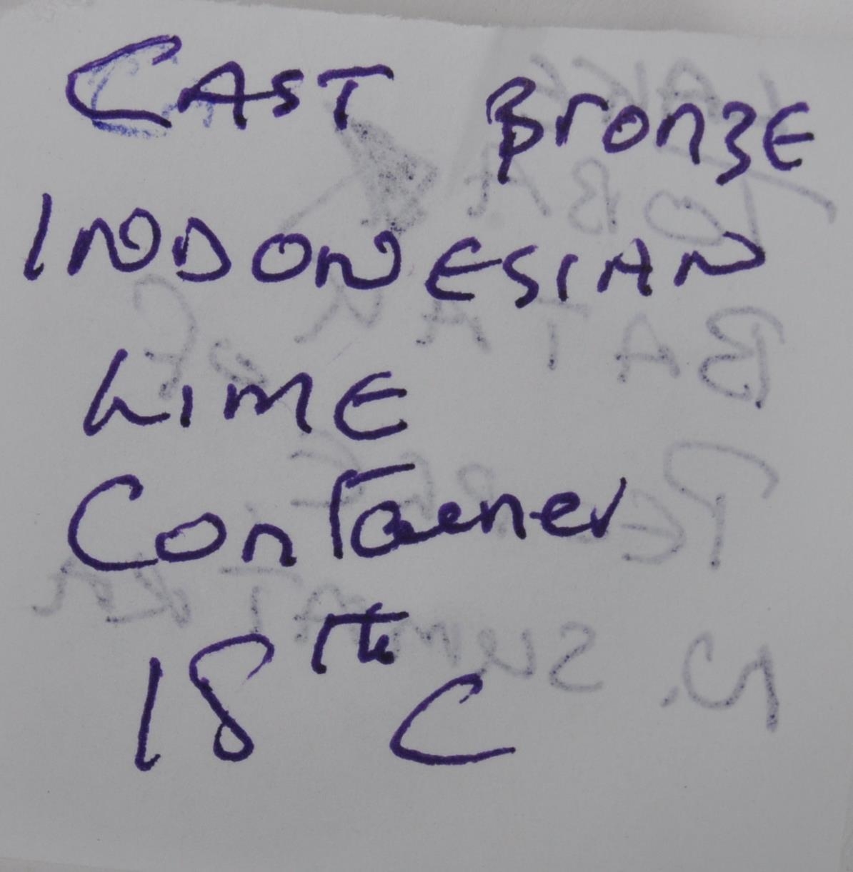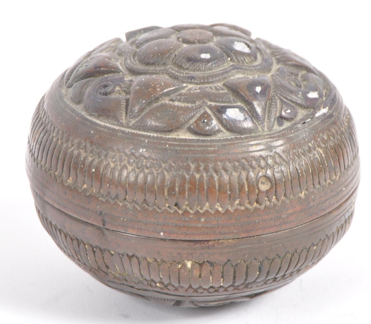 A large Indonesian cast brass lime container. A spherical brass box, cast in two halves, decorated in floral and pendant betel (sirih) leaf motifs and repeated patterns. Circa 1900s, believed to be from the Toba Batak People, North Sumatra, Indonesia. Approximately 7.5cm in diameter.
