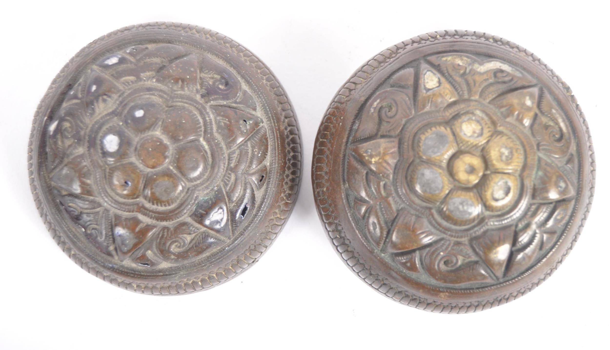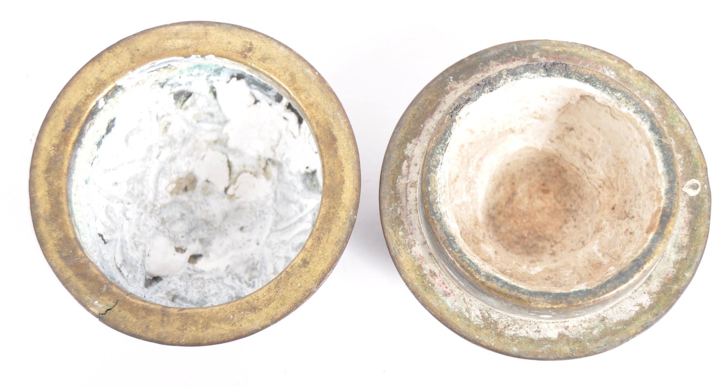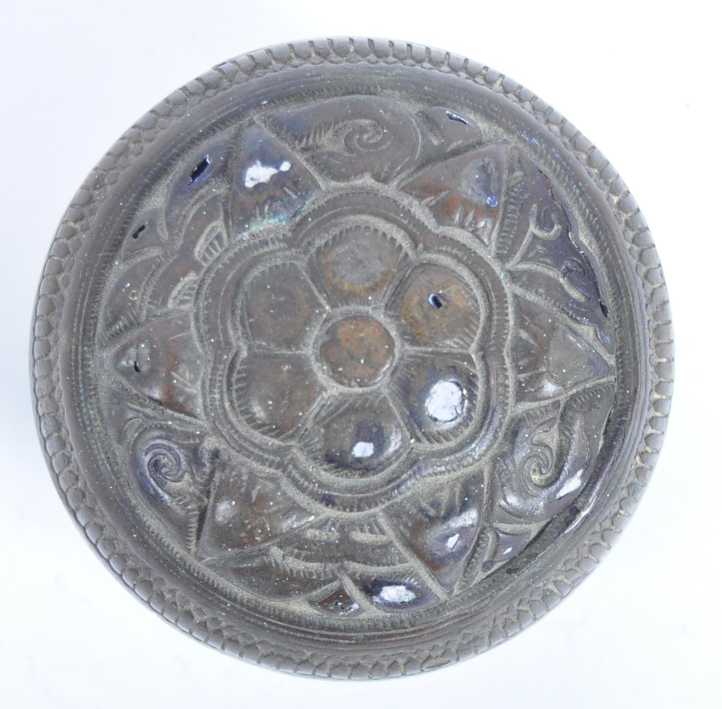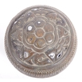 A large Indonesian cast brass lime container. A spherical brass box, cast in two halves, decorated in floral and pendant betel (sirih) leaf motifs and repeated patterns. Circa 1900s, believed to be from the Toba Batak People, North Sumatra, Indonesia. Approximately 7.5cm in diameter.