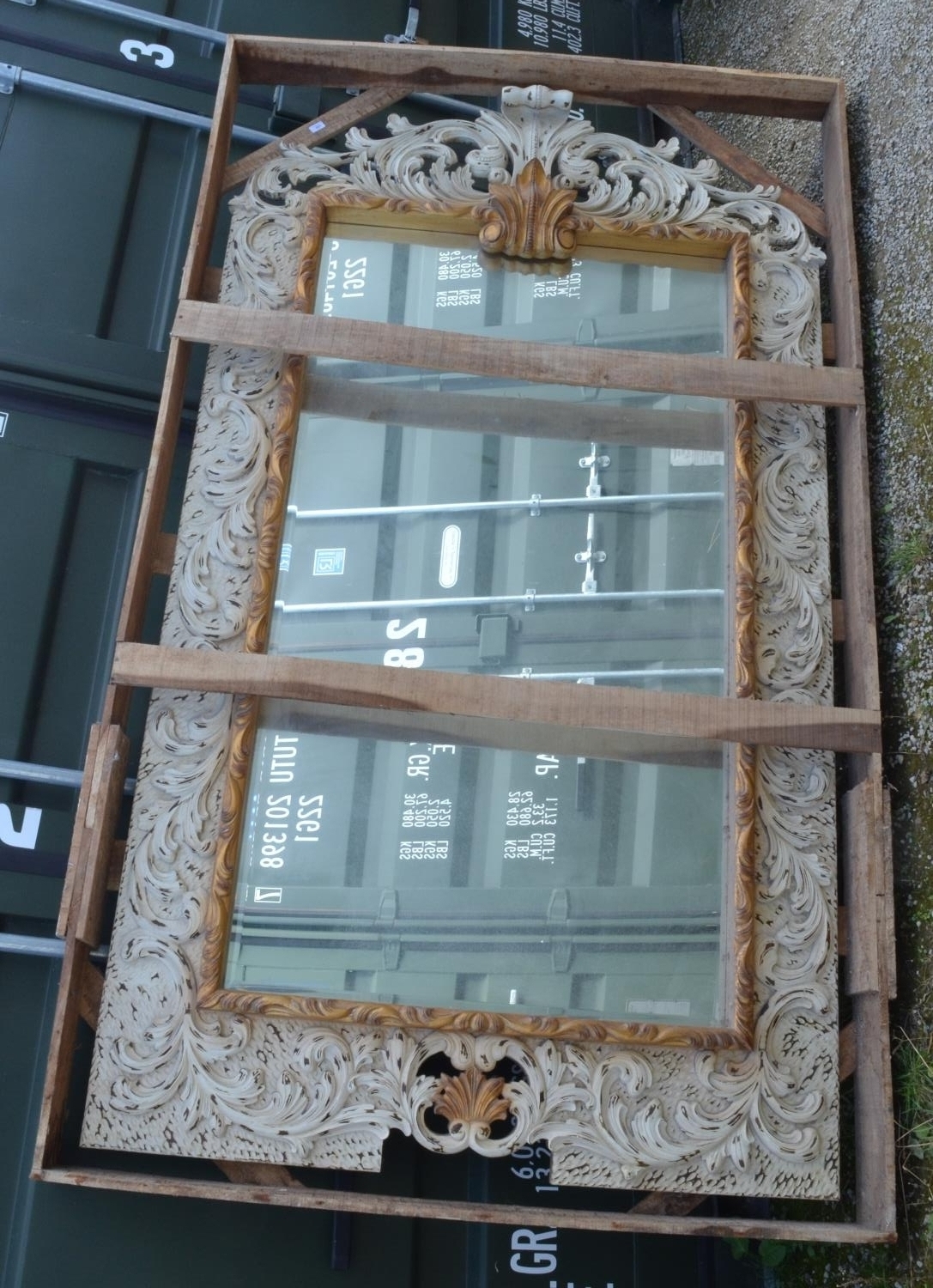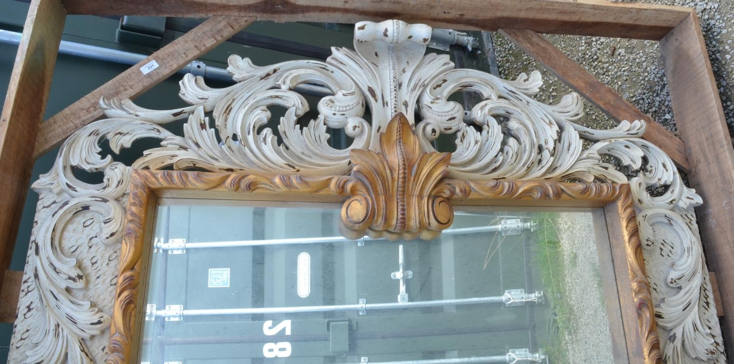 Large Chippendale style, upright rectangular mirror, white finish scroll carved frame with gilt inner slip. H250cm W150cm