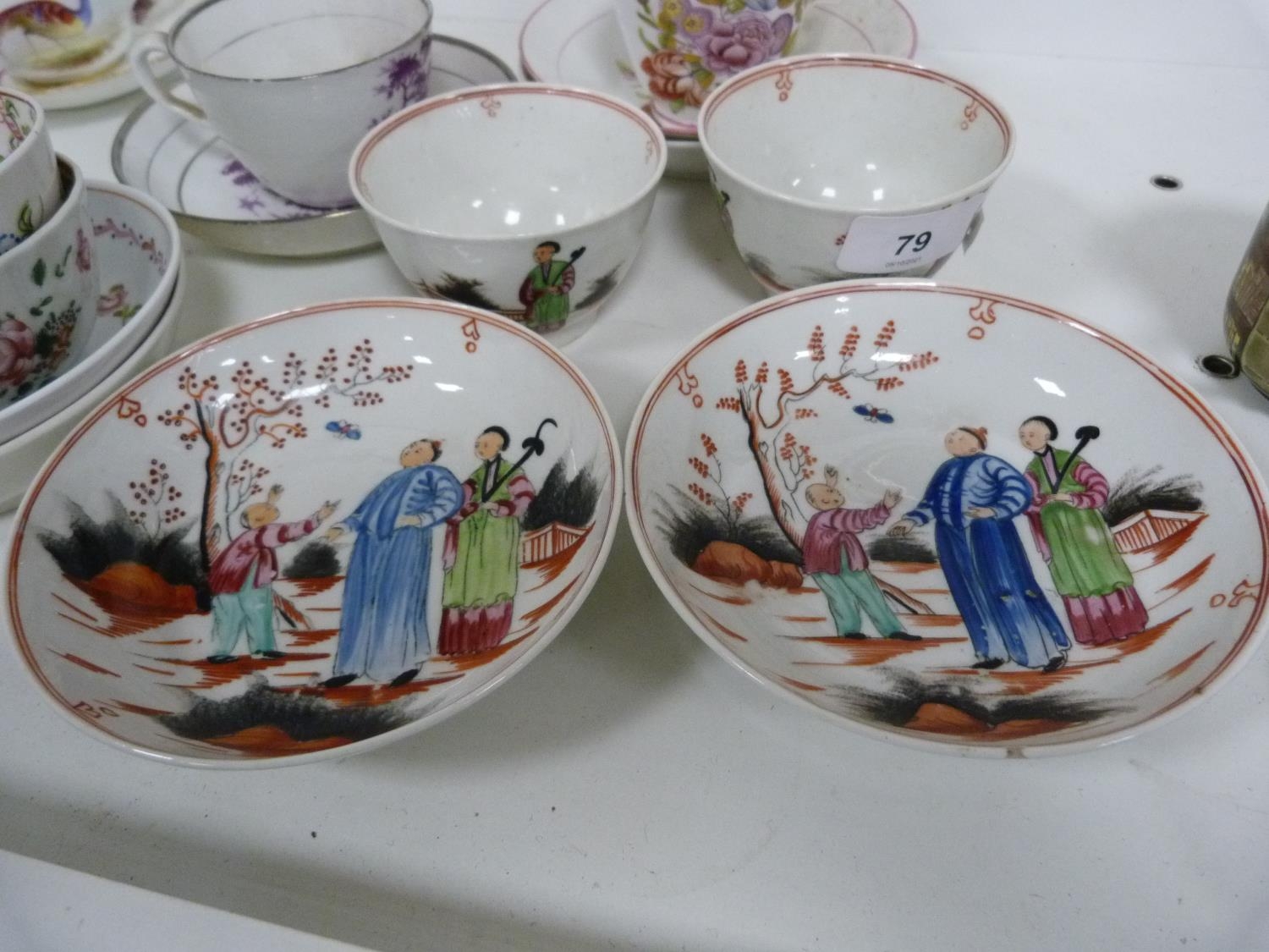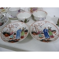 Bowls and saucers with Chinese figures: one saucer is chipped, decoration on one teabowl is rubbed;