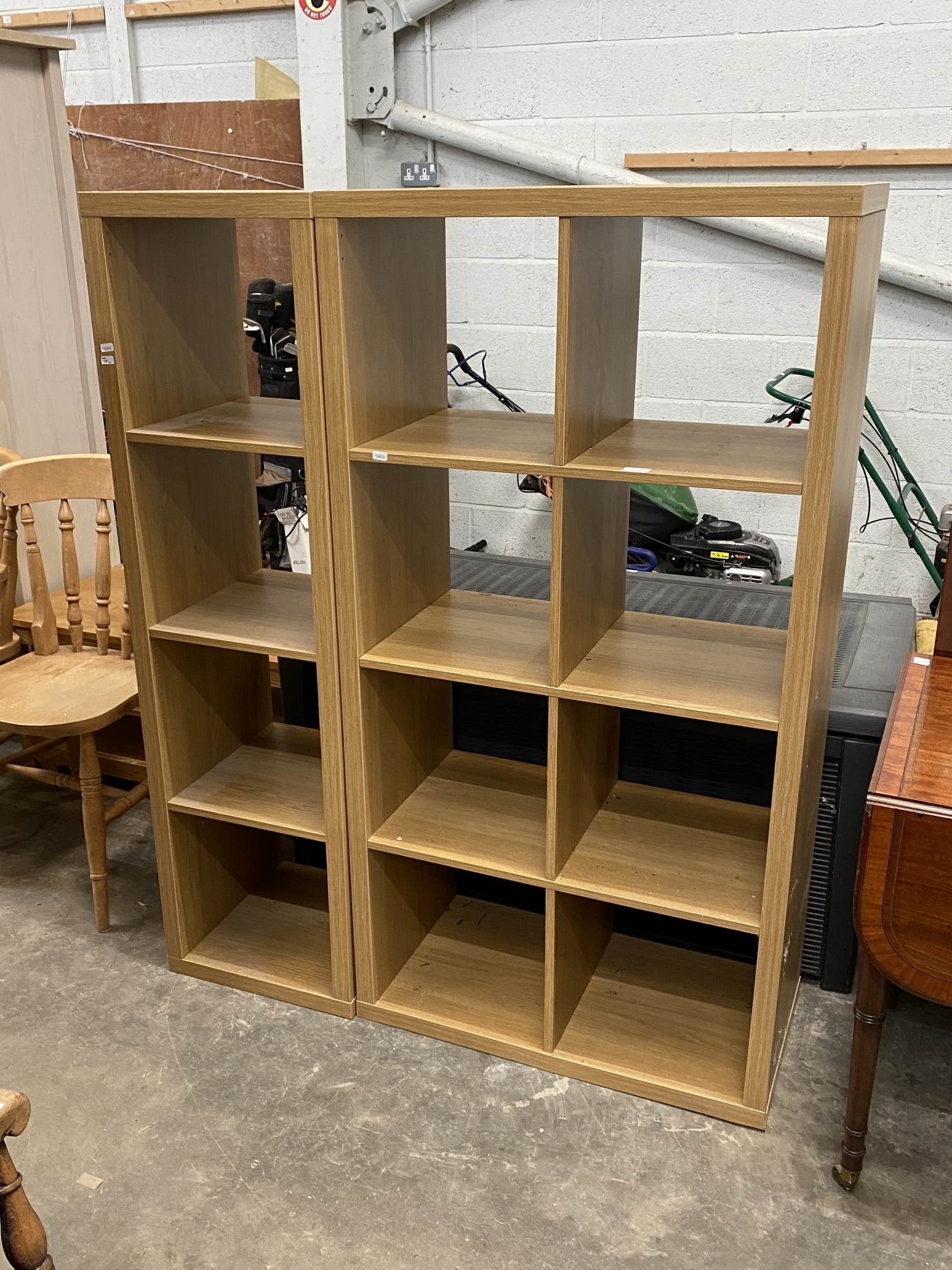 Oak effect modular 9 cube storage shelves (in 2 sections) 148H 118W 40D