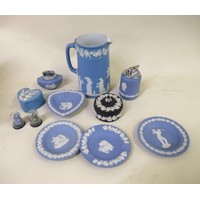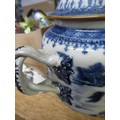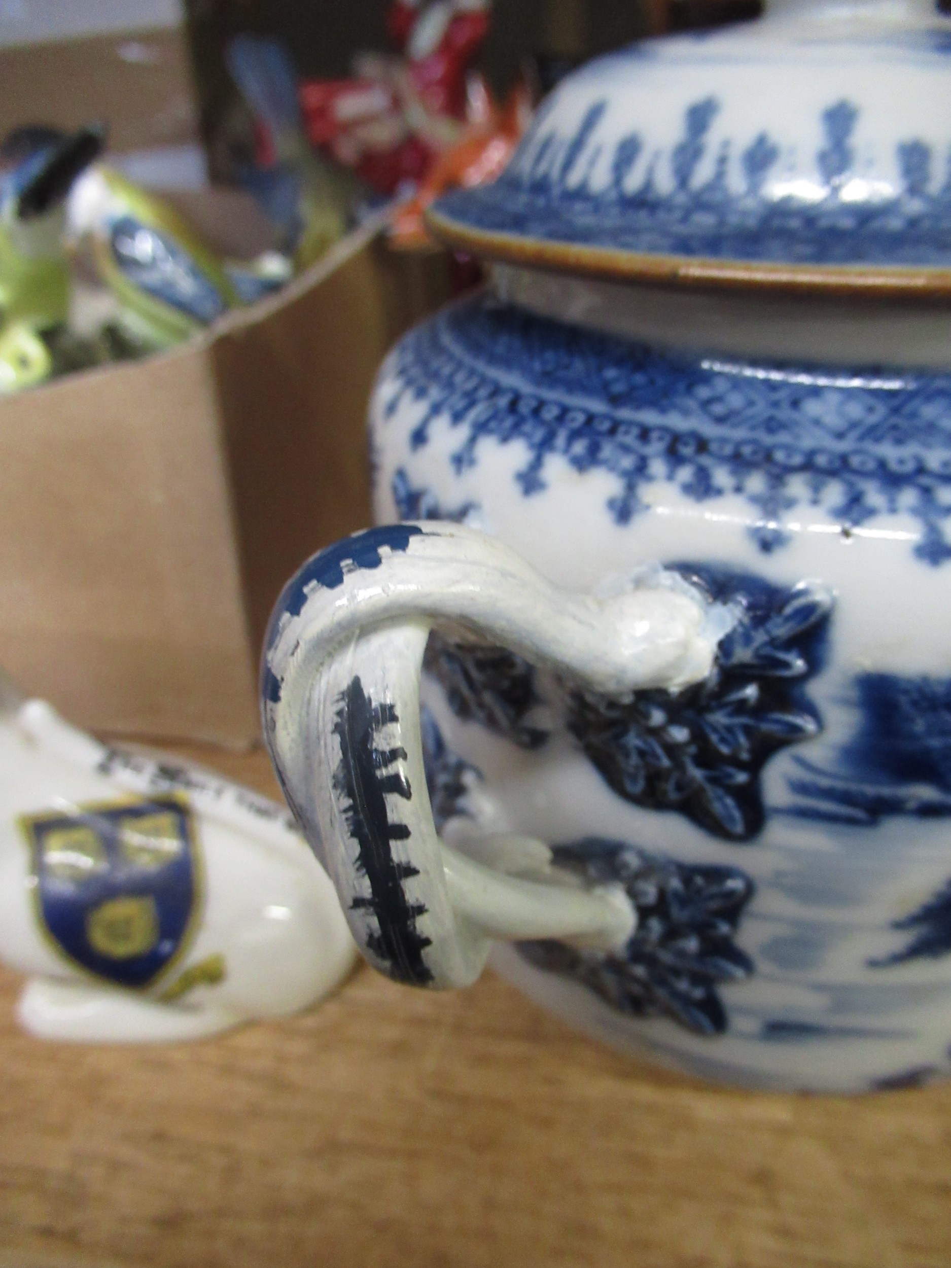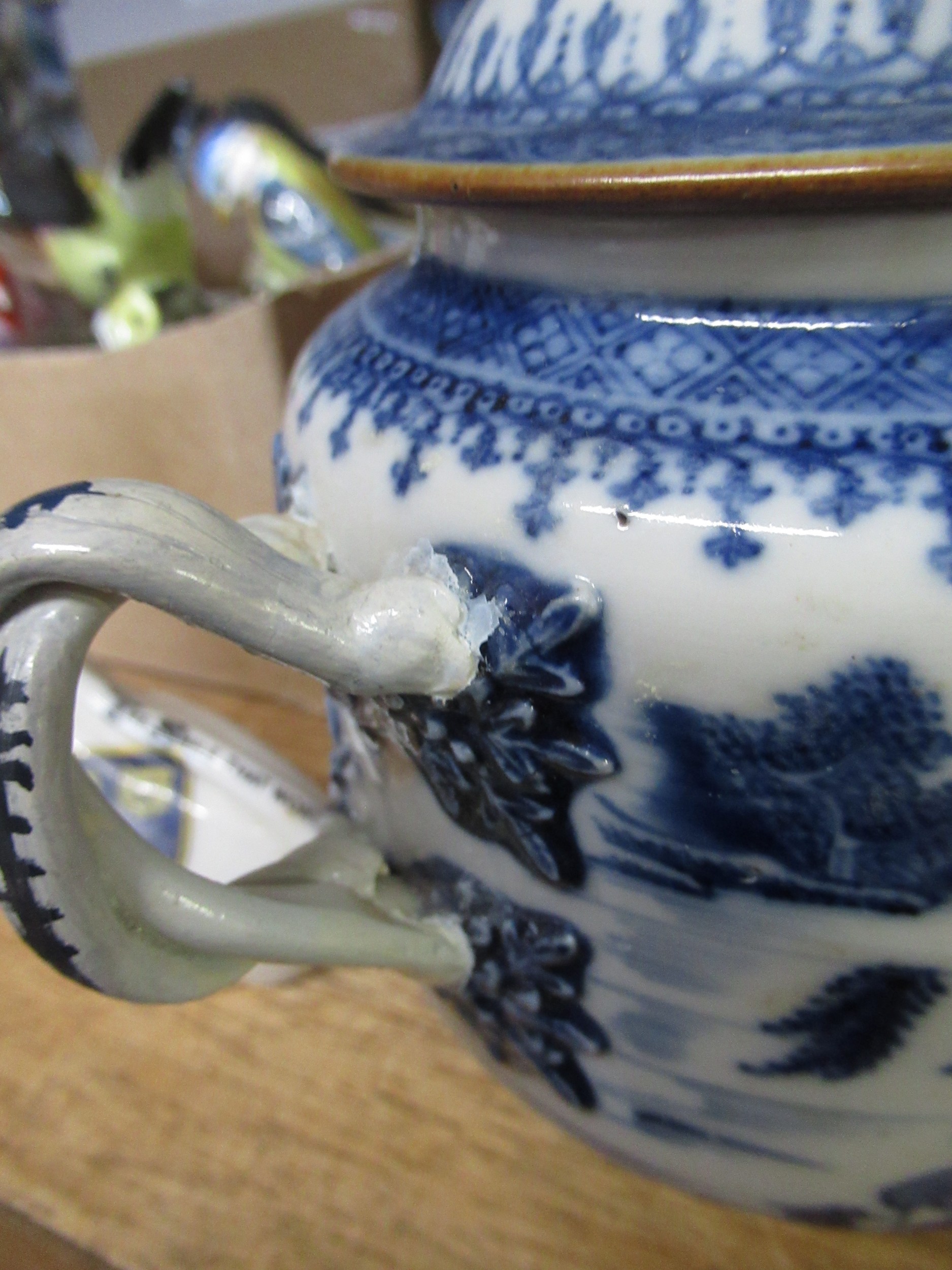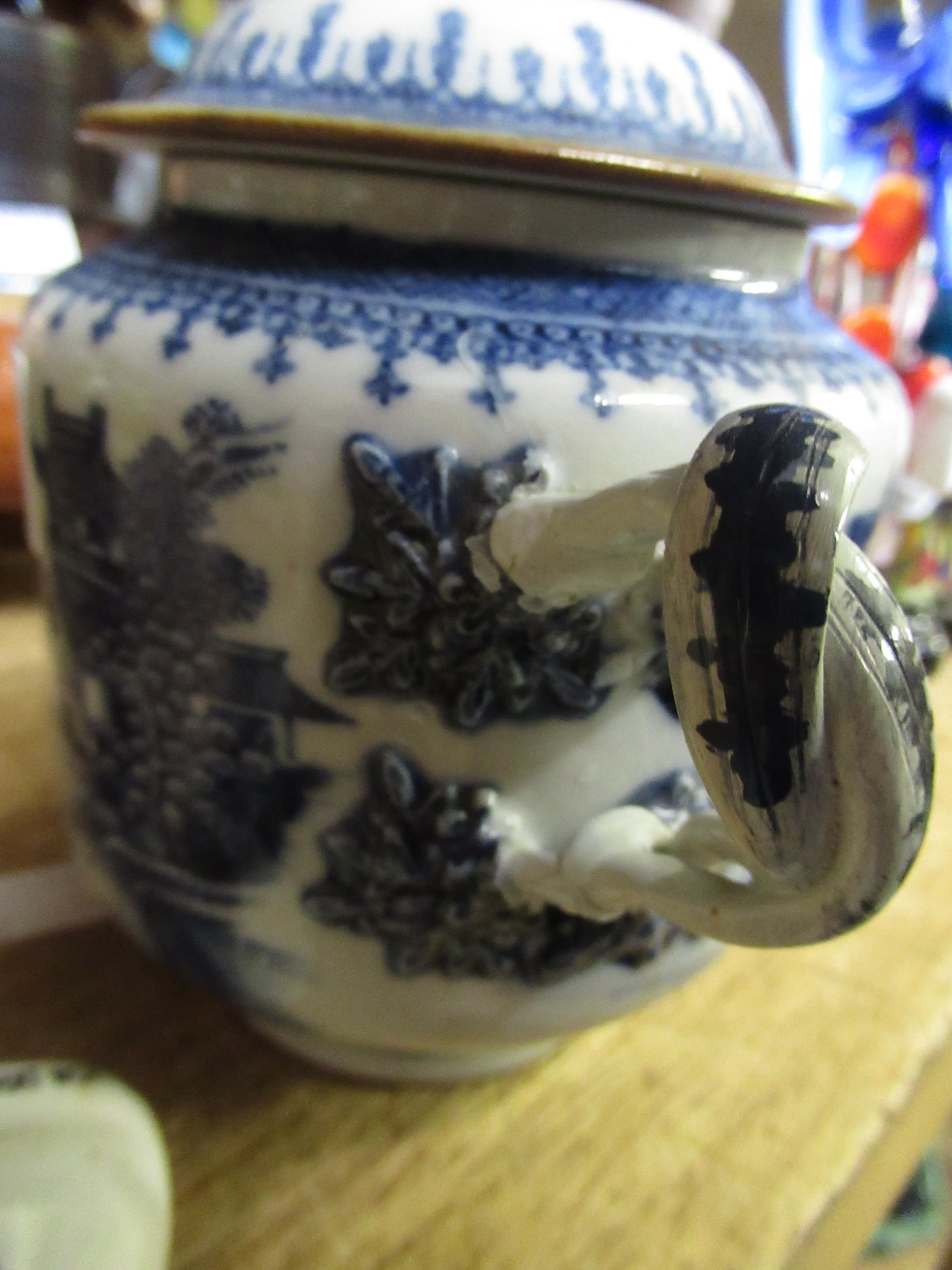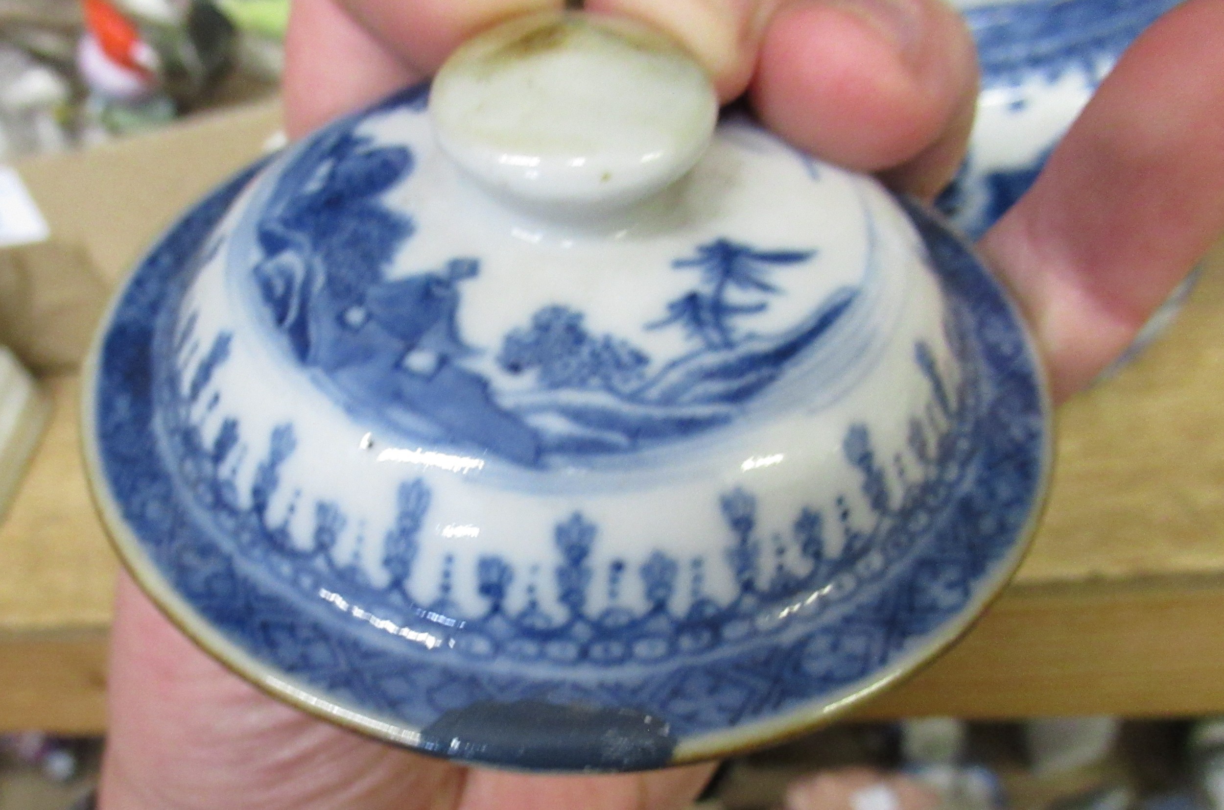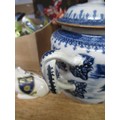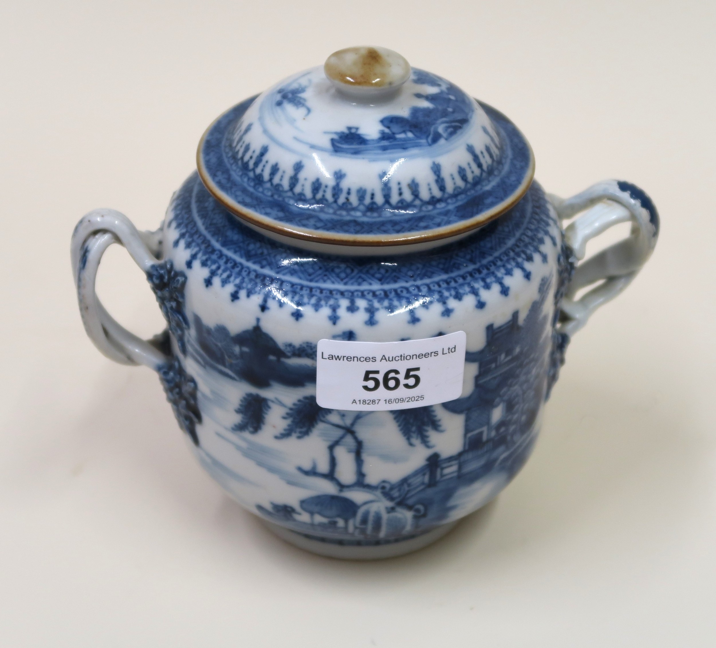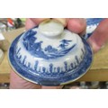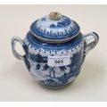 Antique Chinese blue and white two handled jar and cover (at fault), 14cm high