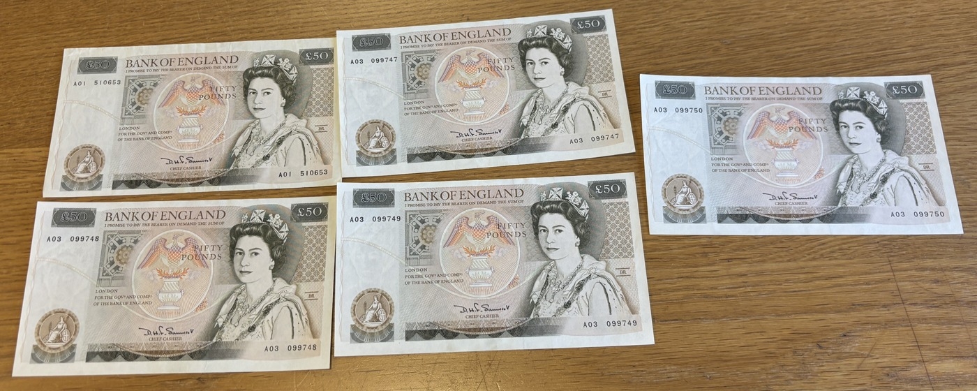 D.H.F. Somerset. Range of notes, near uncirculated, including £50 A01 and consecutive A03 099747-50. Qty 5. (N)