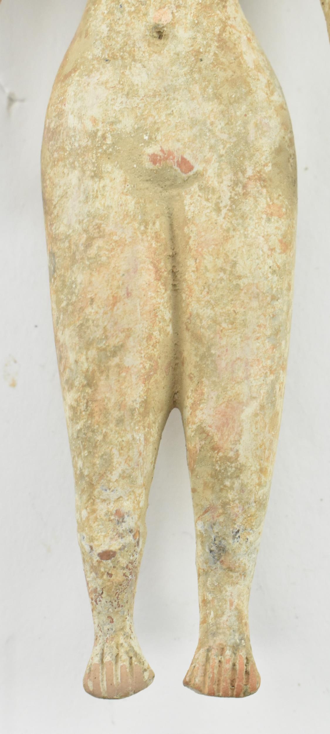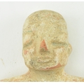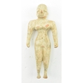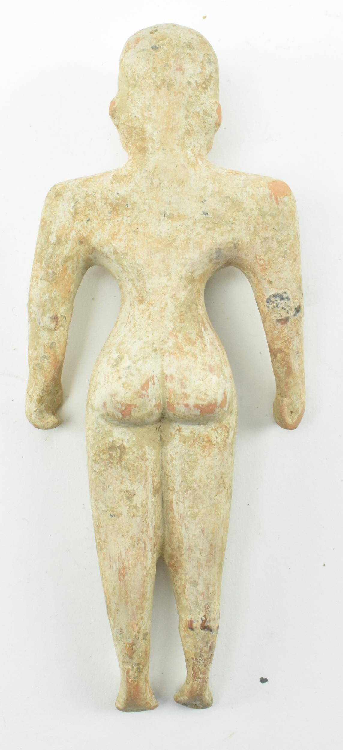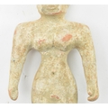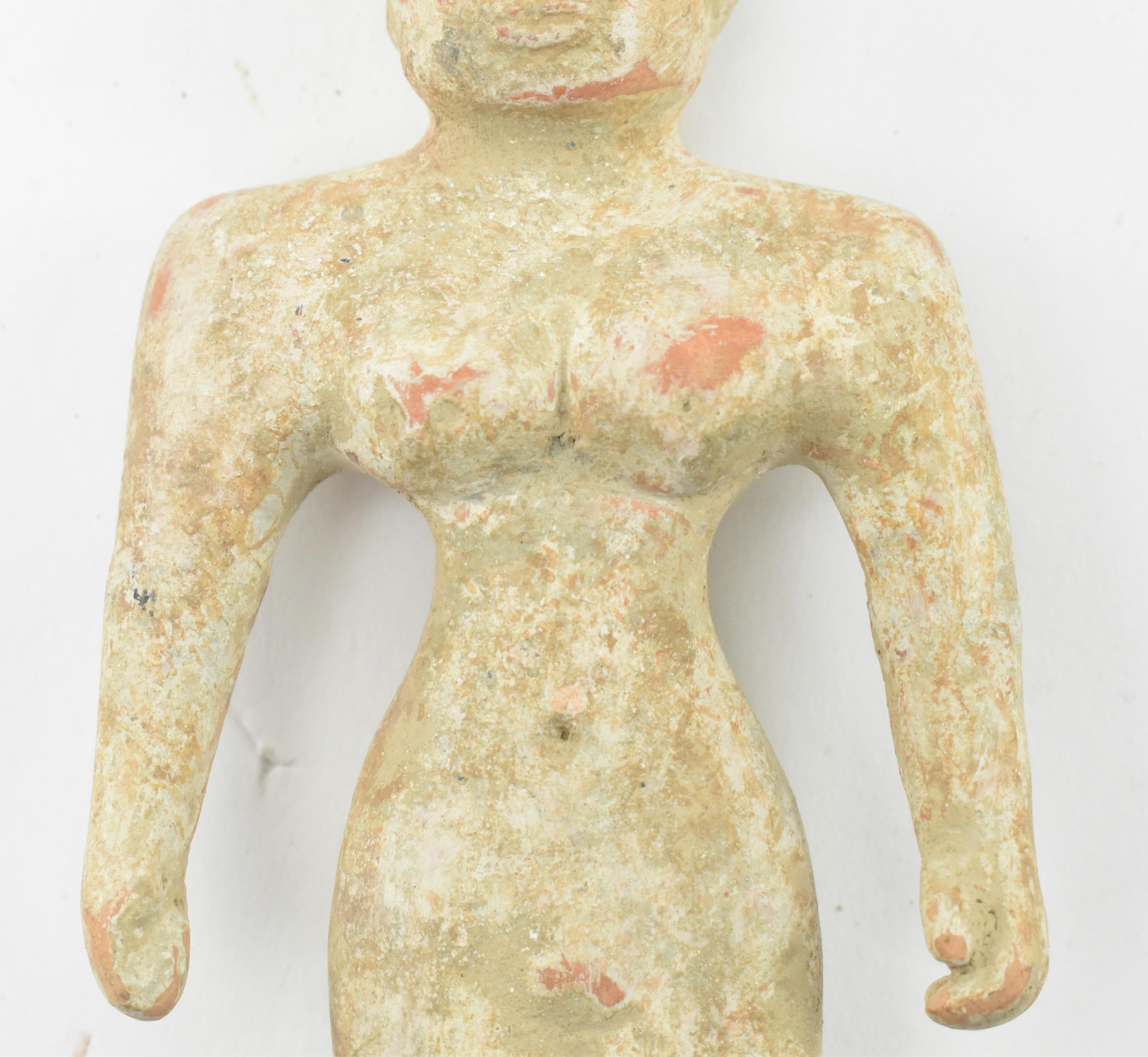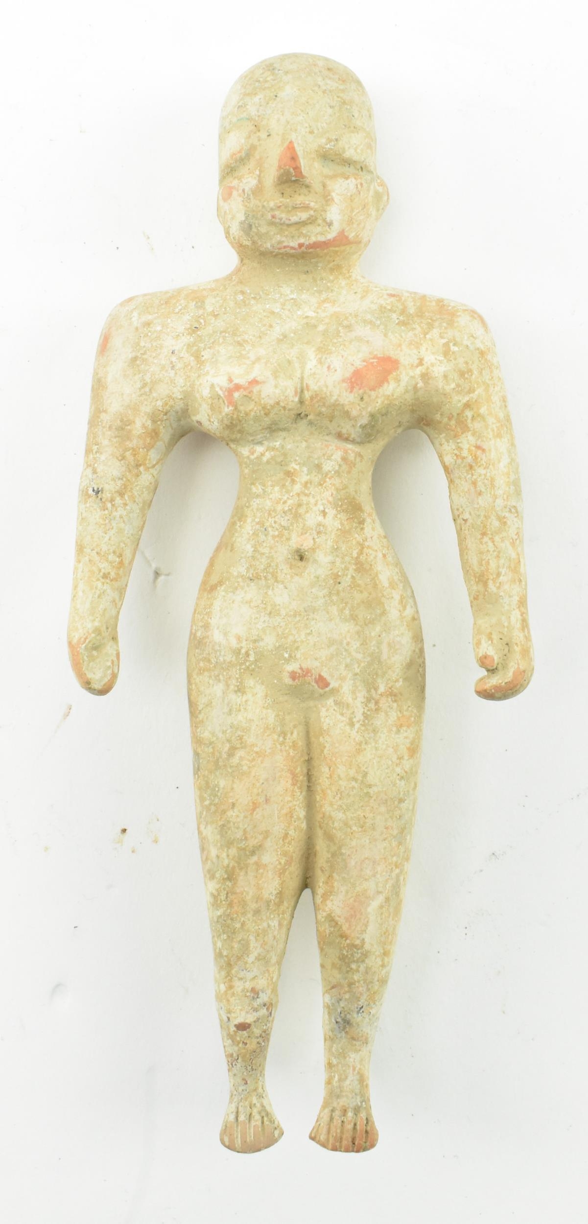 A believed Indus Valley Harappa hand moulded terracotta idol figurine. Likely a fertility idol religious offering, depicting a woman. Measures approx. 14.5cm long.