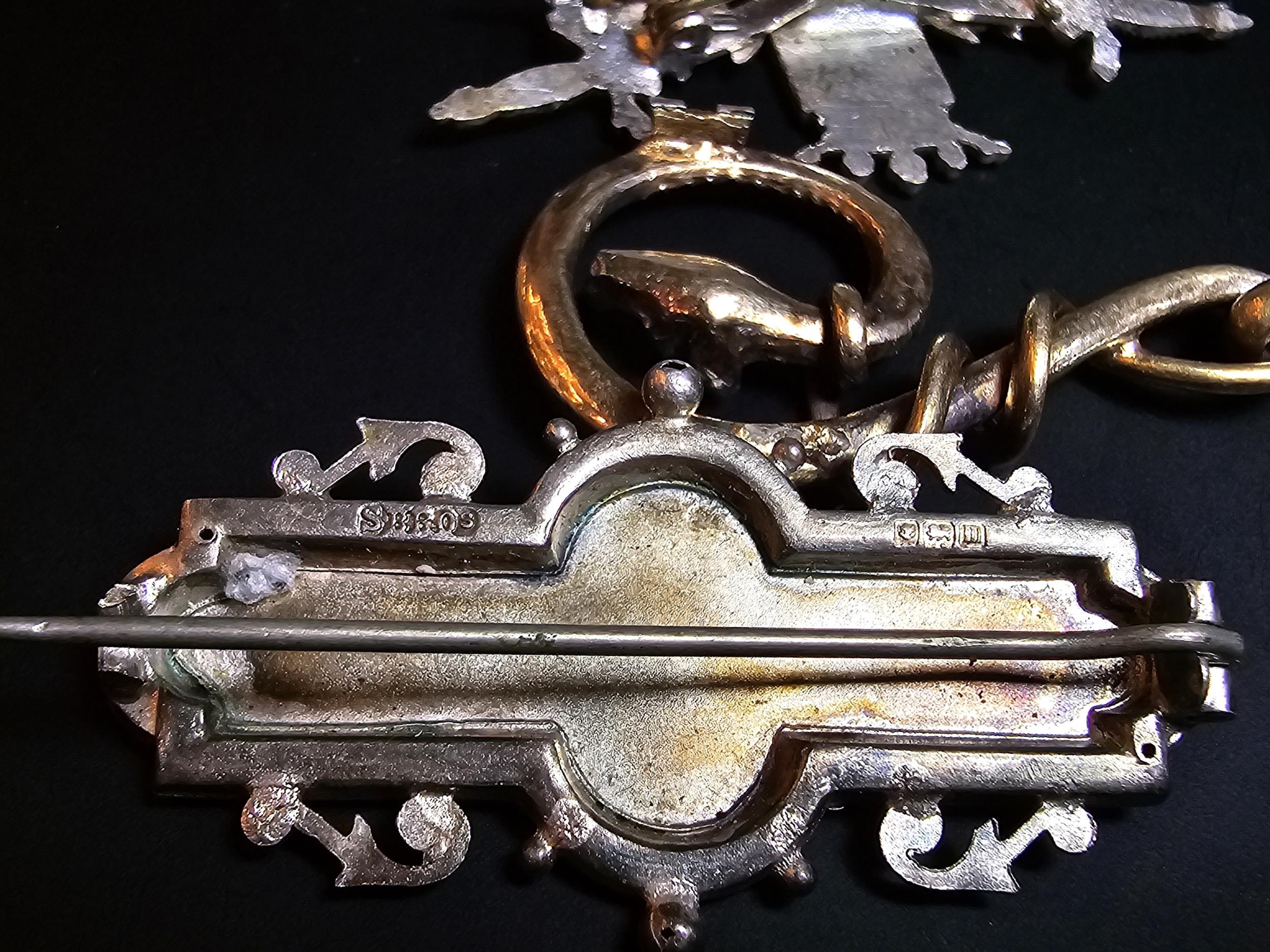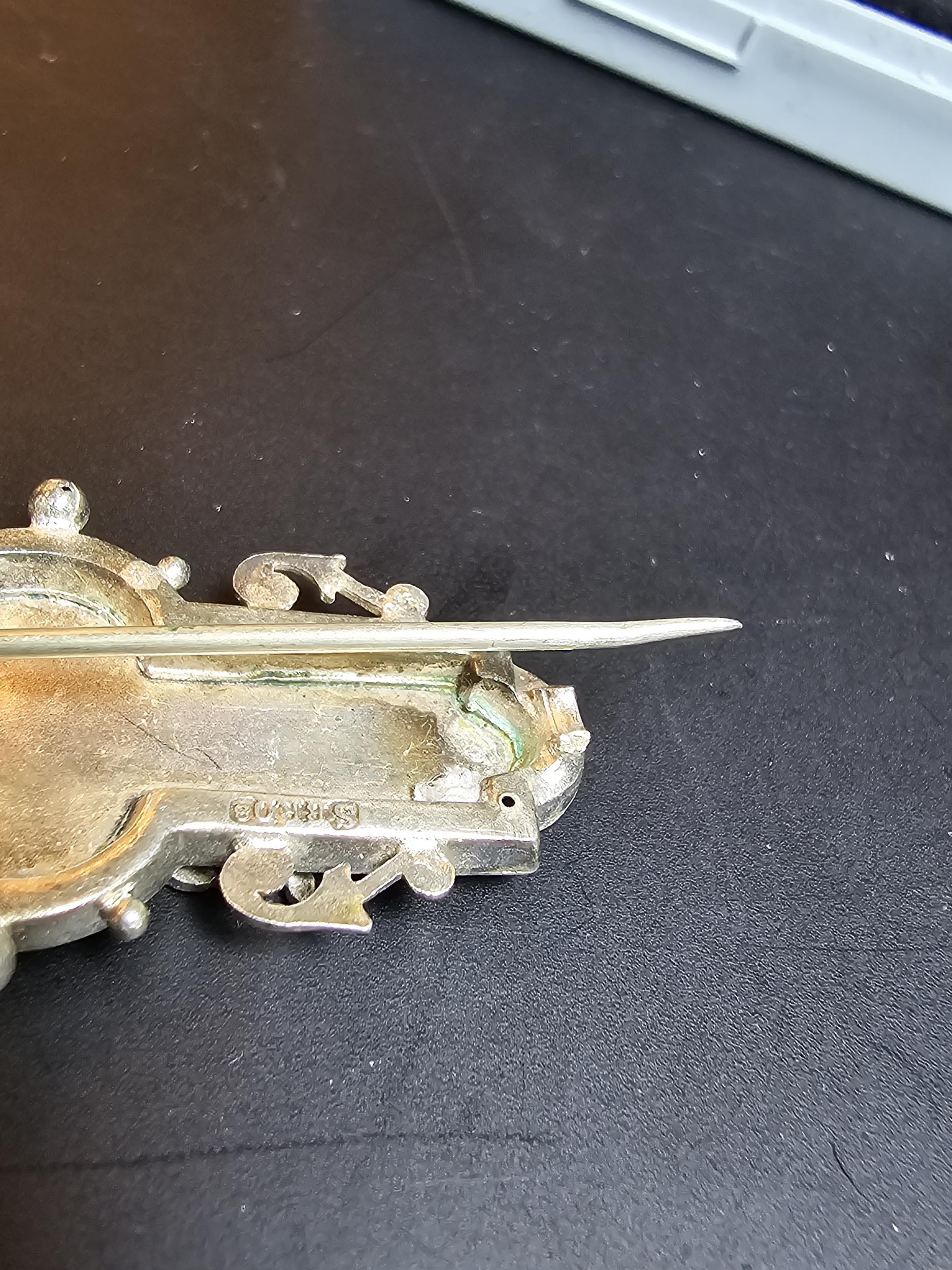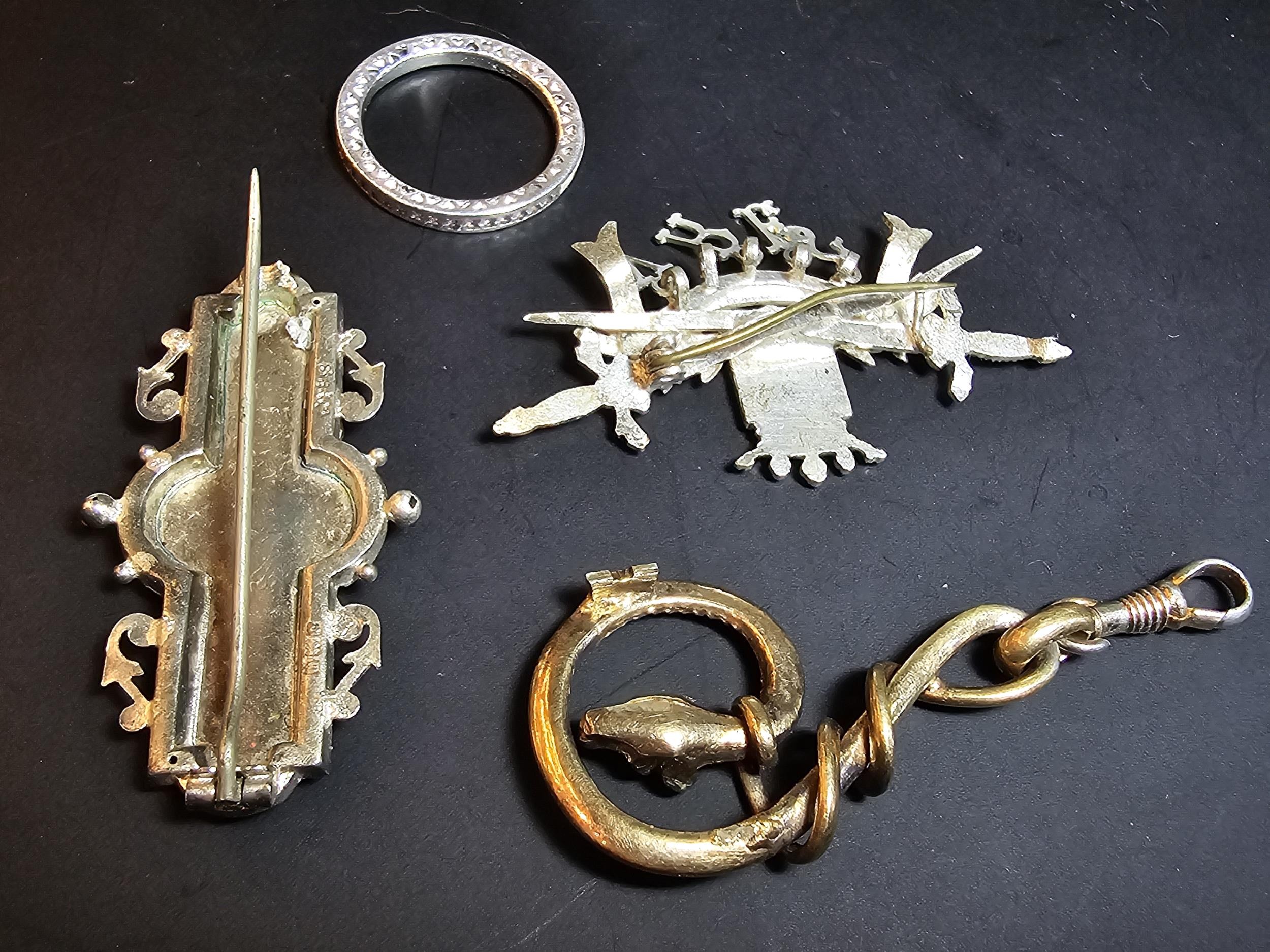 A bundle of jewellery to include Pandora 925 Silver ring, an Antique hallmarked Silver sweetheart brooch overlaid with rose gold, a white Ypres brooch however it is missing the letter P and an unusual gold plated dragon pendant. The sweetheart brooch pin clasp is broken.