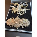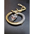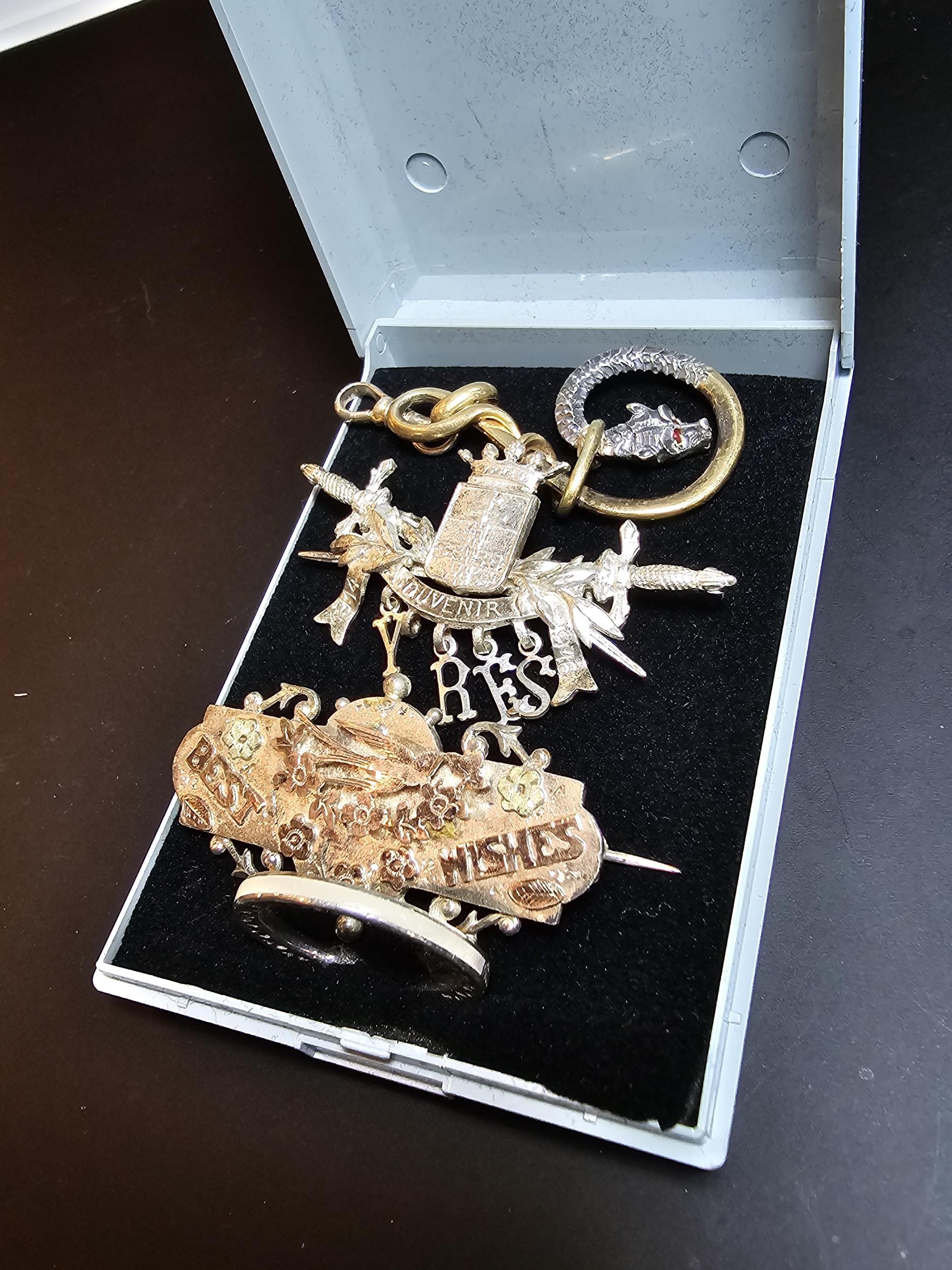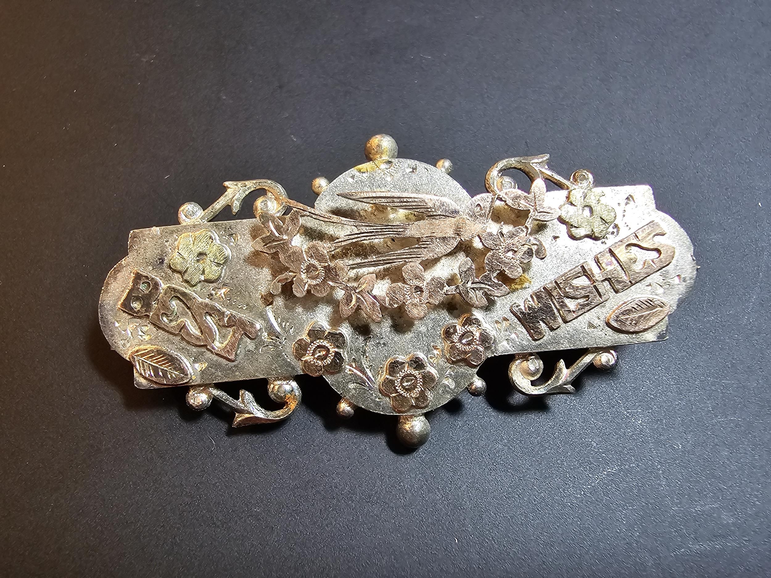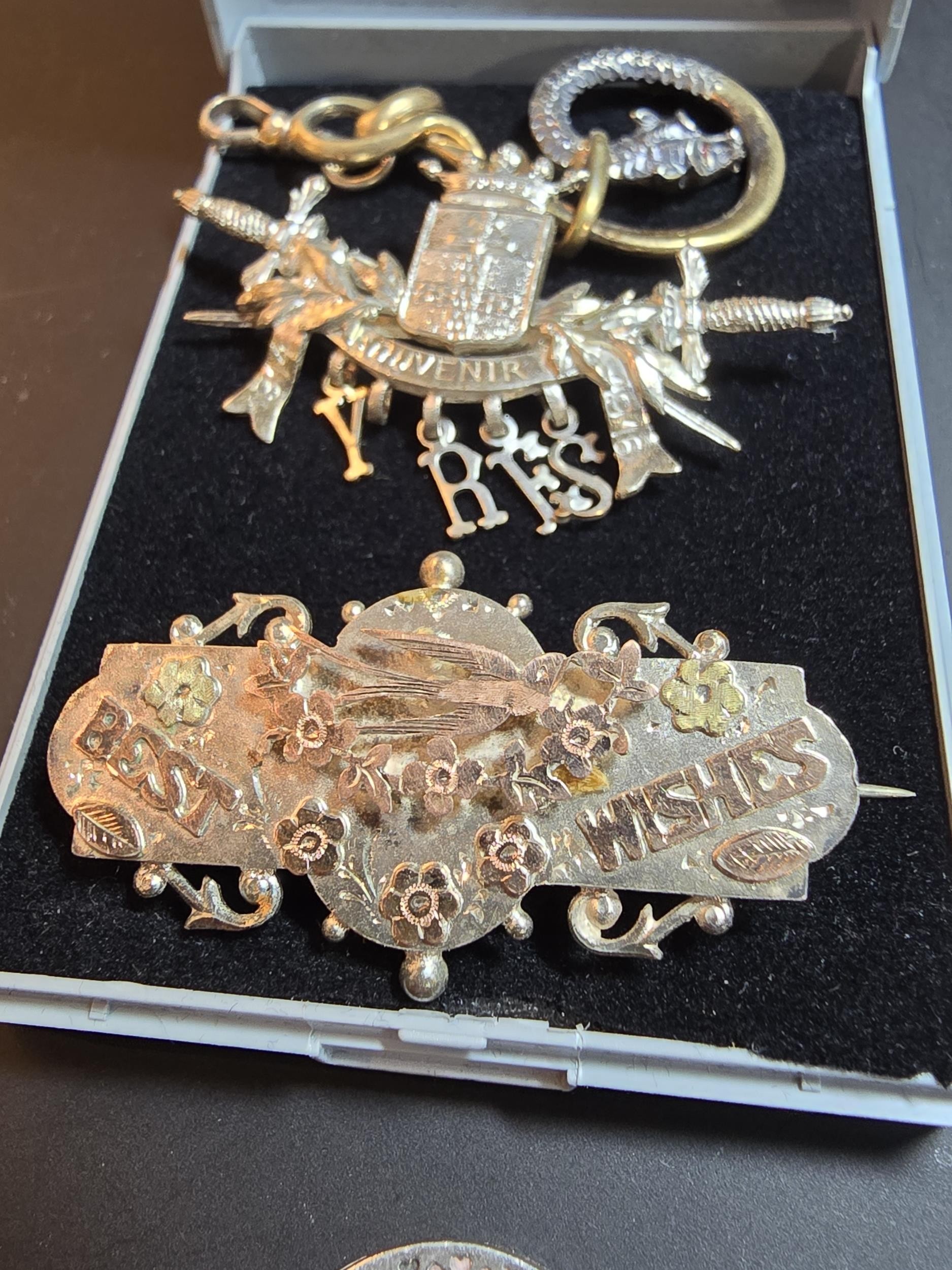 A bundle of jewellery to include Pandora 925 Silver ring, an Antique hallmarked Silver sweetheart brooch overlaid with rose gold, a white Ypres brooch however it is missing the letter P and an unusual gold plated dragon pendant. The sweetheart brooch pin clasp is broken.