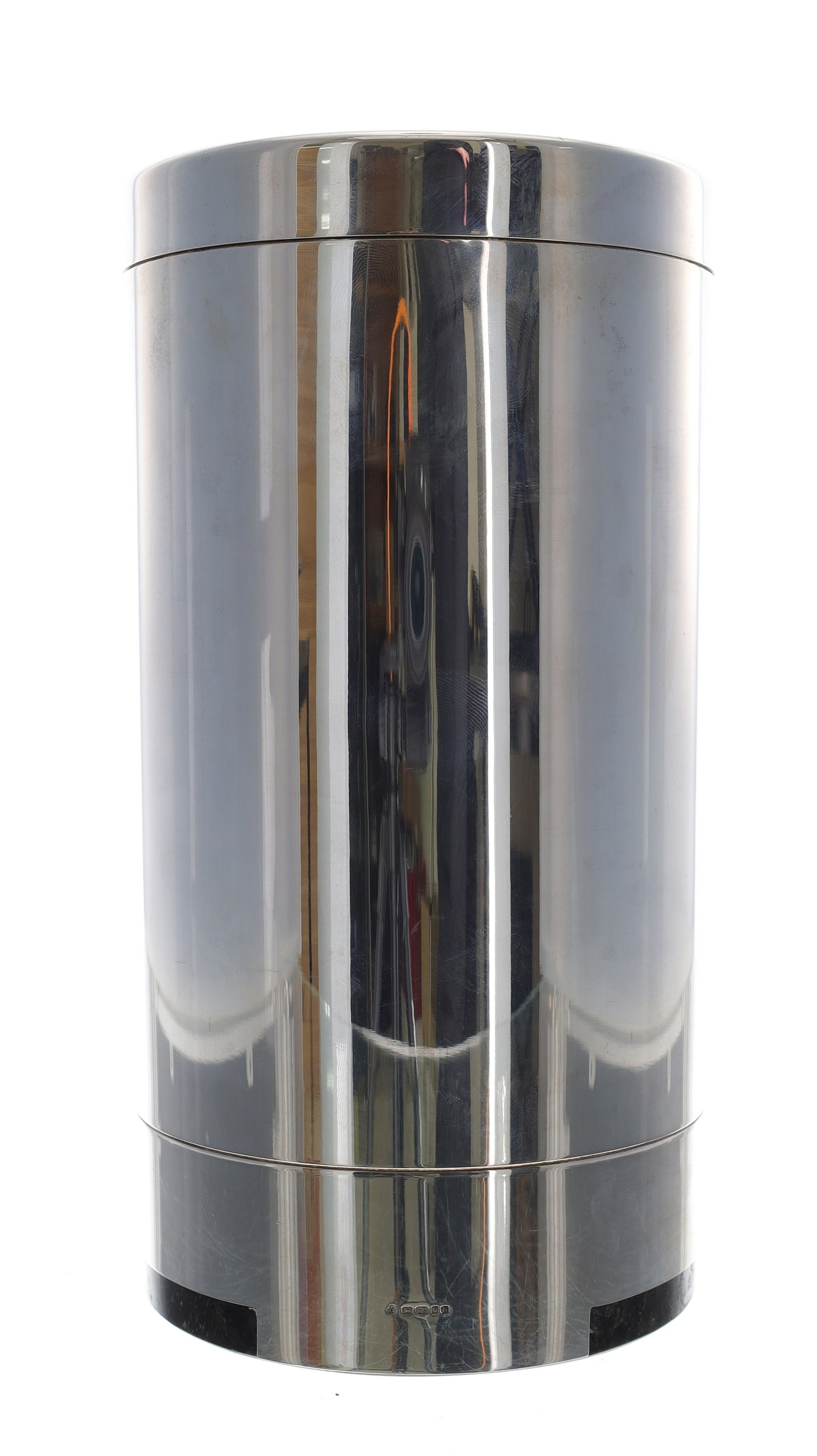 Modern silver wine cooler, the plain cylinder with a liner, and three removable ice packs, having an inset marble base, maker TRS London 2007, 10" high