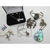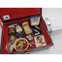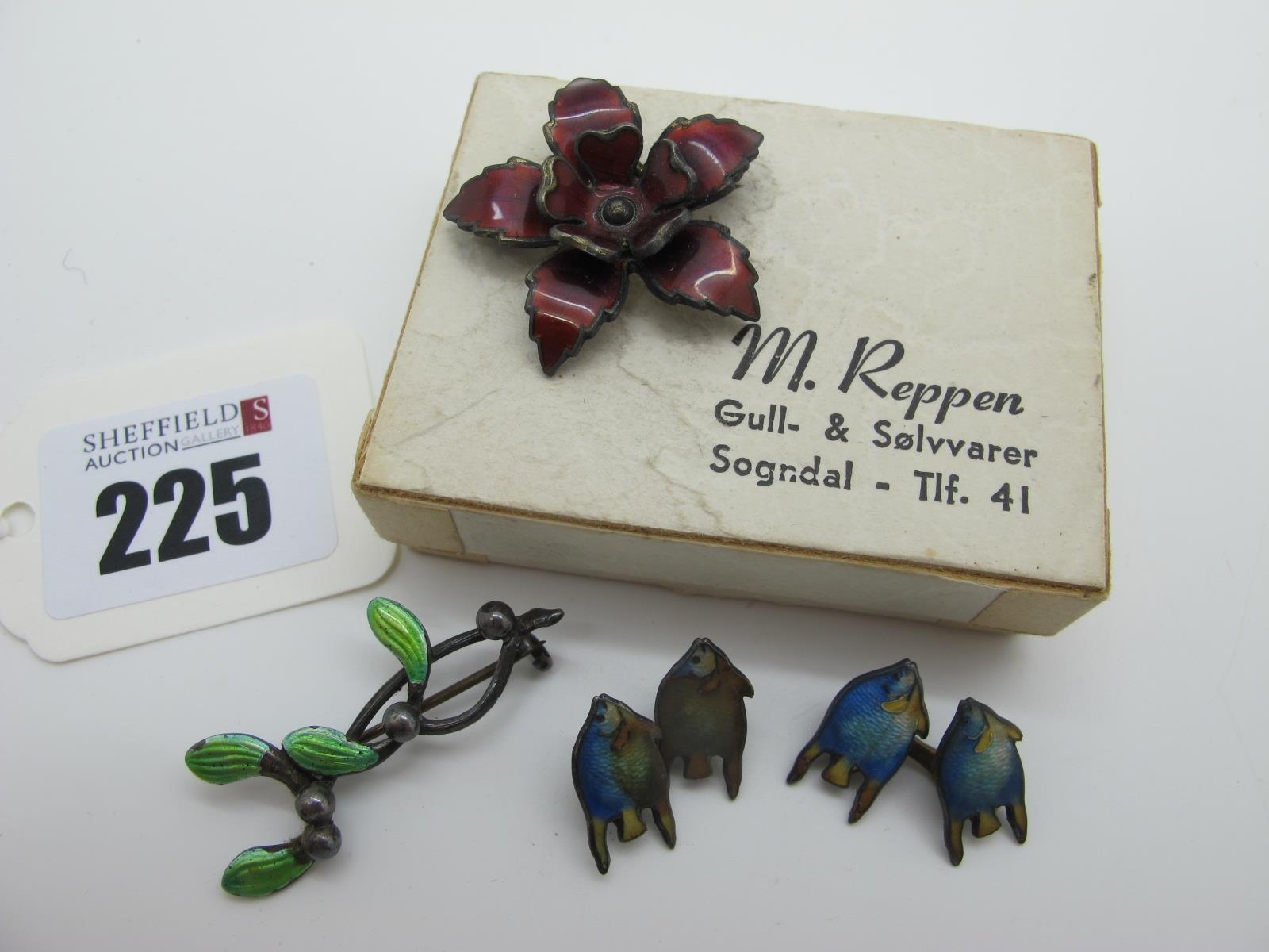 A Pair of Vintage Enamel Novelty Fish Cufflinks, (indistinctly stamped) a Charles Horner Chester hallmarked silver and enamel mistletoe brooch, Edelmetall "925S" enamel flowerhead brooch.