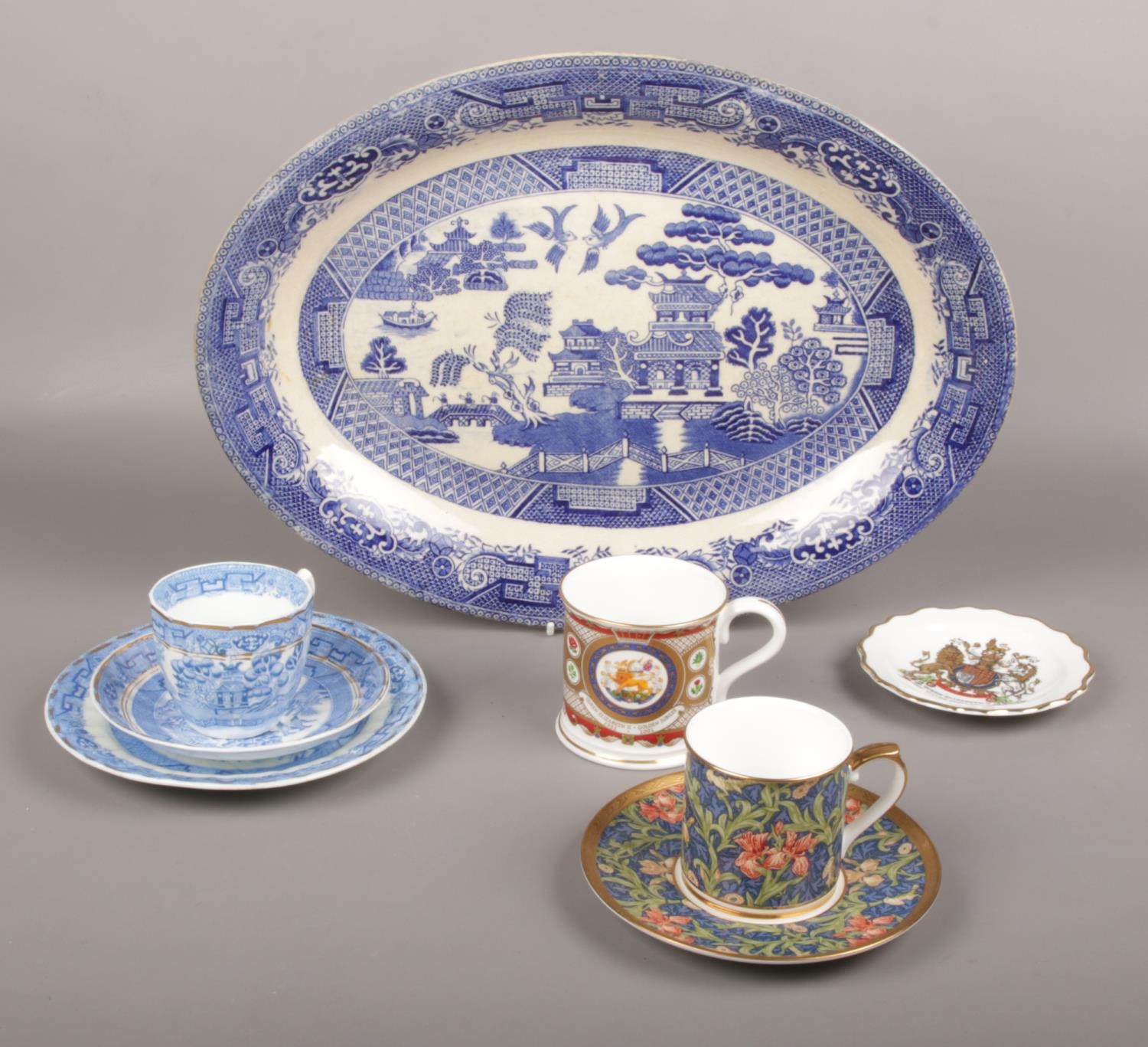 A collection of ceramics, Victoria and Albert Museum William Morris collection cup and saucer 'Iris', Royale Strafford Golden Jubilee HM Queen Elizabeth ii, Oriental style meat plate etc