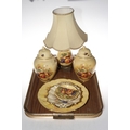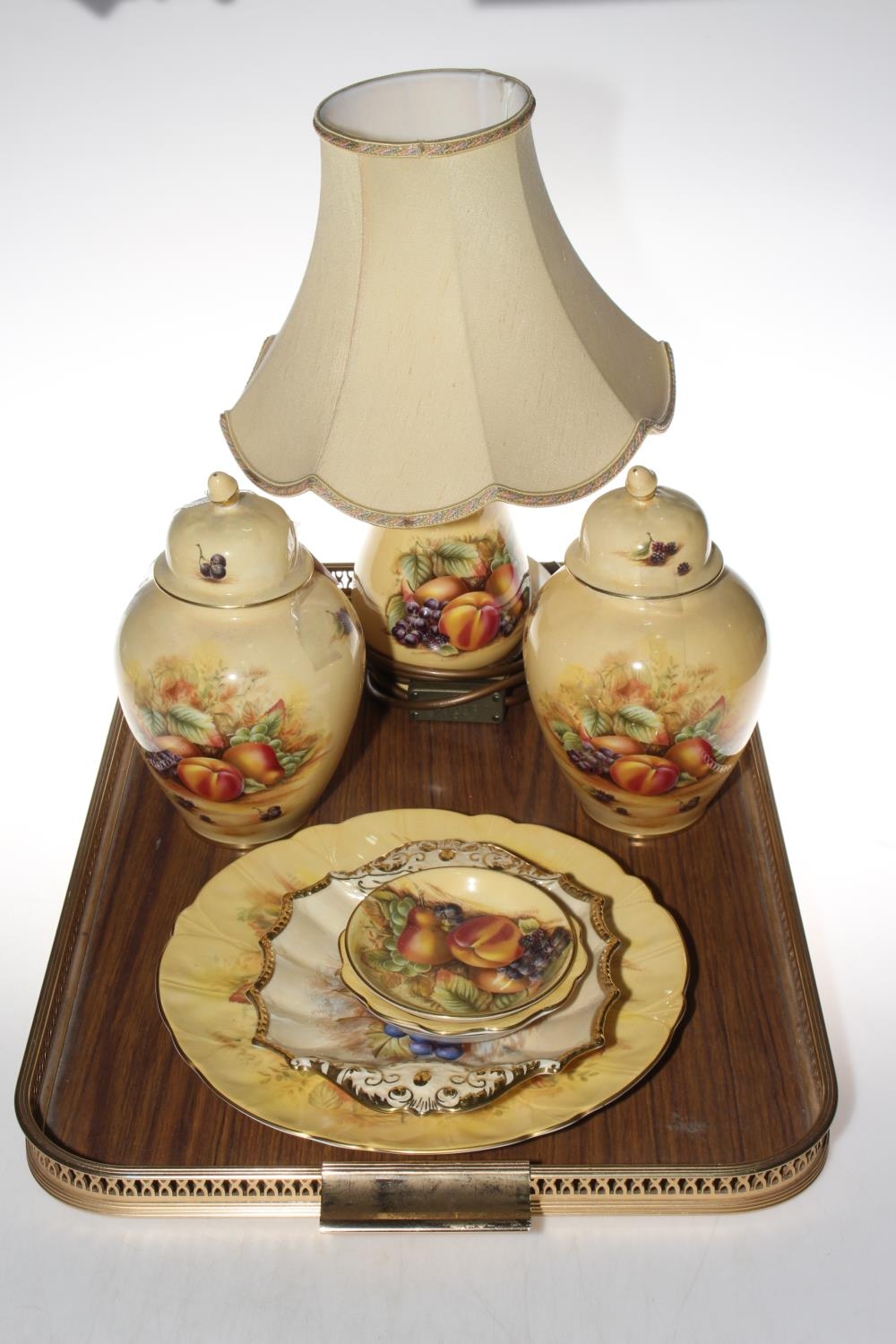 Aynsley Orchard Gold table lamp, pair of lidded vases, plate and three dishes.