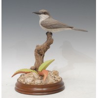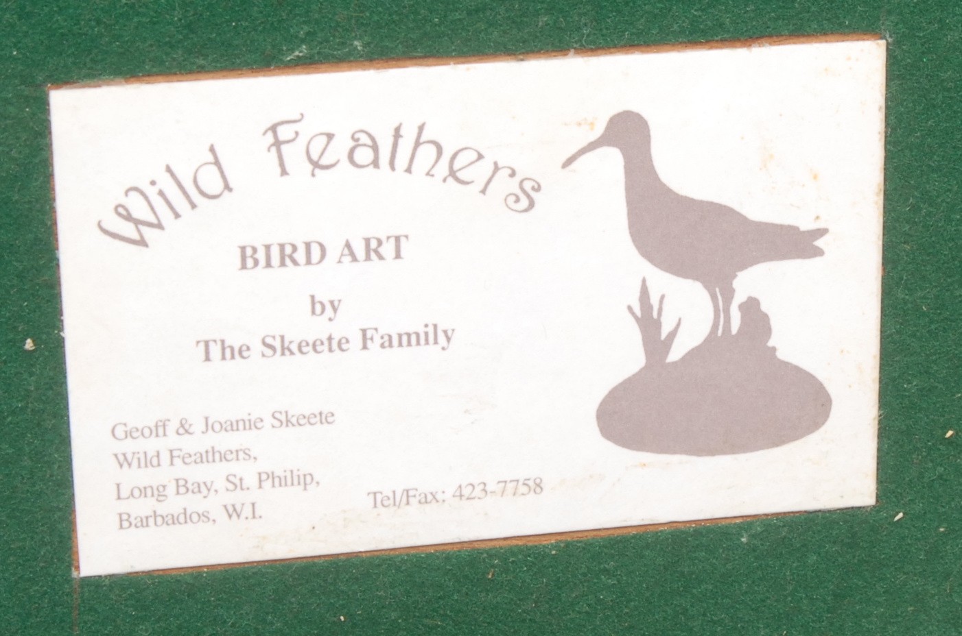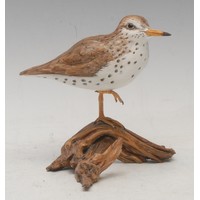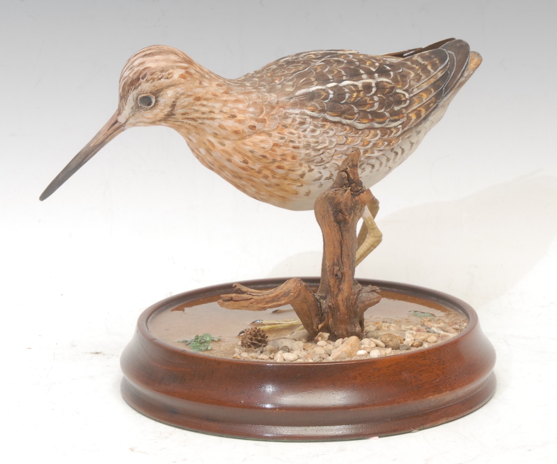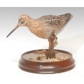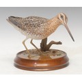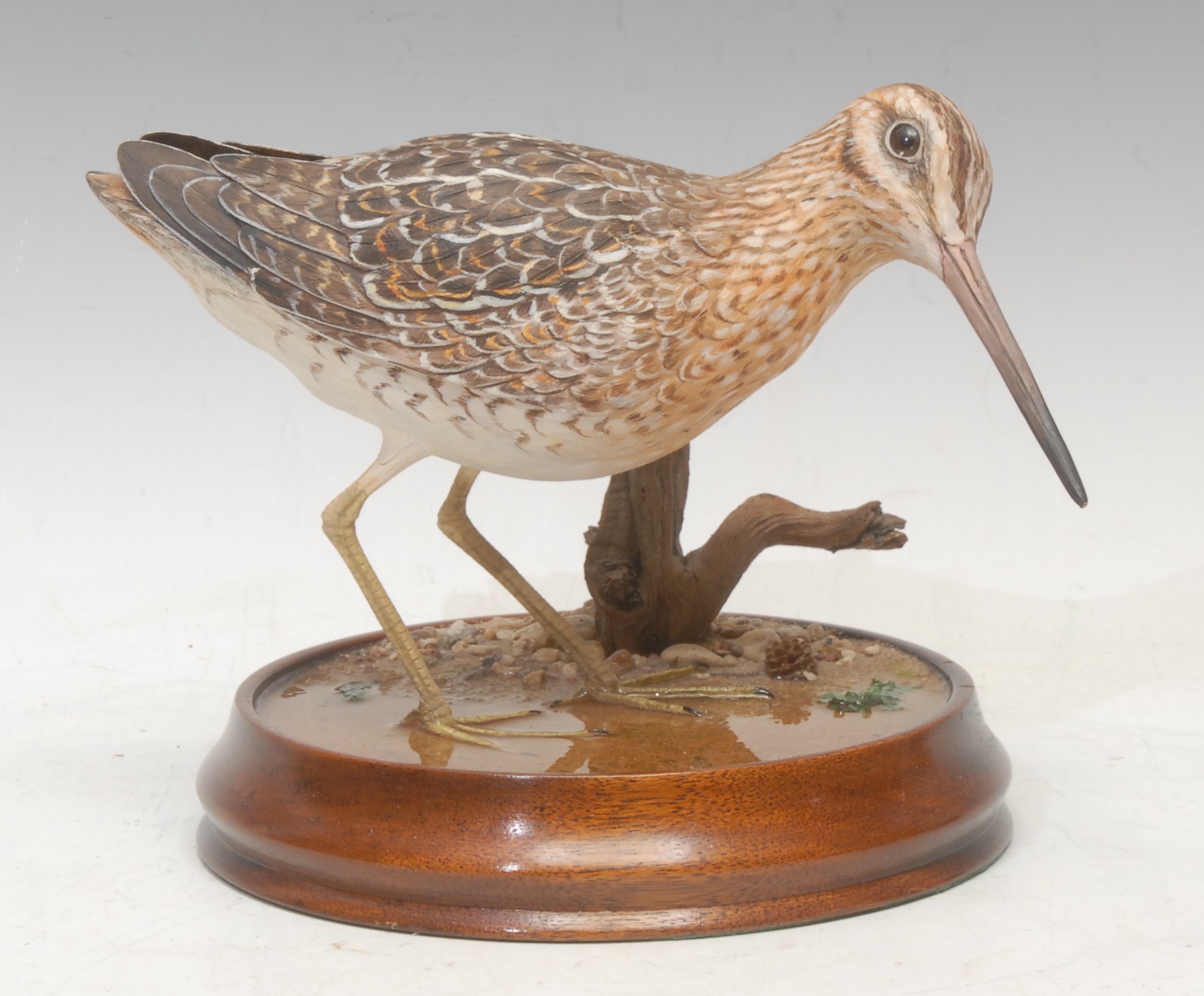 A Wild Feathers Bird Art finely carved wooden model or decoy, of a Snipe, by Geoff & Joanie Skeete, painted in polychrome, naturalistically mounted, circular hardwood base, 16cm high