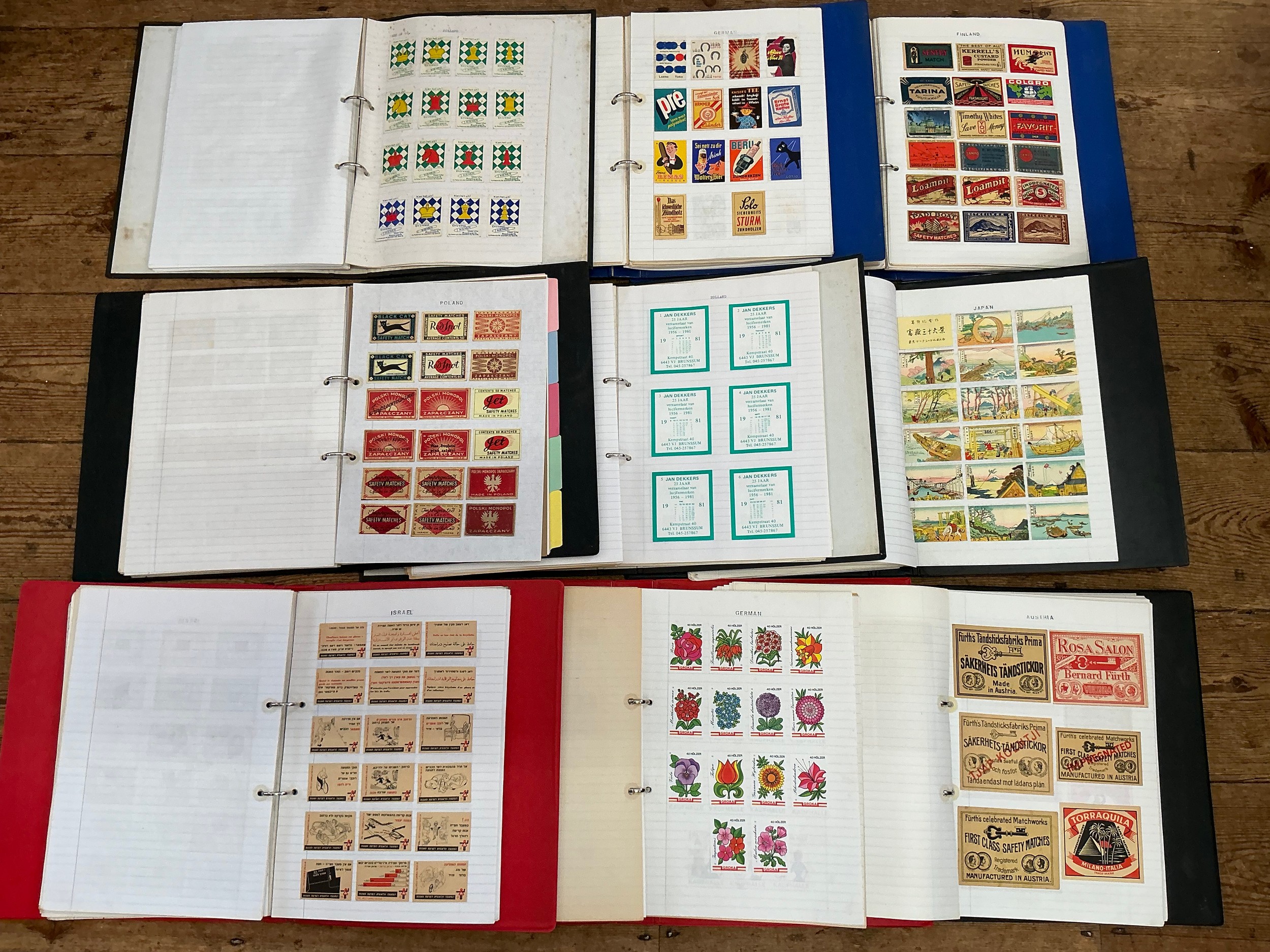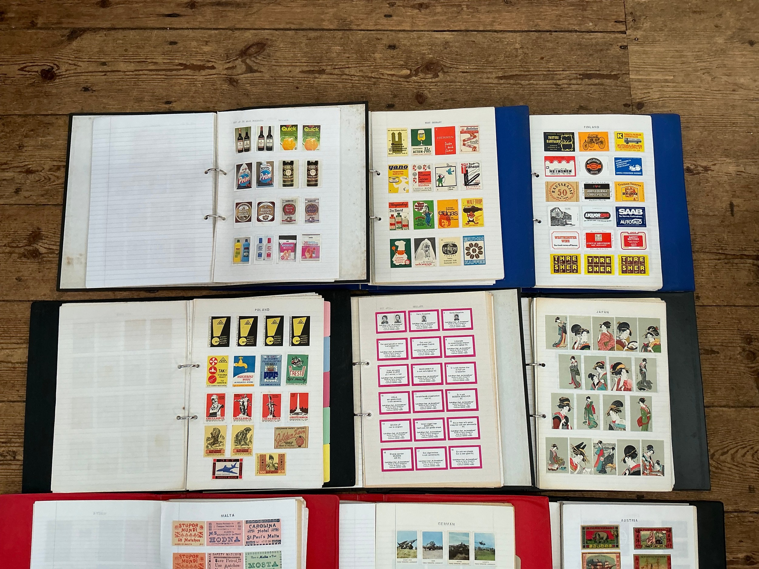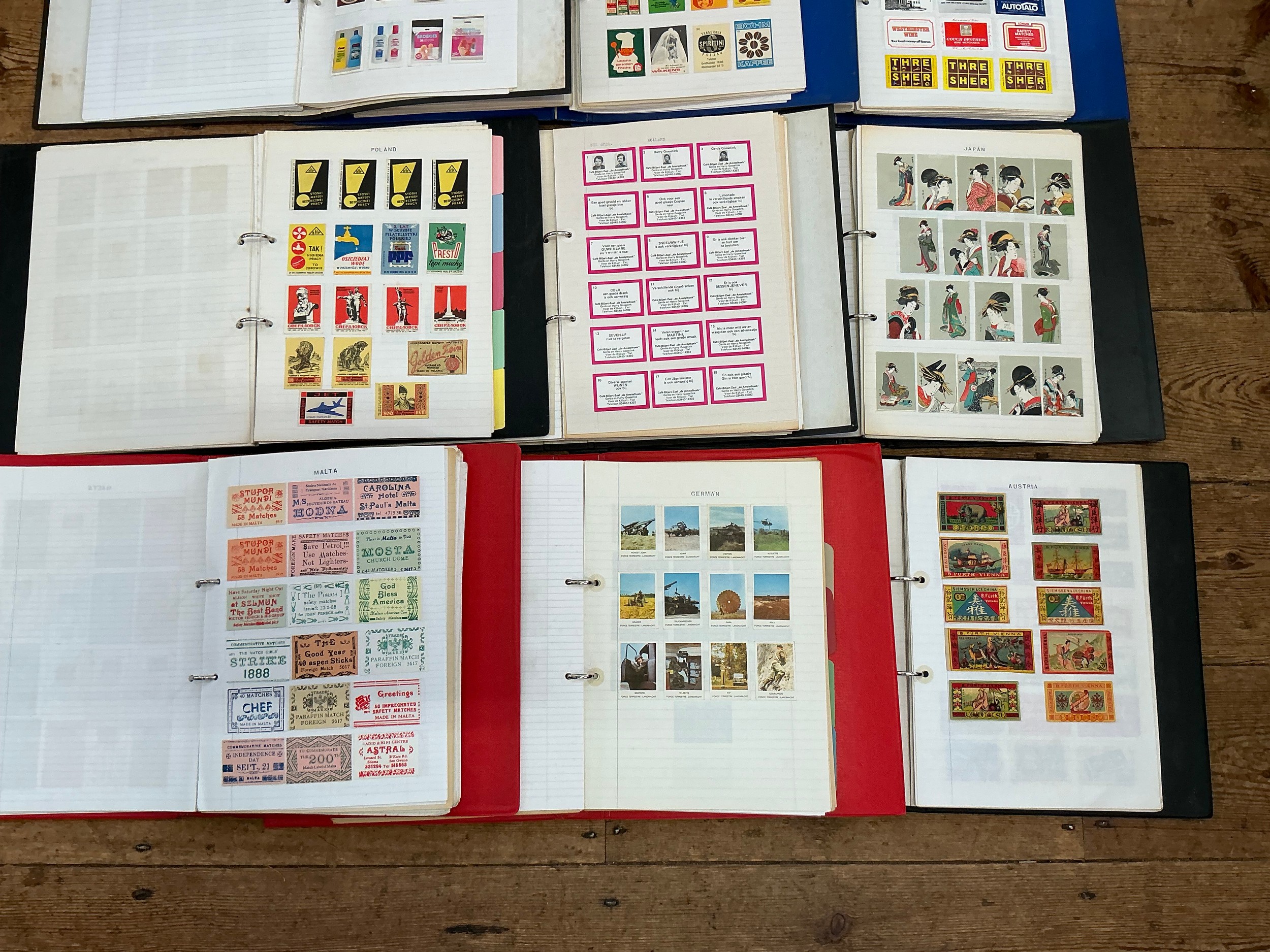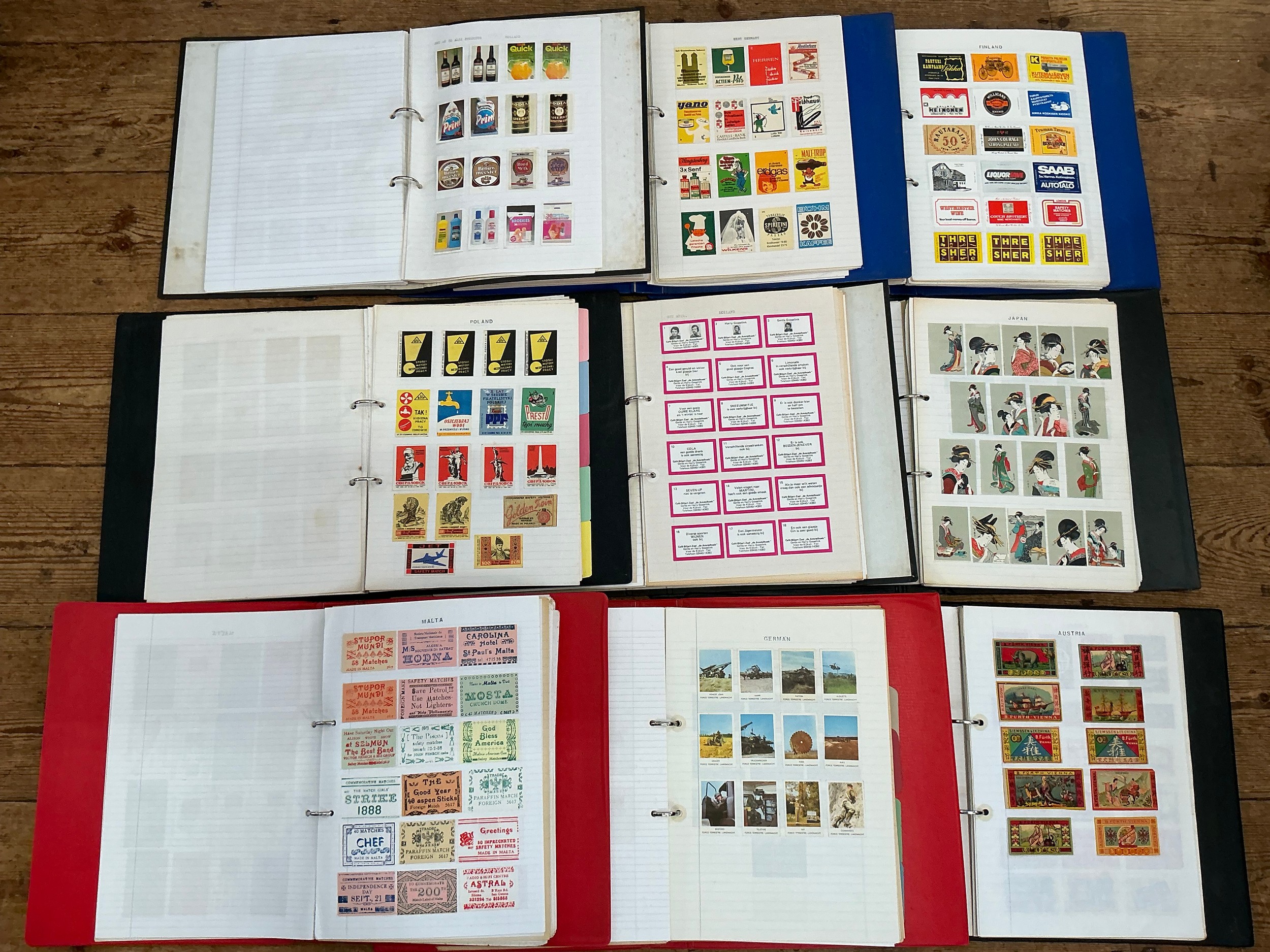 A Large Collection of Nine Albums of Vintage Matchbox Labels & Matchboxes from over the World to include Malta, Poland, Holland, Finland, West Germany, German, Austria, Japan, etc. Needs Viewing.