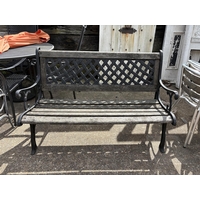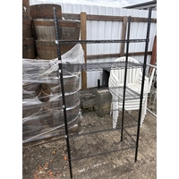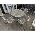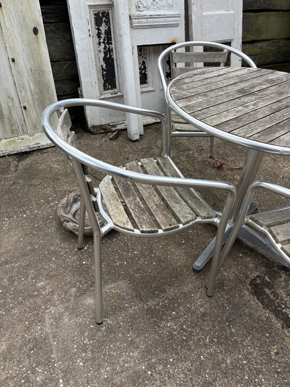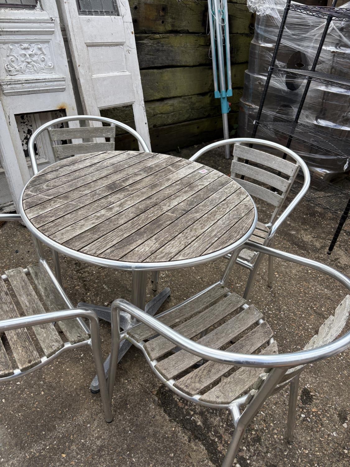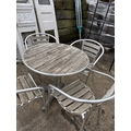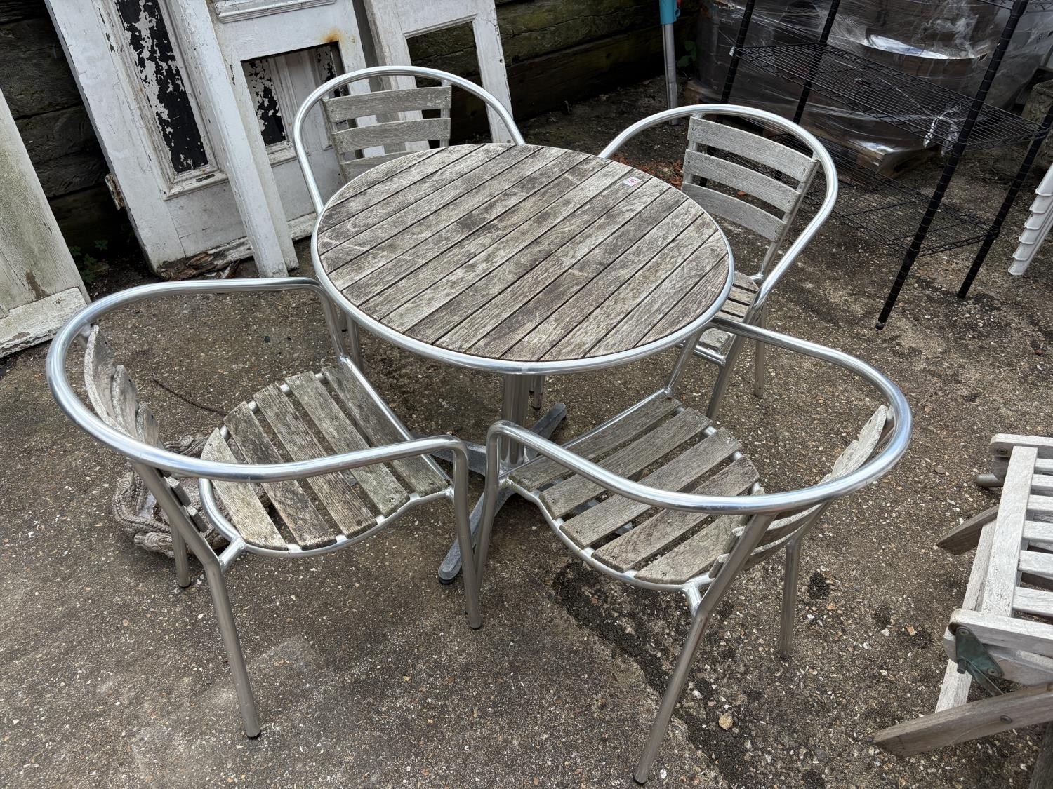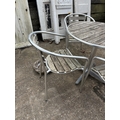 A modern aluminium bistro style table and four stacking chairs