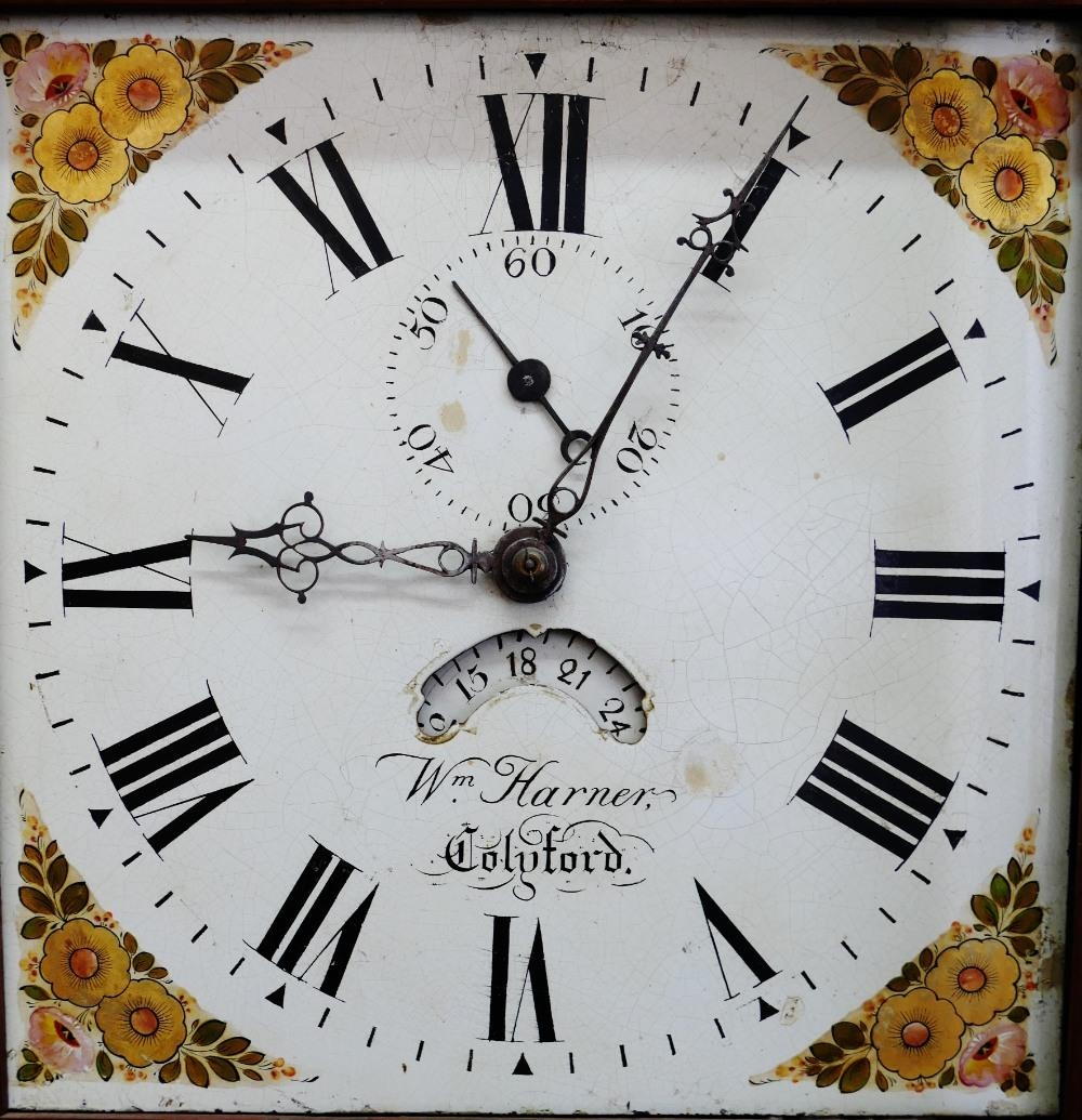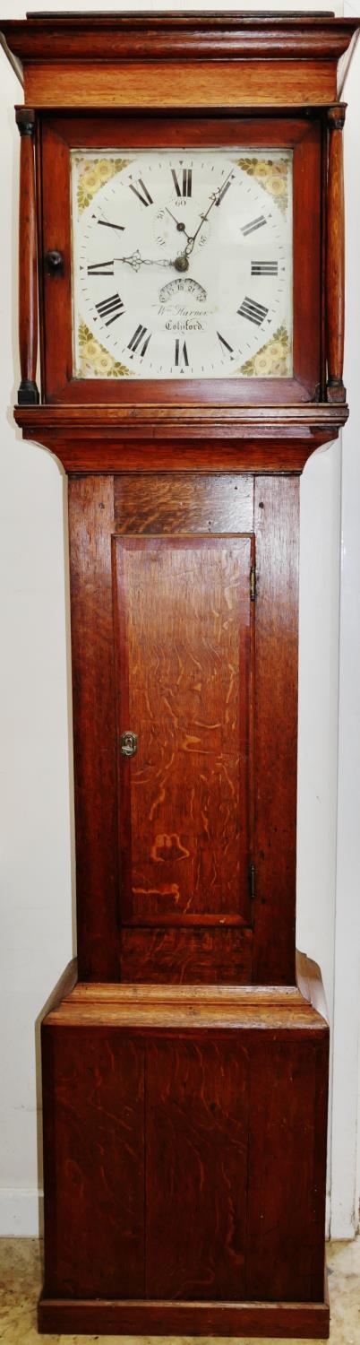 A George III 30 hour longcase clock by William Harner, Colyford, the painted face with date aperture and seconds dial, the movement striking on a bell, housed in oak case, 188cm high