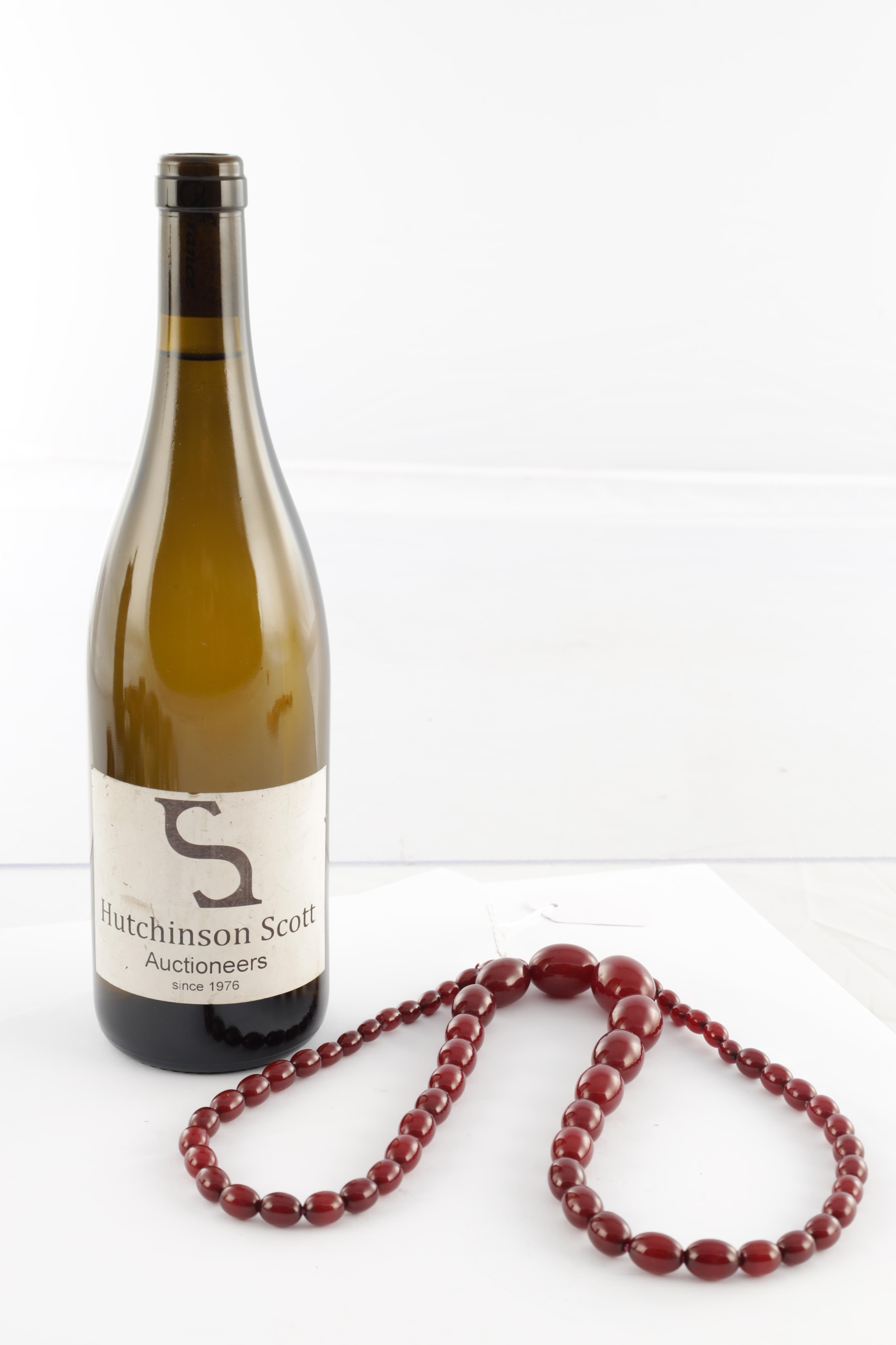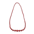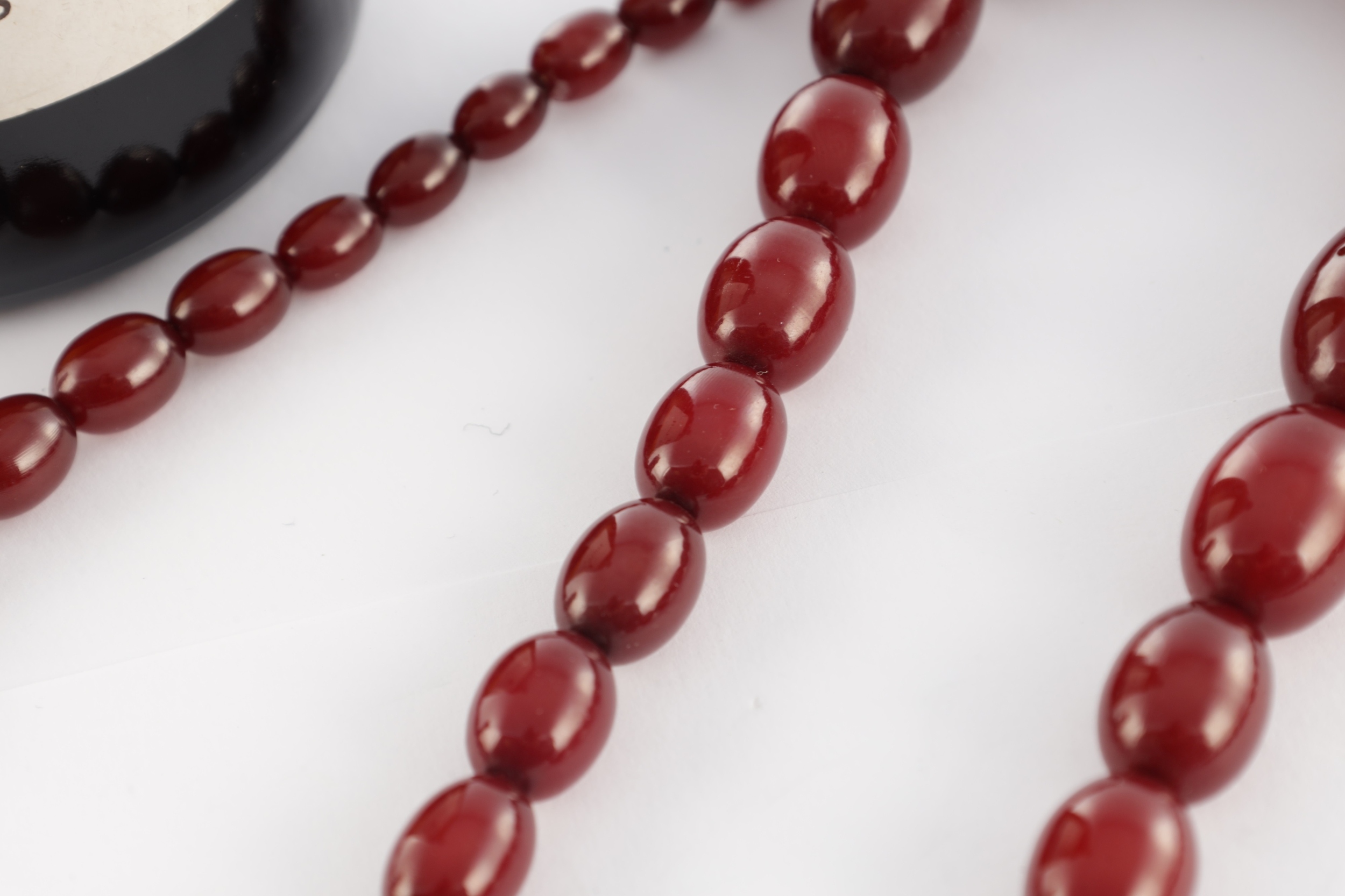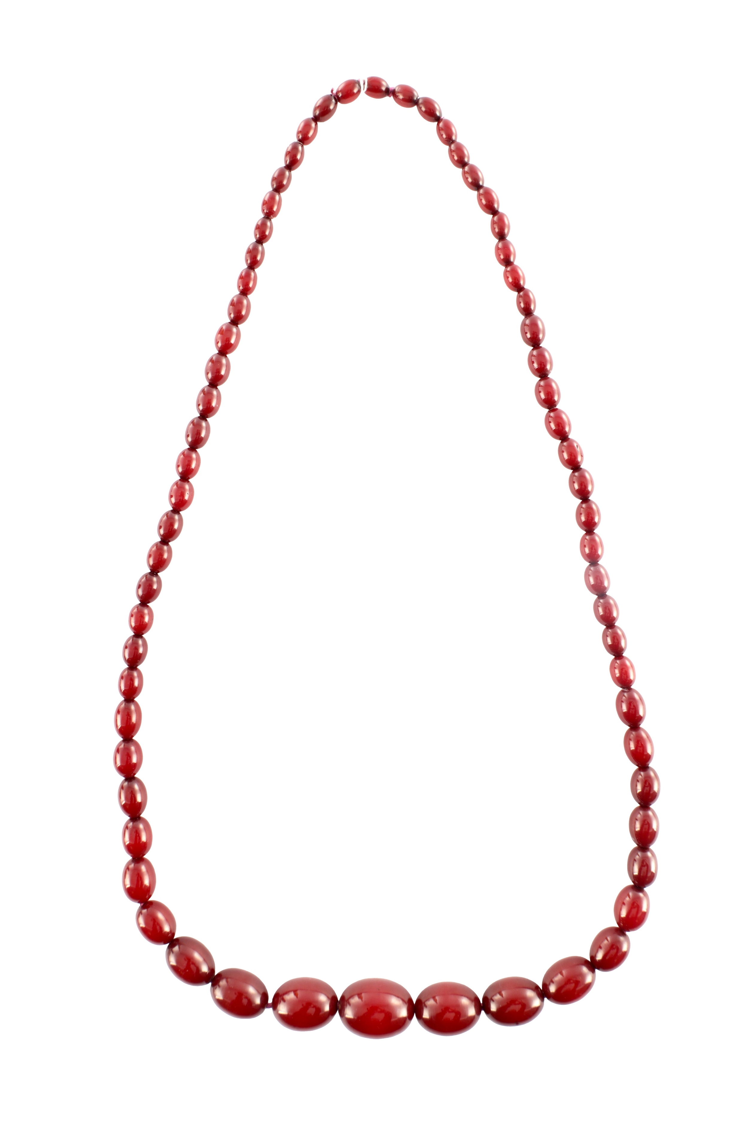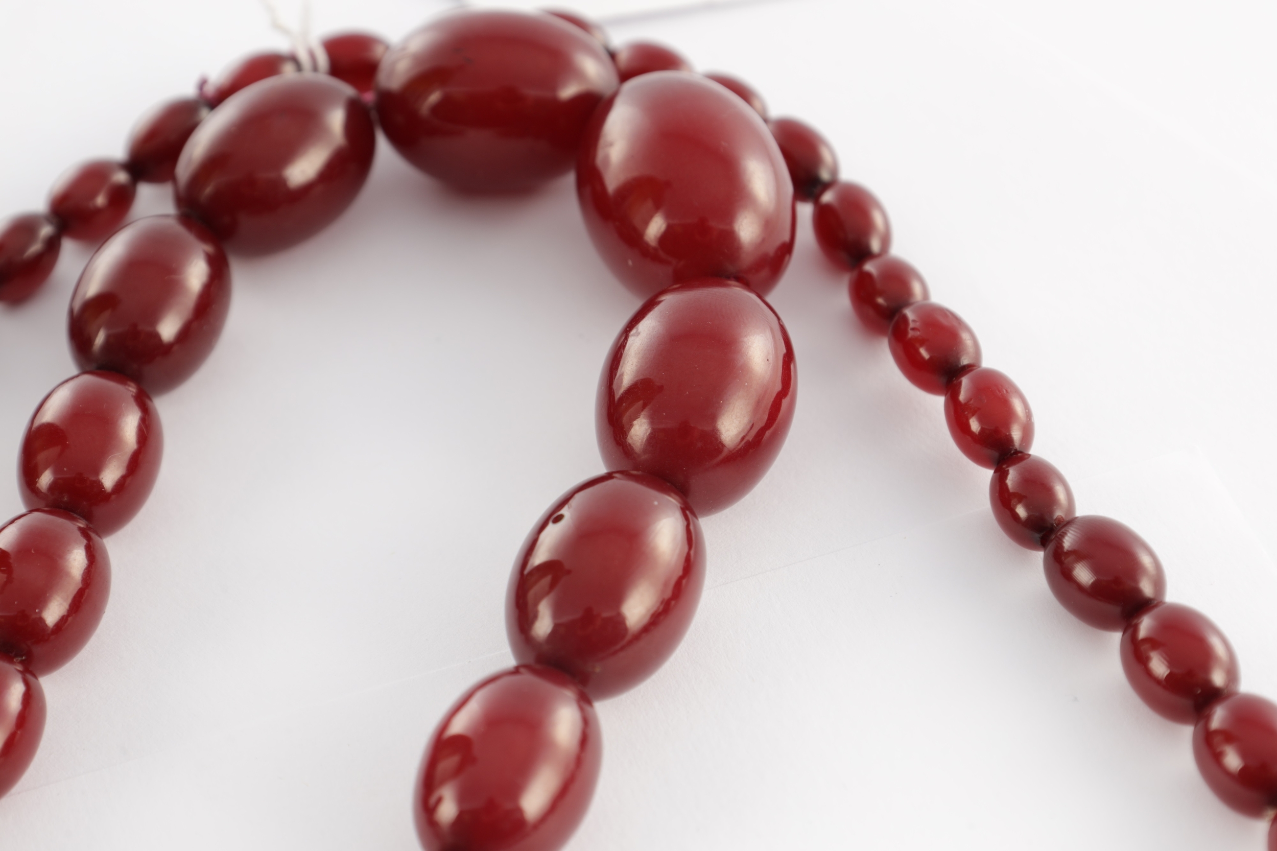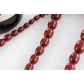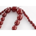 A GRADUATED CHERRY AMBER OVAL BEAD NECKLACE, with red string, largest bead measures 28mm long. Total weight 88g (app. 90cm long if opened)