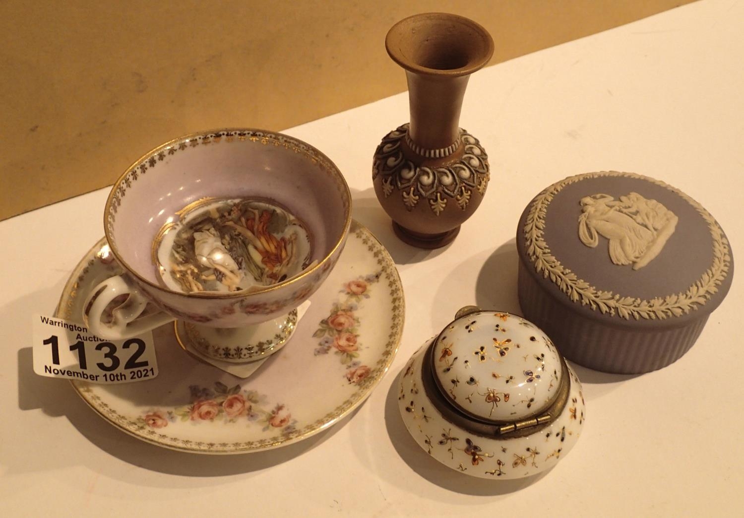 Miniature ceramics including Royal Doulton, Wedgwood and an antiquelidded pot. P&P Group 2 (£18+VAT for the first lot and £3+VAT for subsequent lots)