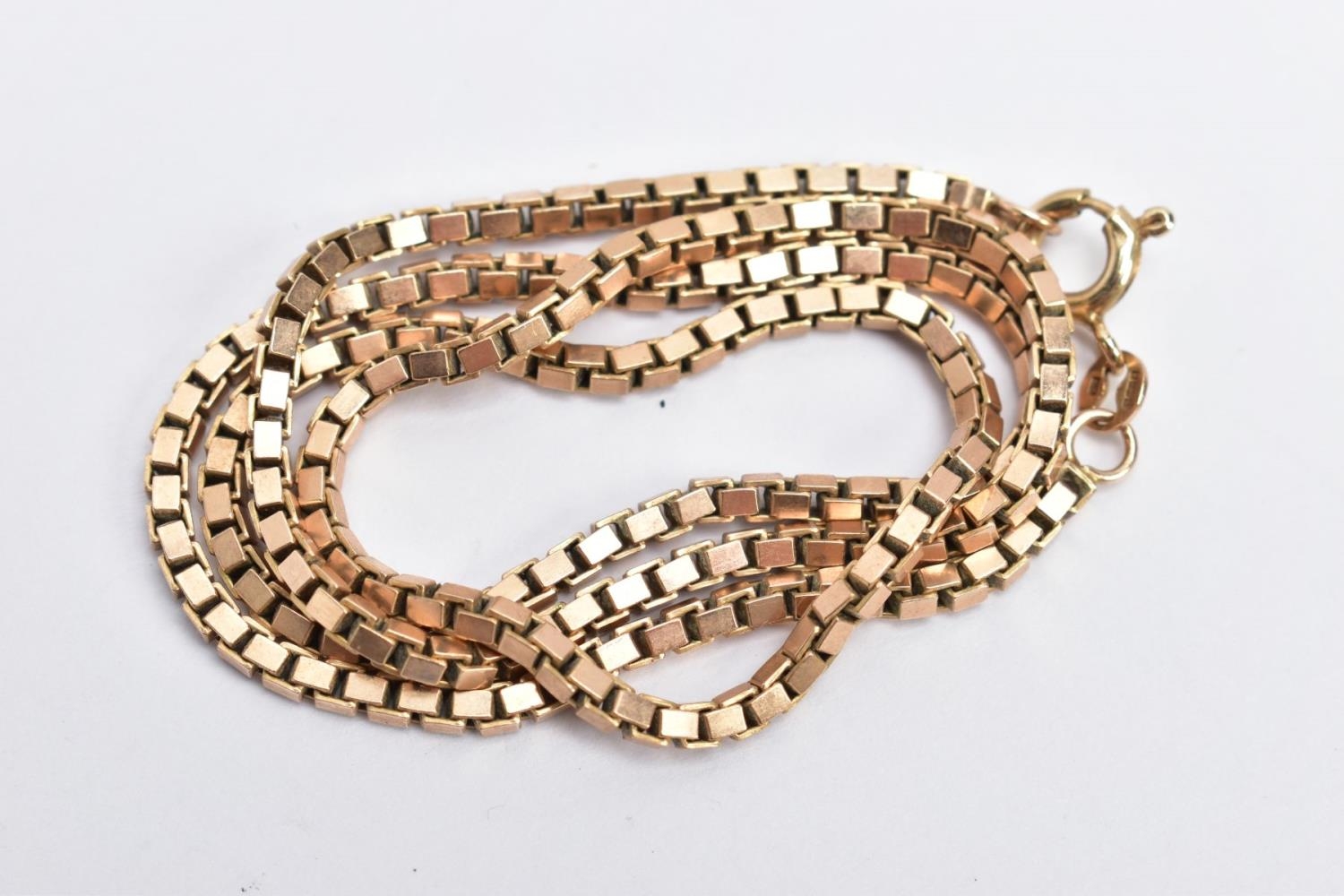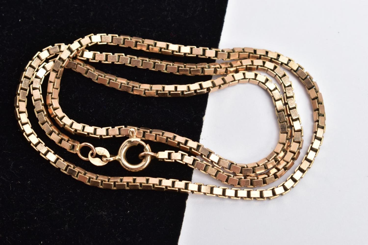 A 9CT GOLD BOX LINK CHAIN, the box link chain fitted with a spring clasp, hallmarked 9ct gold Sheffield import, length 440mm, approximate gross weight 15.1 grams (condition report: general light wear, clasp in working condition)