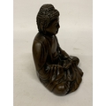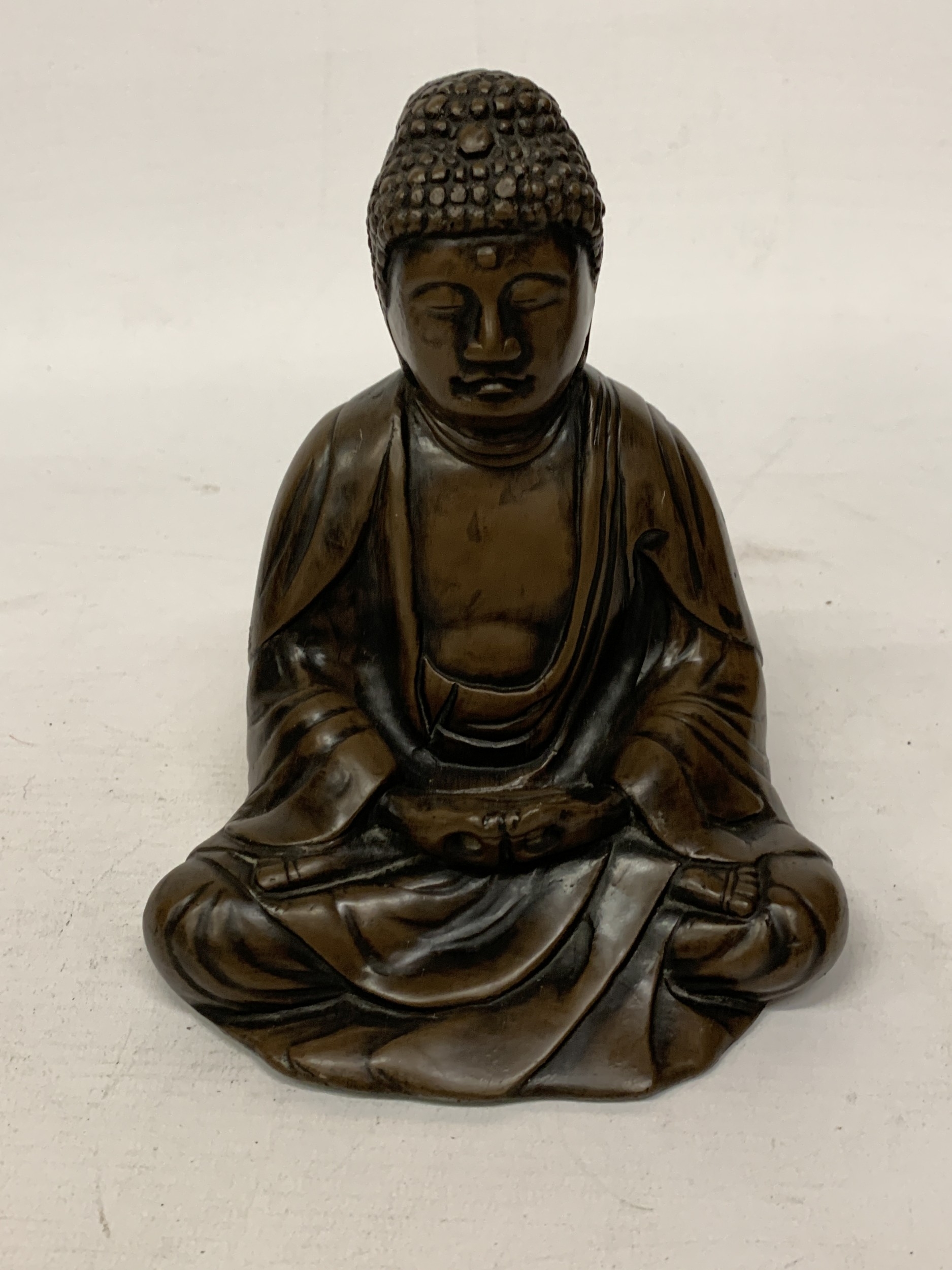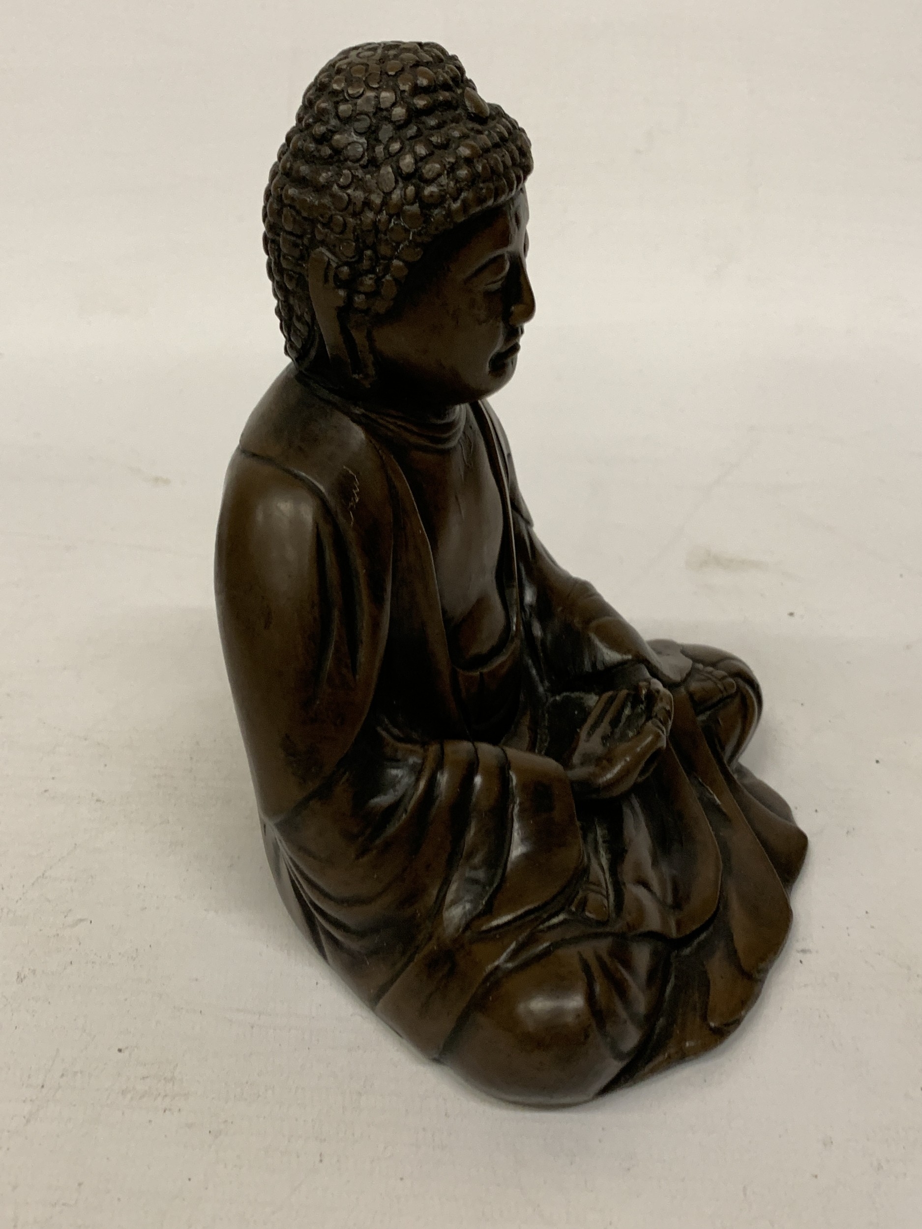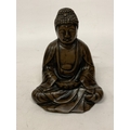 A BRONZE SEATED BUDDHA IN A MEDITATIVE POSTURE WITH A BROWN PATINA FINISH - 16.5 CM