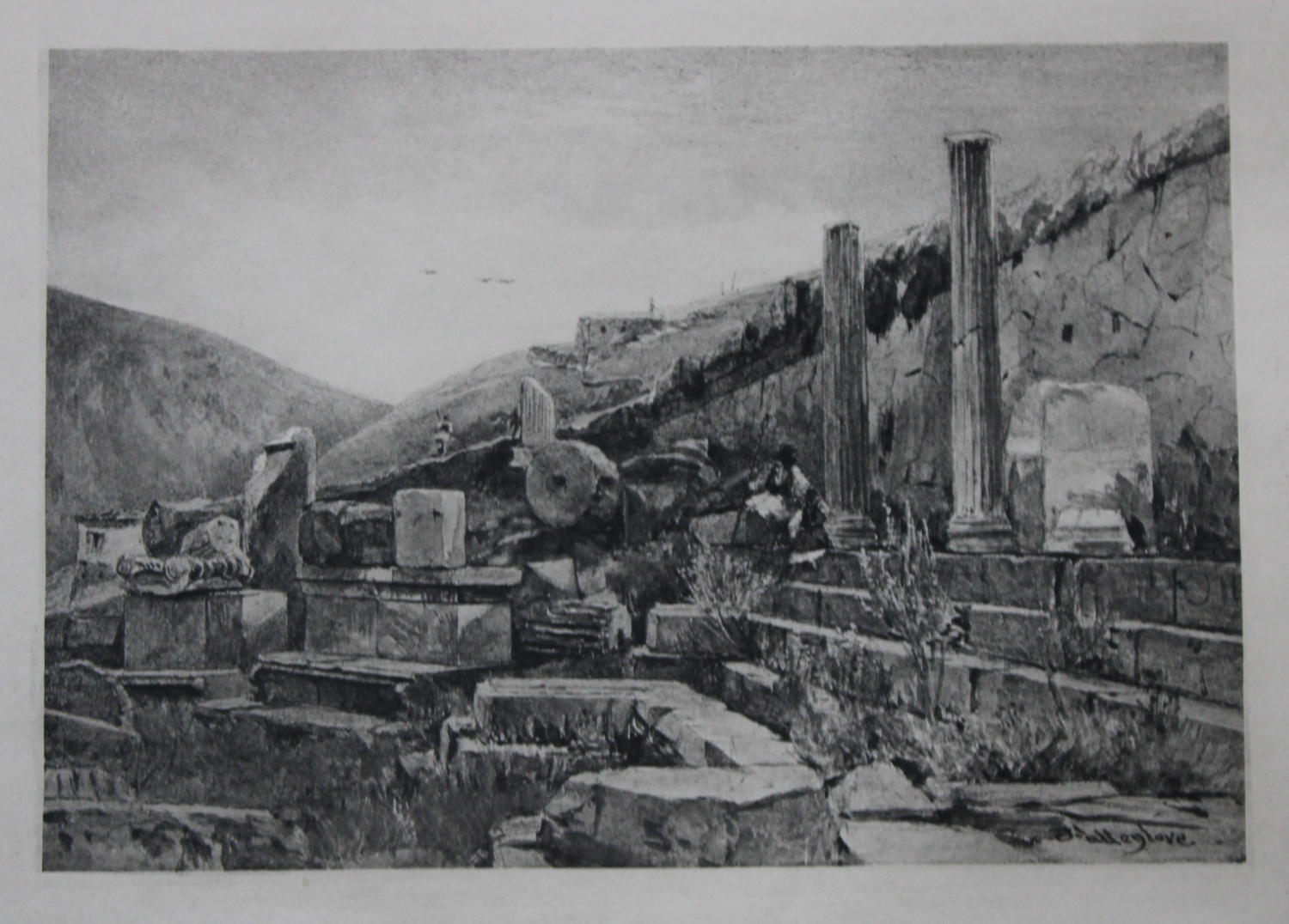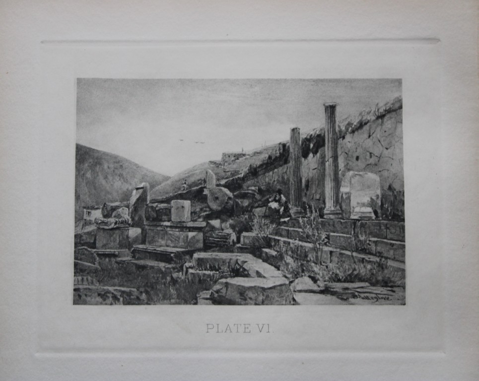 John Fulleylove 1897 - Etching of Treasury of the Athenians at Delphi. This superb etching is from Pictures of Classic Greek Landscapes and Architecture by John Fulleylove RI. Published by JM Dent & Co, London 1897.