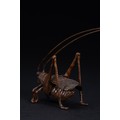Cast in bronze and modelled as a long-horned grasshopper shown in a naturalistic standing pose. The figure is finely detailed, with elongated antennae extending forward in a sweeping arc, slender articulated legs, and carefully defined wing covers resting along the body. The thorax and abdomen are subtly segmented, with surface modelling that captures the texture and structure of the insect.