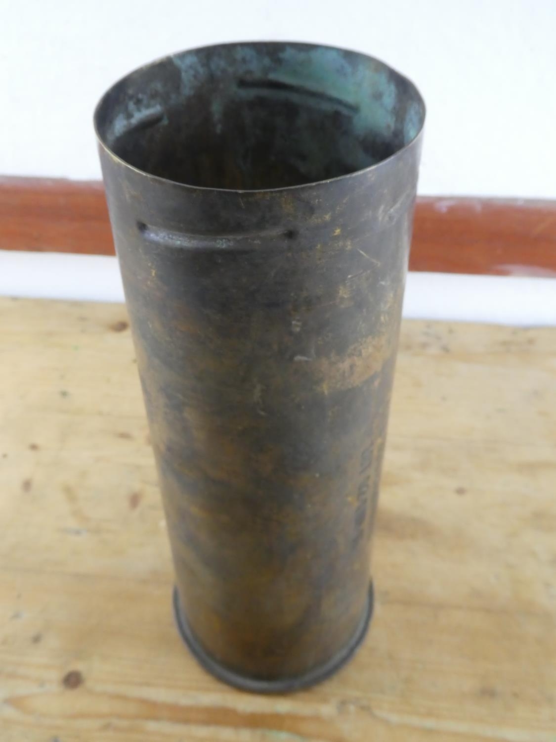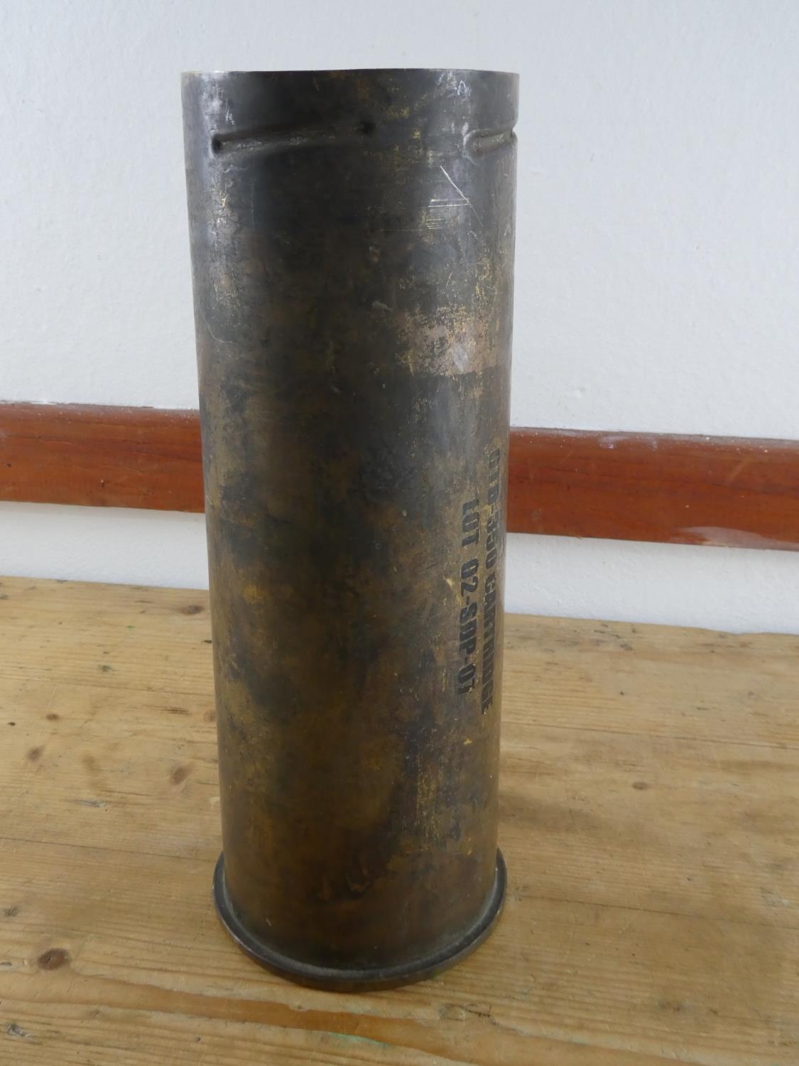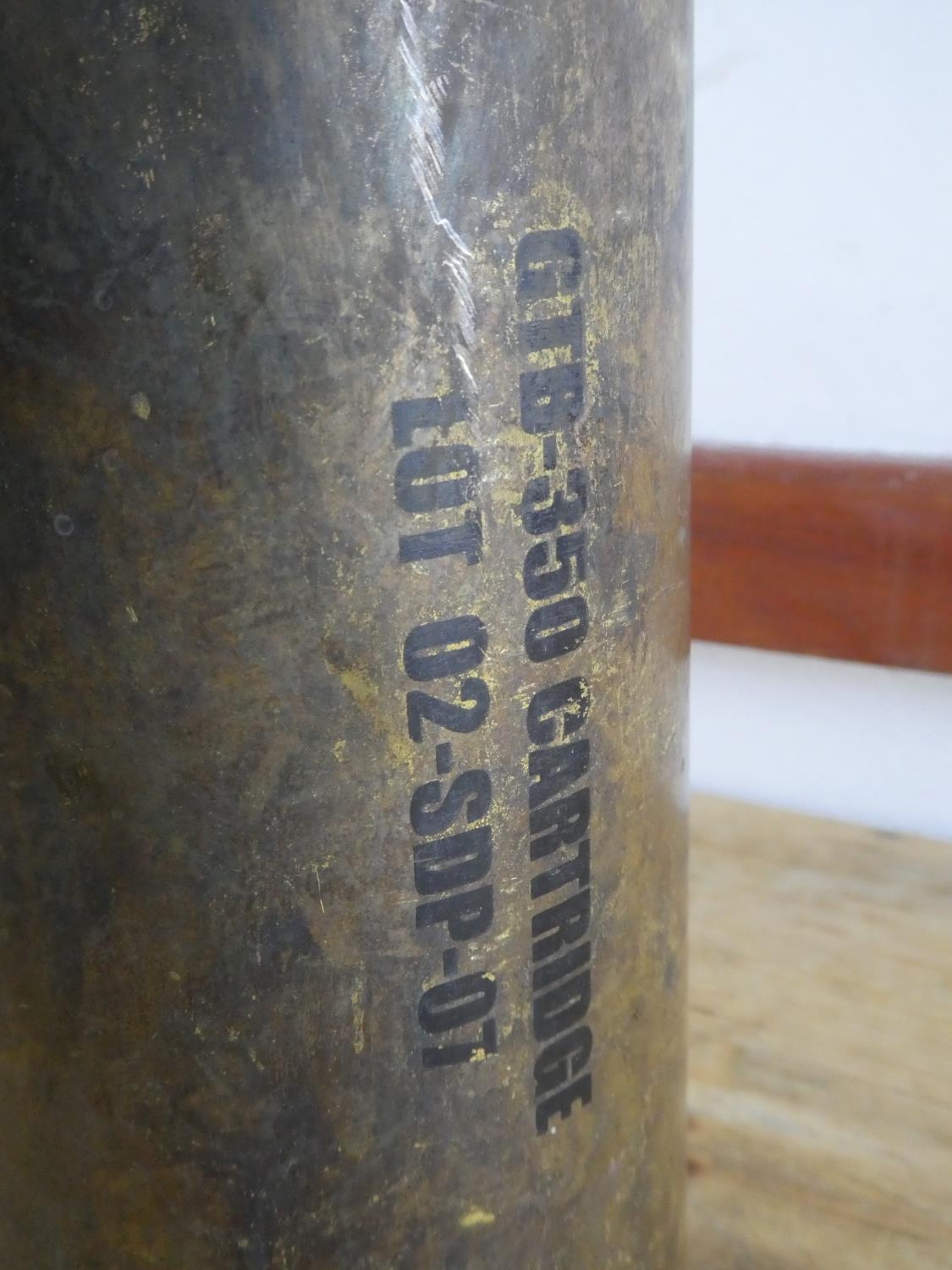 A large brass shell case - GTB 350 cartridge - Lot 02-SDP-07, measuring 32cm tall.