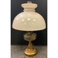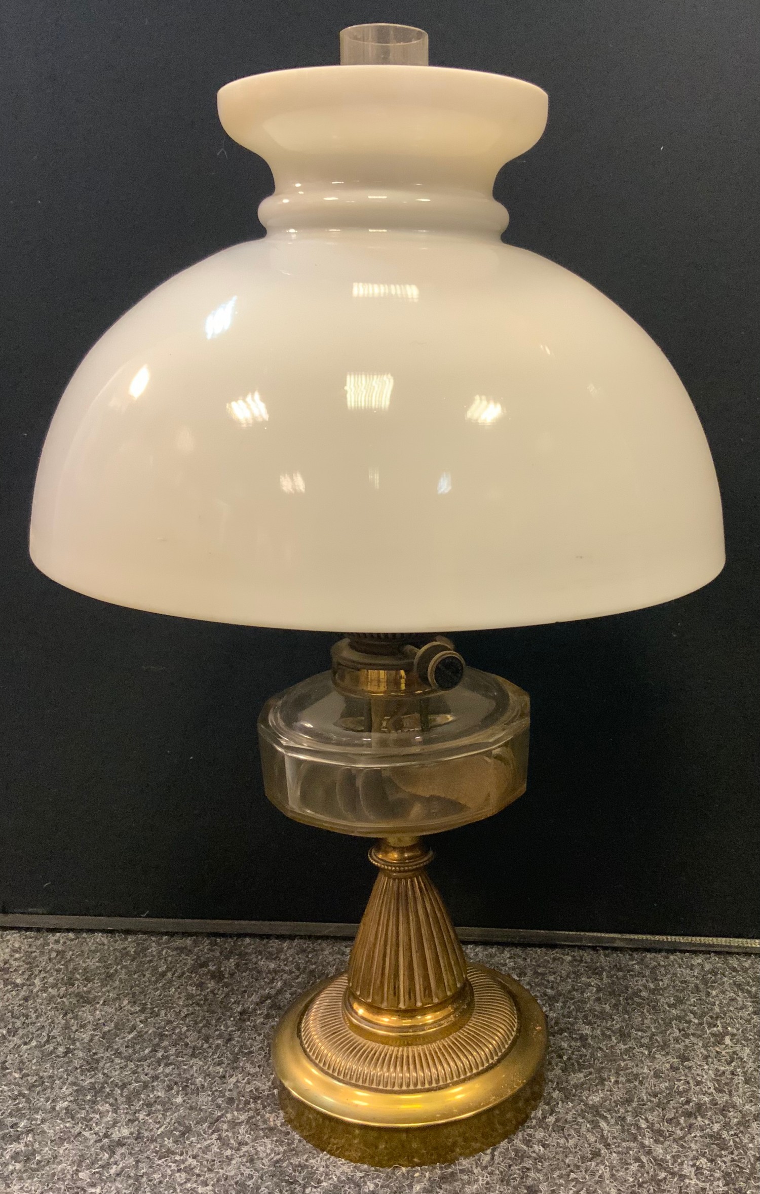 A Victorian Harrods Messenger Stores brass and clear glass oil lamp, opaque glass shade, 54cm high