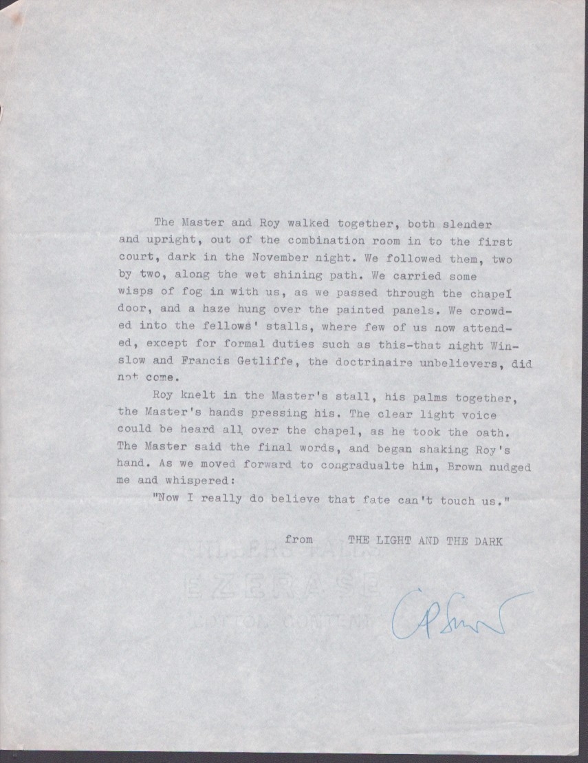 C P Snow signed typed excerpt from Novel The Light and the Darkness from Novel Series Strangers and Brothers.