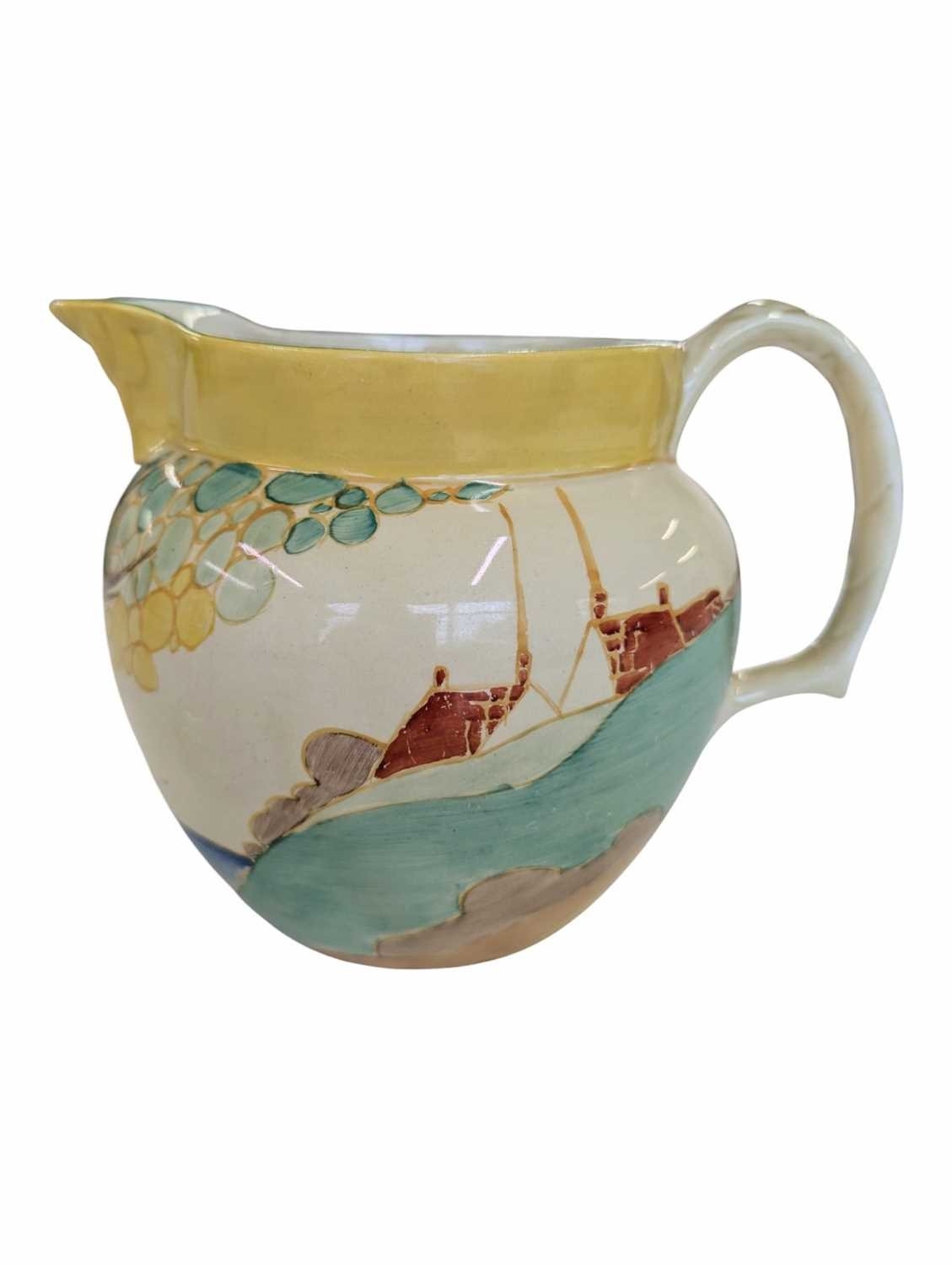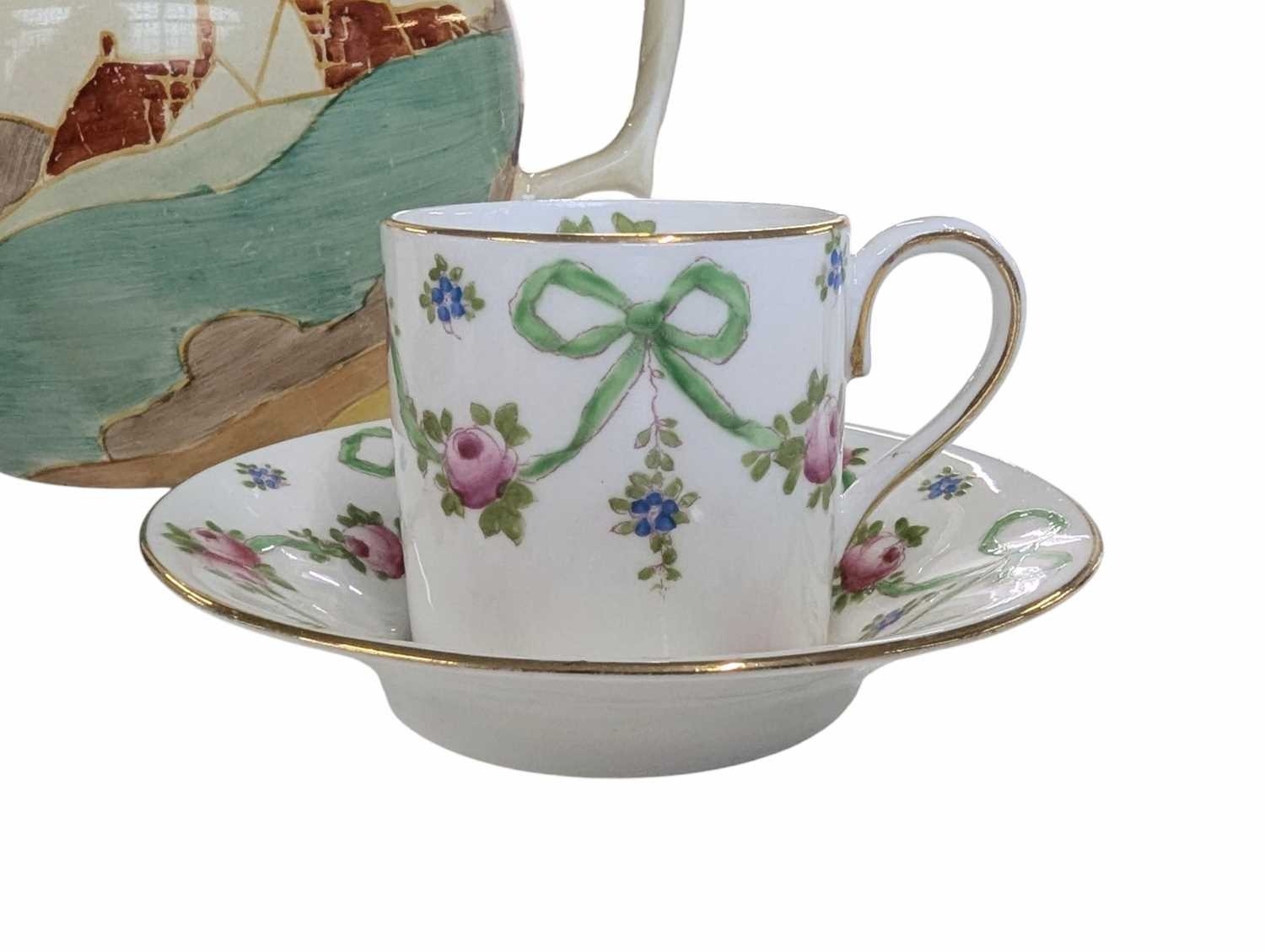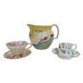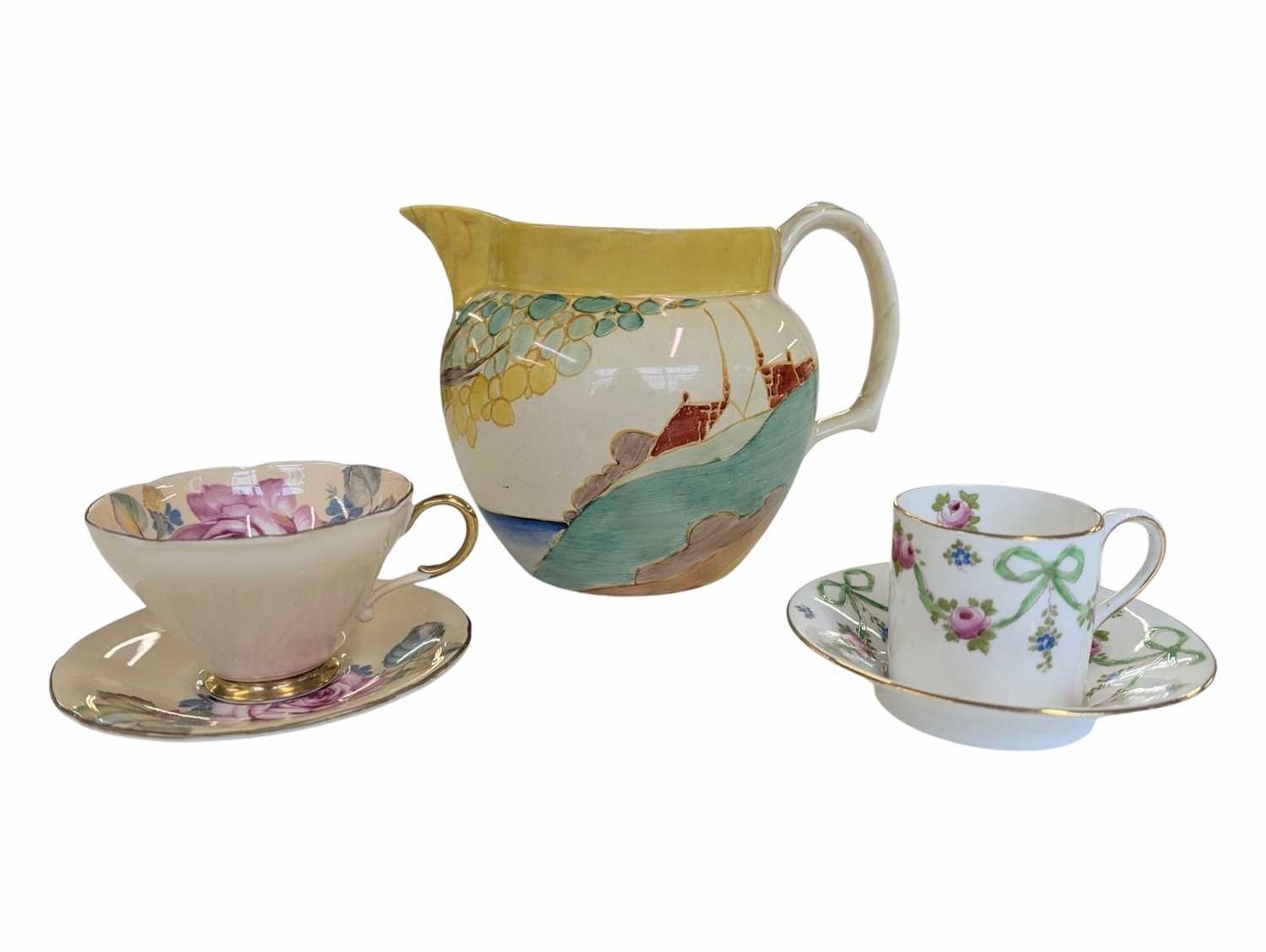 Early 20th century Clarice Cliff pottery jug accompanied by a Paragon tea cup and saucer, and a Crown Staffordshire coffee cup and saucer. Clarice Cliff jug decorated in the Secrets pattern. Crown Staffordshire coffee cup and saucer decorated in a green swags / ribbon and roses. Largest measuring approx. 14cm tall. Sold as seen.