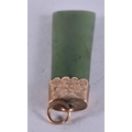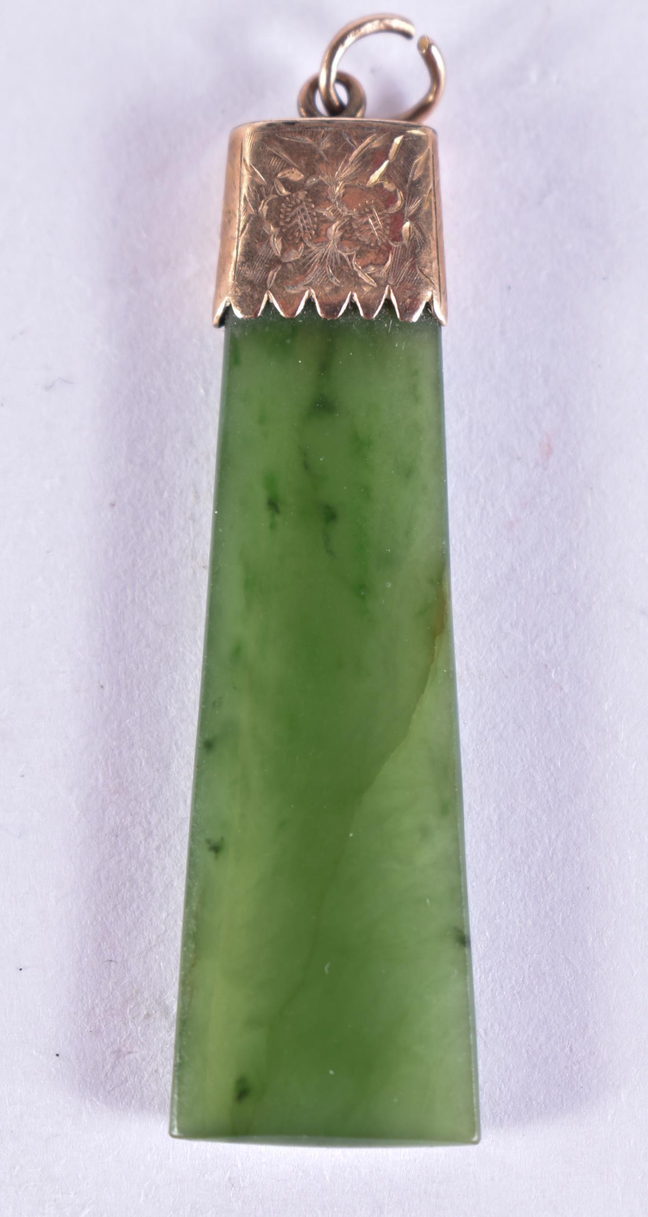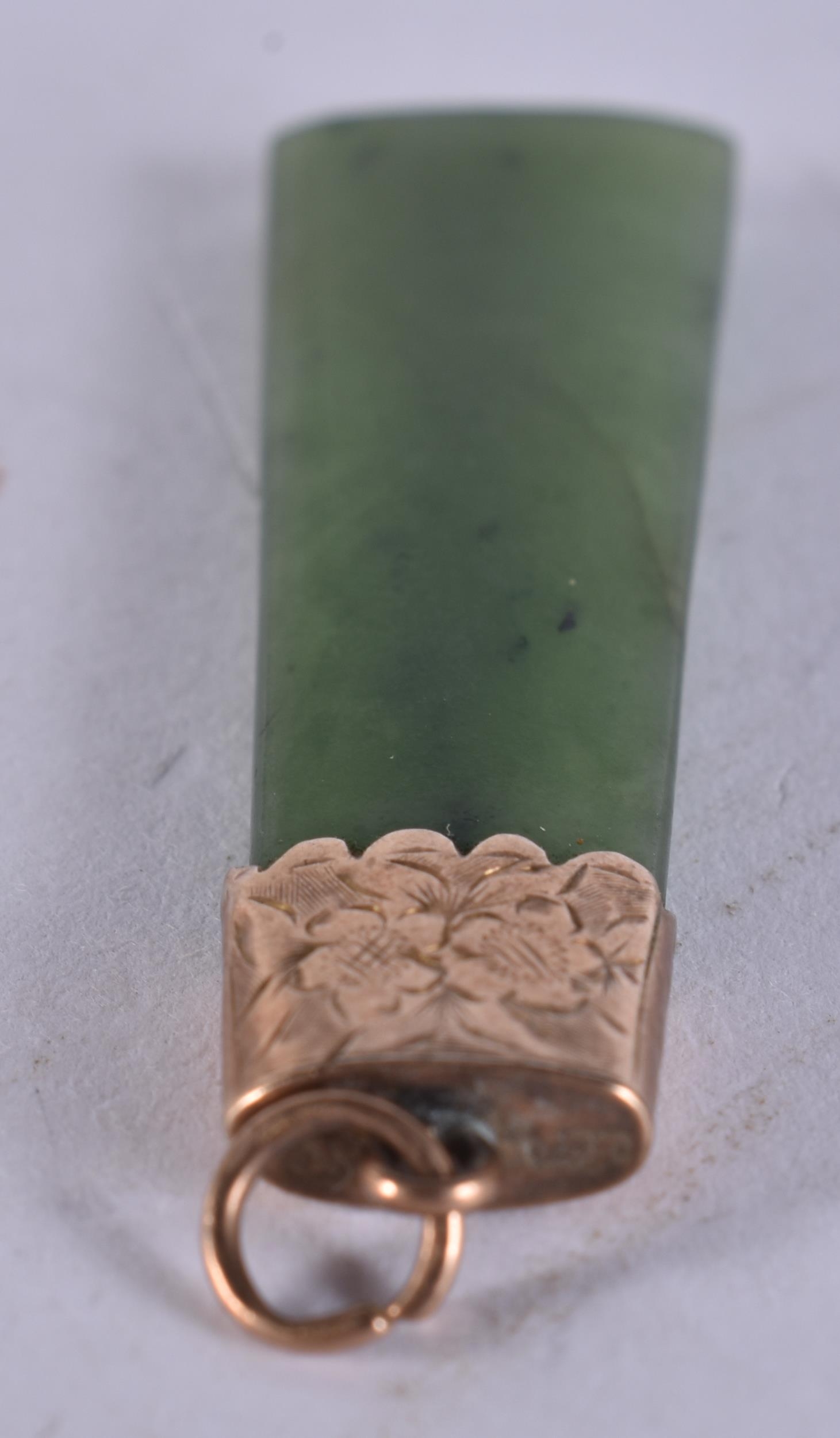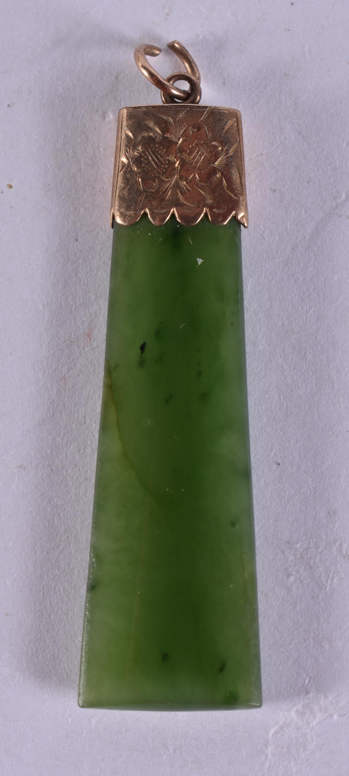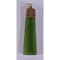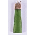 A 9CT GOLD MOUNTED JADE PENDANT. 5 grams. 4.75 cm x 1.25 cm.
