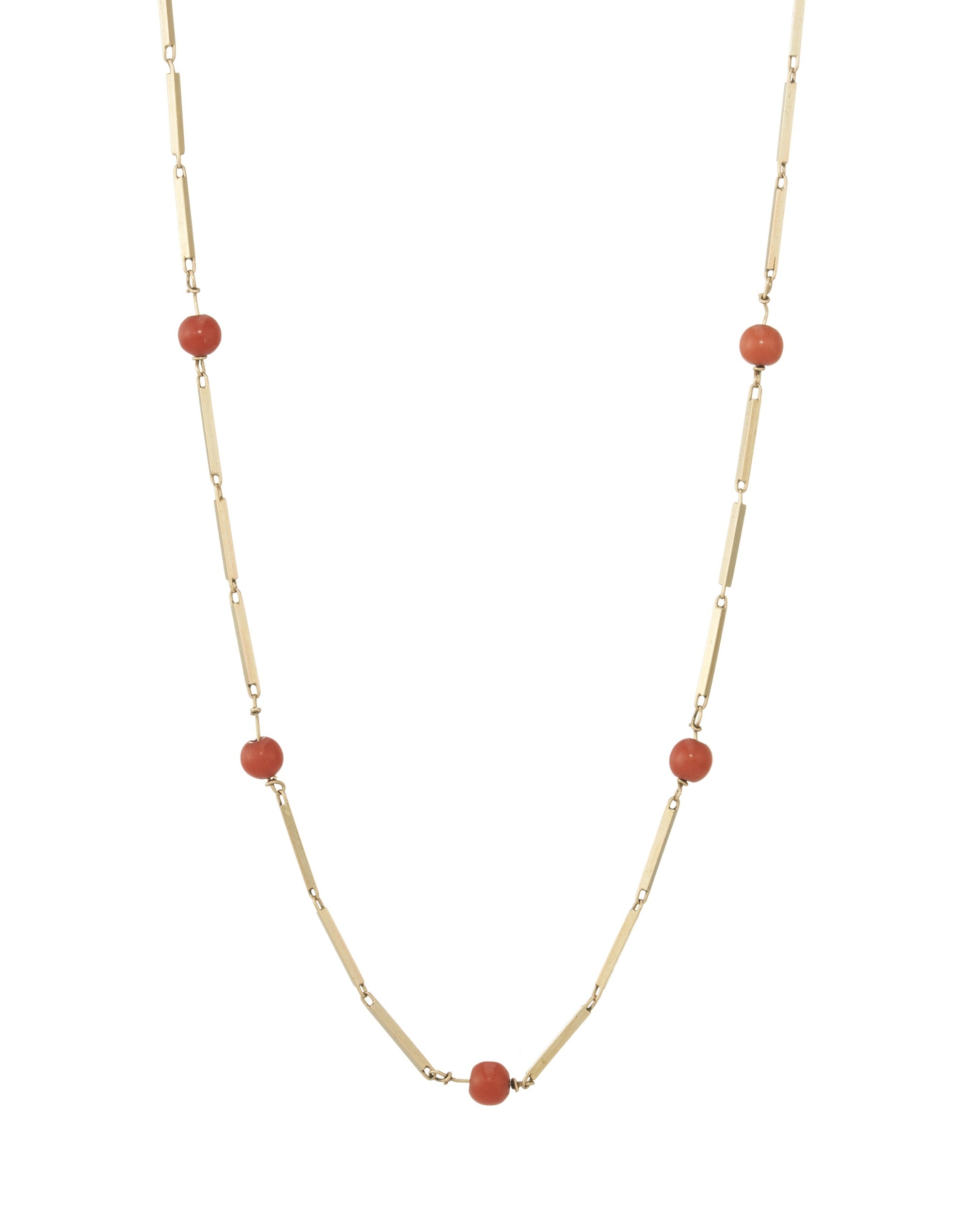 A 9ct gold baton-link and coral bead necklace, beads measure approximately 5mm, import marks for Sheffield, length 62cm, 9.6g