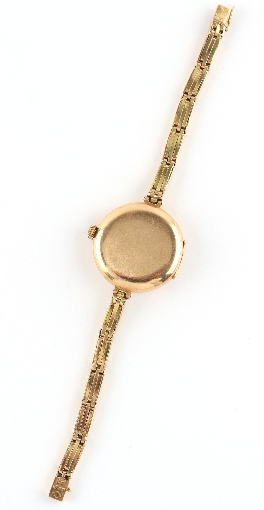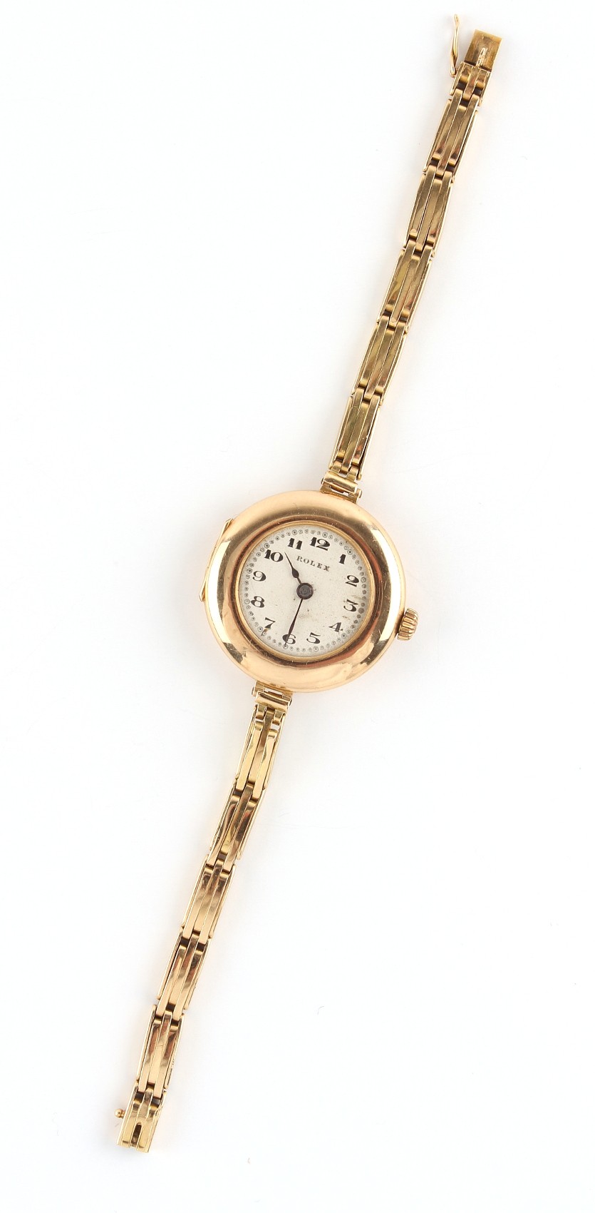 Property of a lady - a lady's early 20th century Rolex 15ct gold wristwatch, with Rolex 15-jewel movement, the dust cover also 15ct gold, import marks for London 1919, 27mm diameter, appears to be working but no guarantees are given, on 15ct gold elasticated bracelet strap, approximately 23.4 grams (gross).