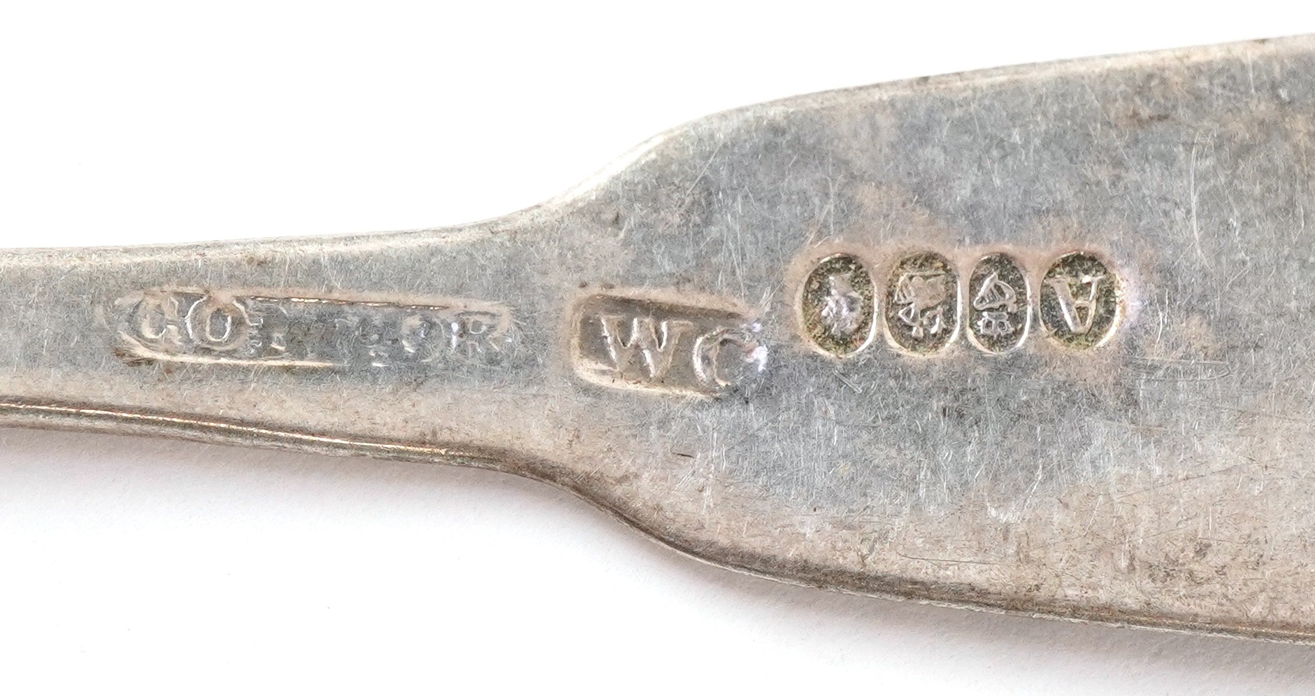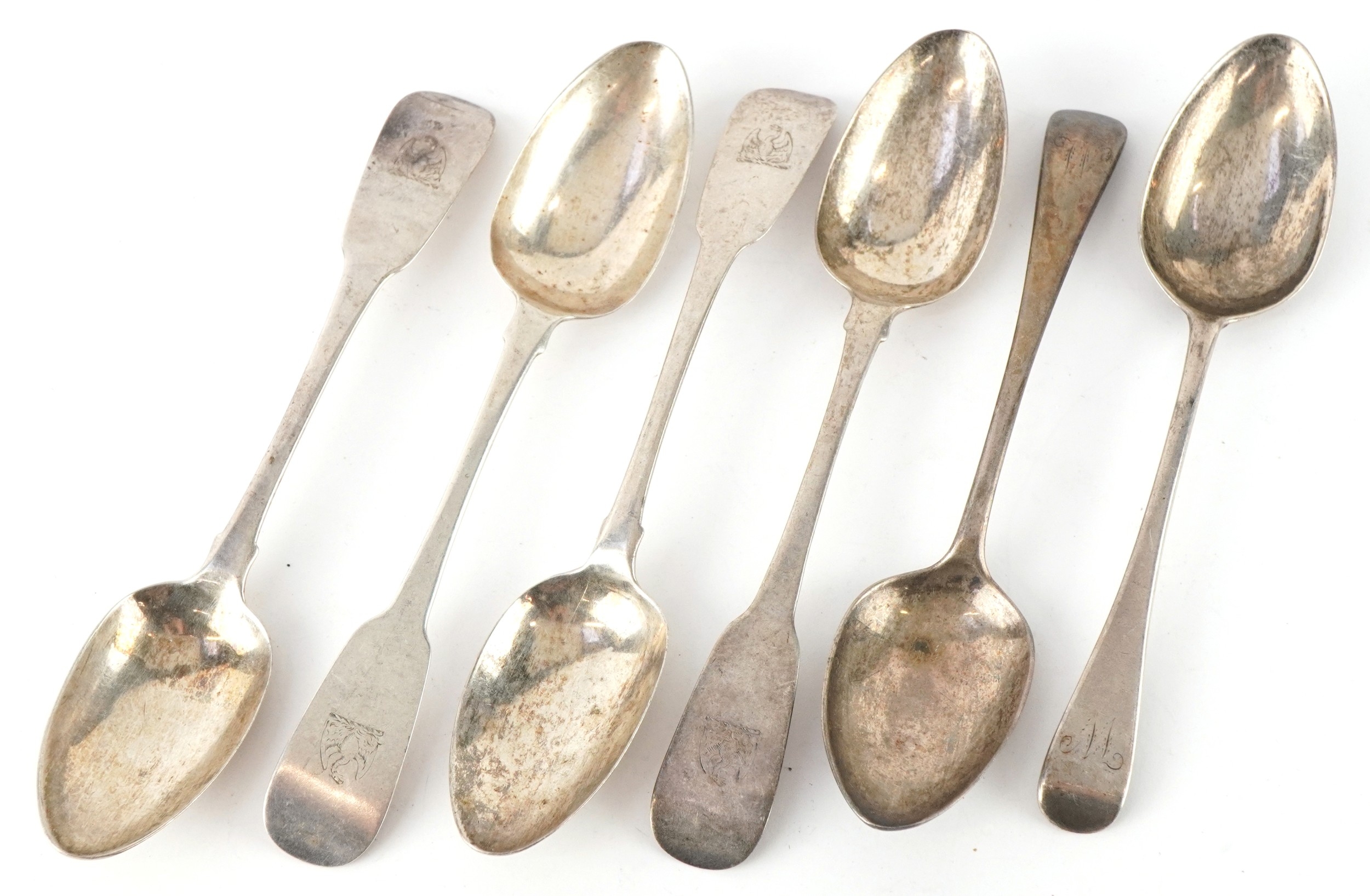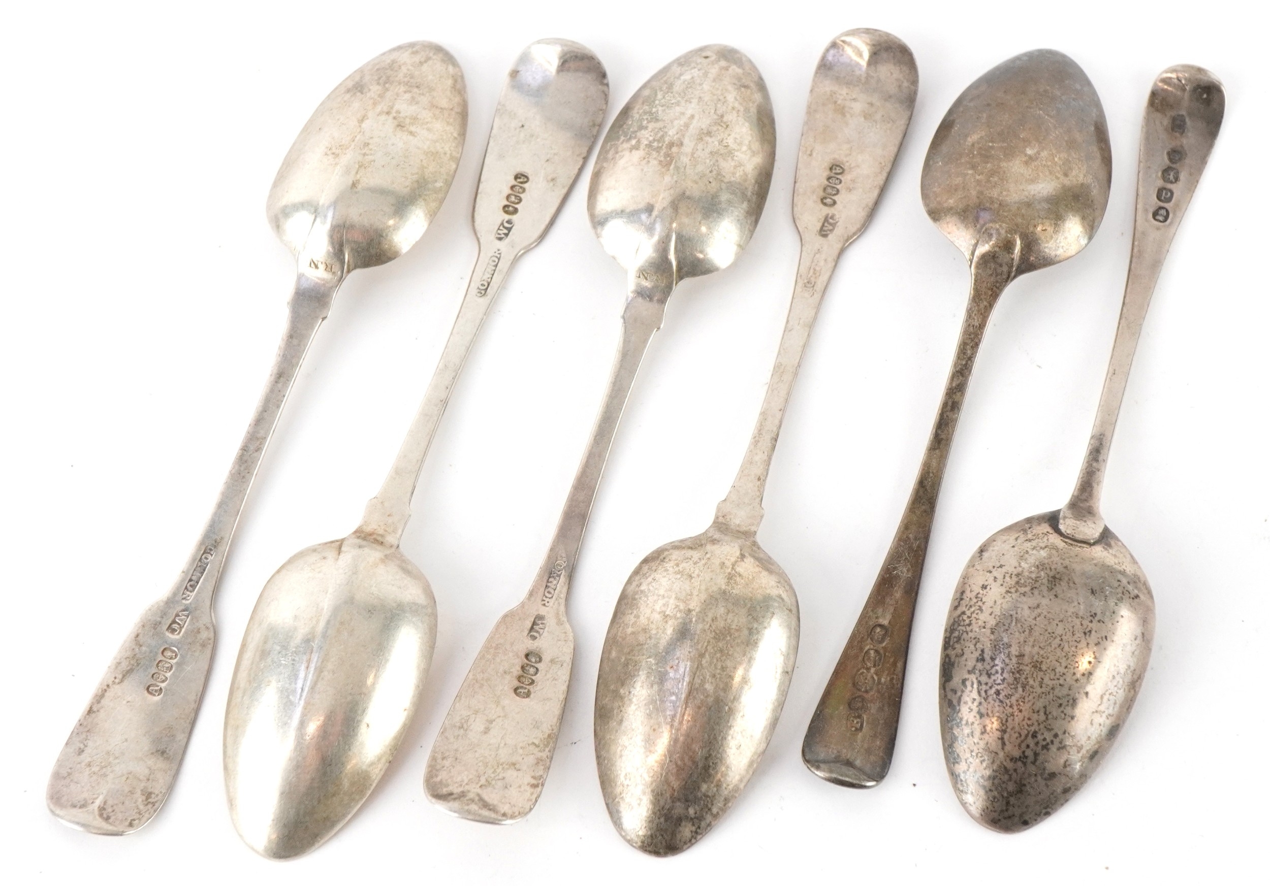 George IV and later silver teaspoons, mostly by William Cummins, the largest 15cm in length, total 101.0g.