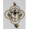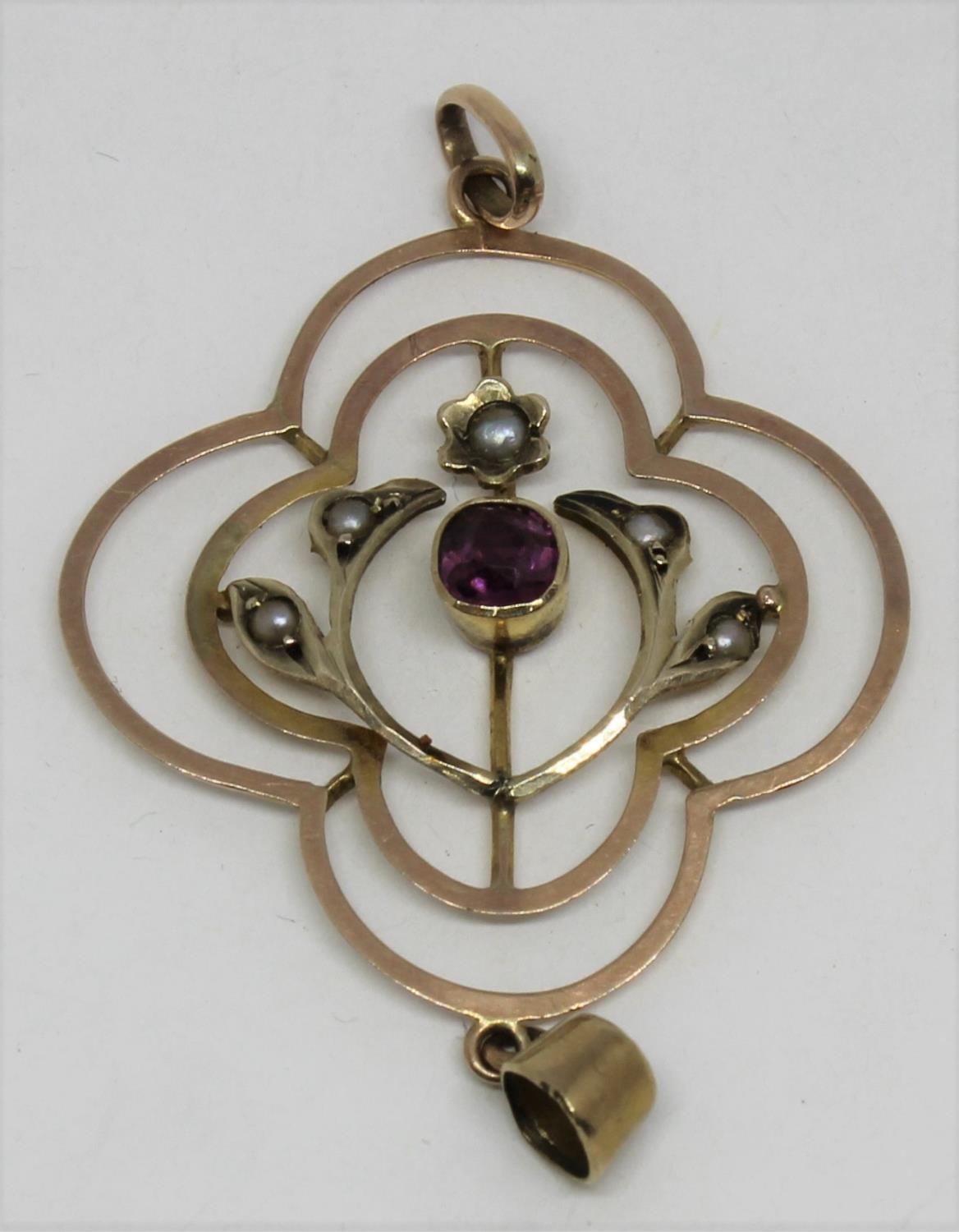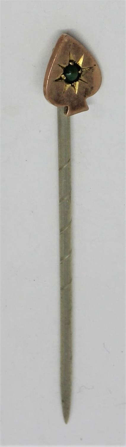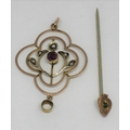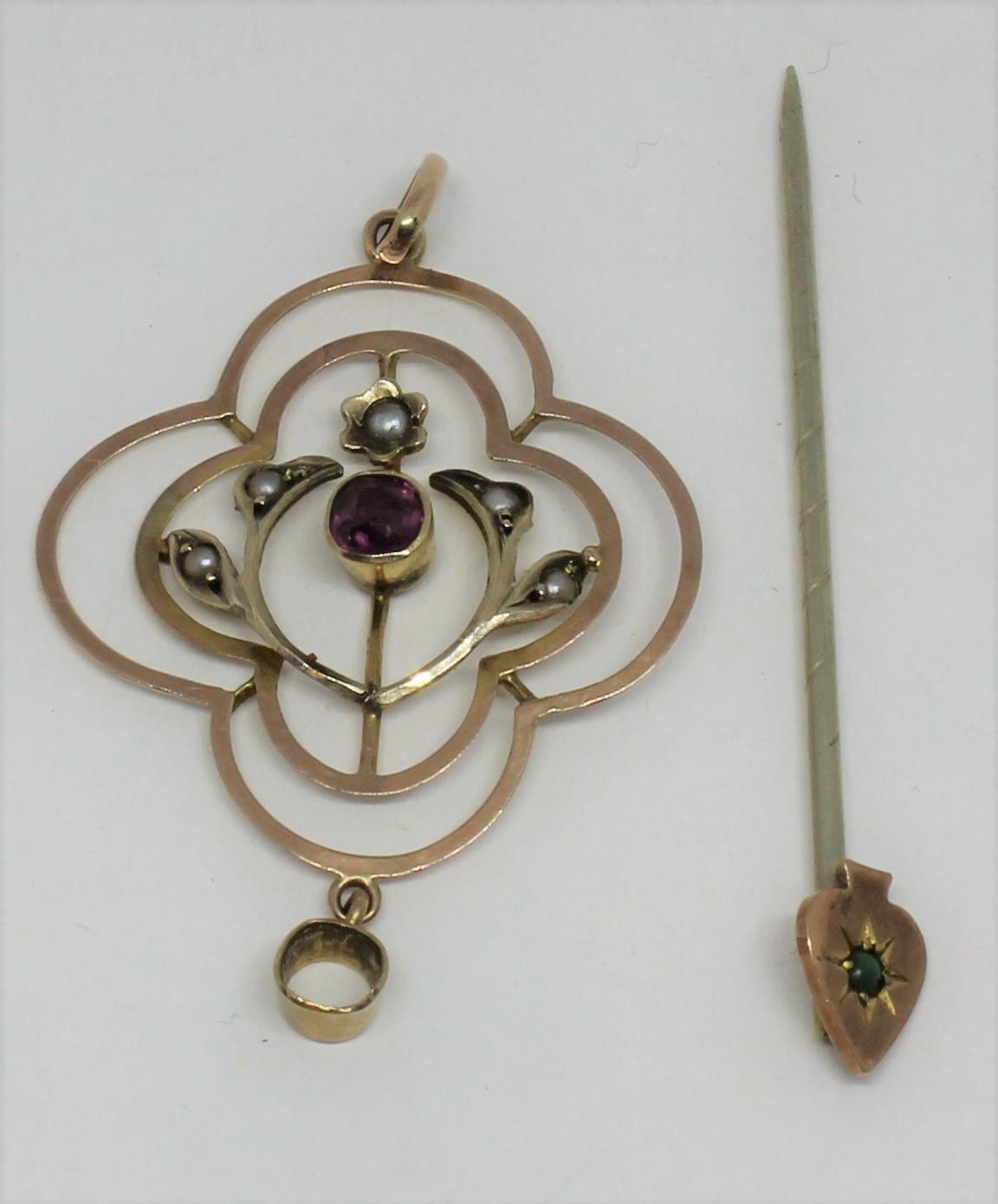 2 COLOUR GOLD PENDANT SET PEARLS AND PRECIOUS STONES - MARKED 9ct (1.7g) AND HAT PIN SET SINGLE GREEN STONE - MARKED 9ct (0.9g)