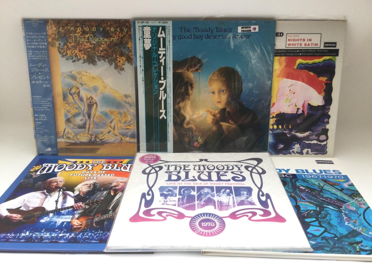 Six Moody Blues LPs comprising 180g pressings including Japanese pressings of 'Every Good Boy Deserves Favour' and 'The Present', a coloured vinyl 'Live At The Isle Of Wight Festival 1970' and others.